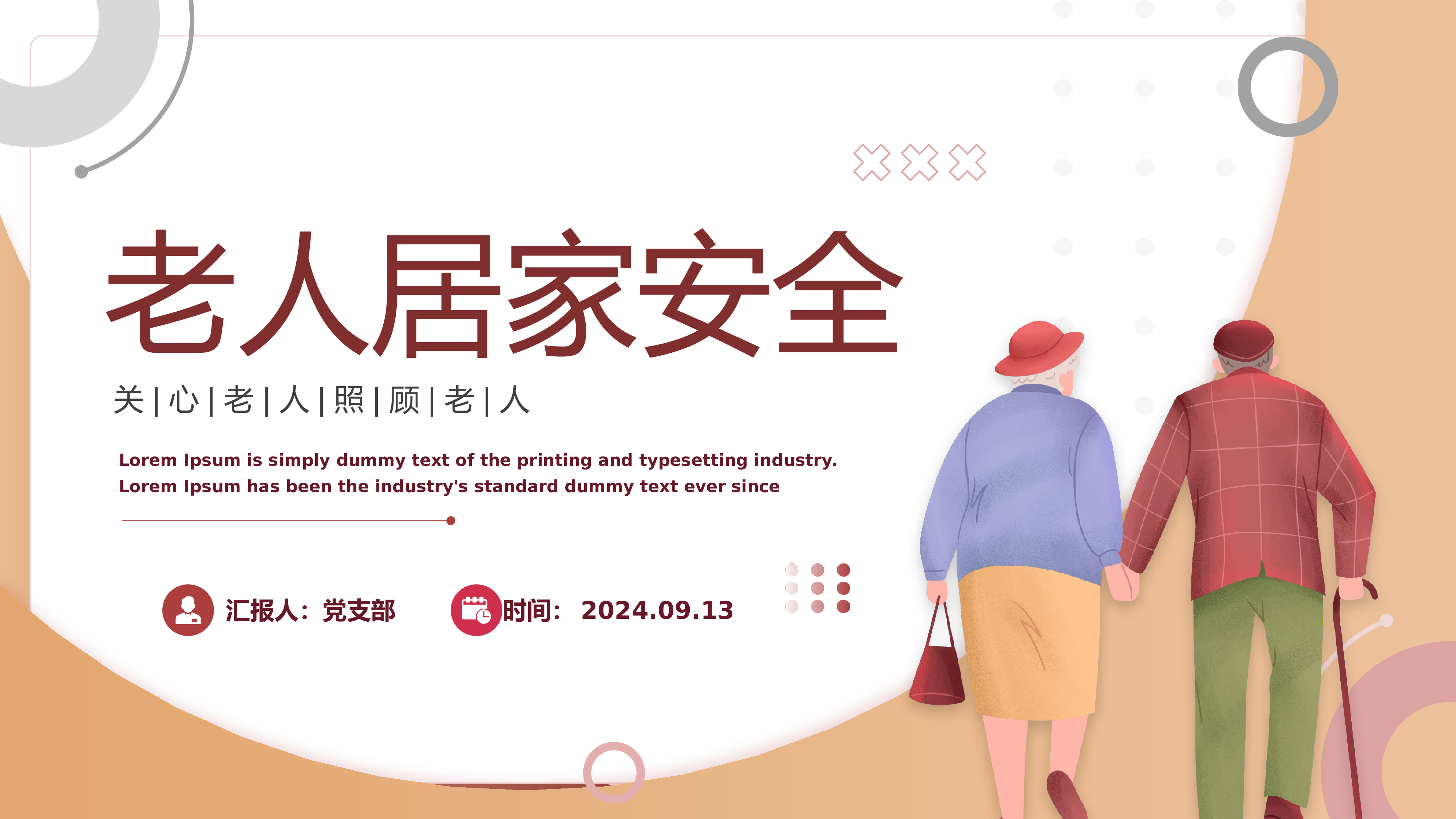 老人居家安全汇报人:党支部时间:2024.09.13LoremIpsumissimplydummytextoftheprintingandtypesettingindustry.LoremIpsumhasbeentheindustry'sstandarddummytexteversince关|心|老|人|照|顾|老|人前言老年人最常在家里活动,但是统计显示,最常产生跌倒等事故伤害地点,就是在家中。跌倒除了常见的擦伤、瘀伤,老年人跌倒更容易产生骨折,尤其髋骨骨折者不只造成行动不便,久卧在床可能出现褥疮,一旦感染细菌,便容易引发败血症,因此患者一年后的死亡率,更高达二成至三成。CONTE...