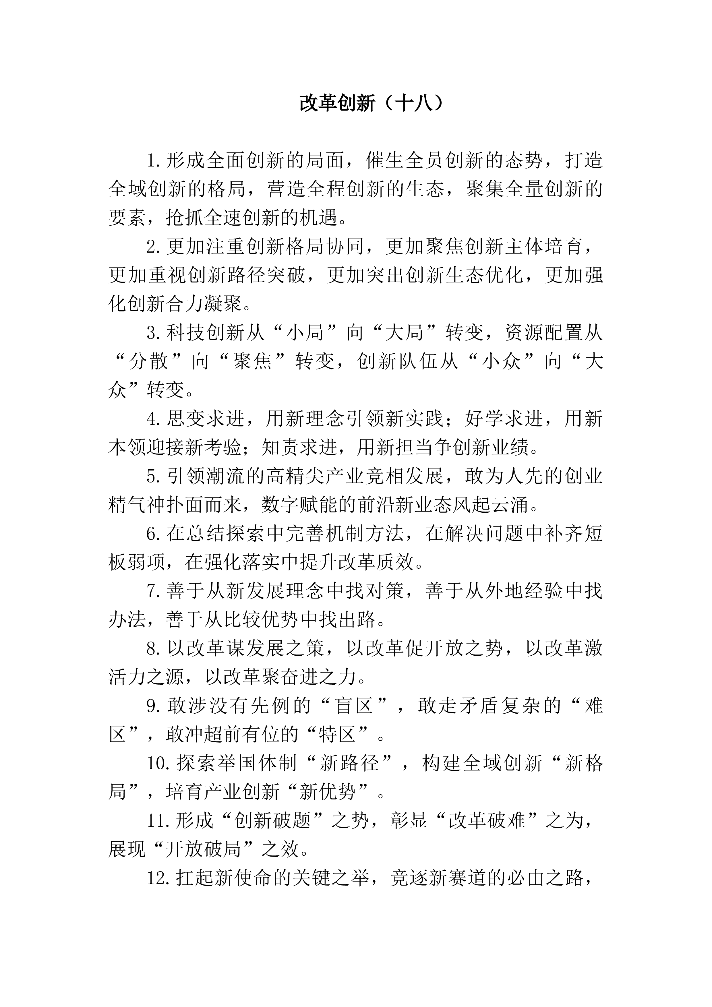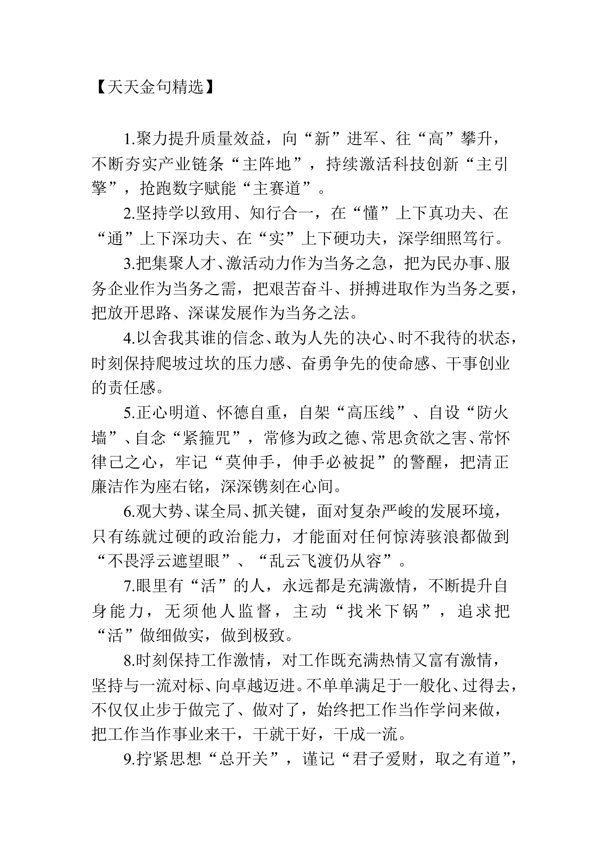 1.坚持以文化人、建设精神文明新高地,坚持以文惠民、促进文化事业新繁荣,坚持以文兴业、推动文化产业新发展,坚持以文塑城、焕发城市发展新活力。2.经济总量迈上新台阶,产业体量实现新突破,招引增量培育新优势,市场主体激发新活力,科技创新催生新成果,发展质量实现新提升。3.从全球格局演变中寻找新机遇,从区域发展动态中把握新定位,从科技变革趋势中抢抓新赛道,从产业革命前沿中谋求新突破。4.将“敢”的精神融入到勇担新使命上,将“敢”的劲头集中到发展新气象上,将“敢”的成果惠及到群众新期盼上。5.产业规模迈上新台阶,集群生态形成新格局,创新能力得到新提升,融合发展取得新进展,绿色转型实现新突破。6.政治忠...