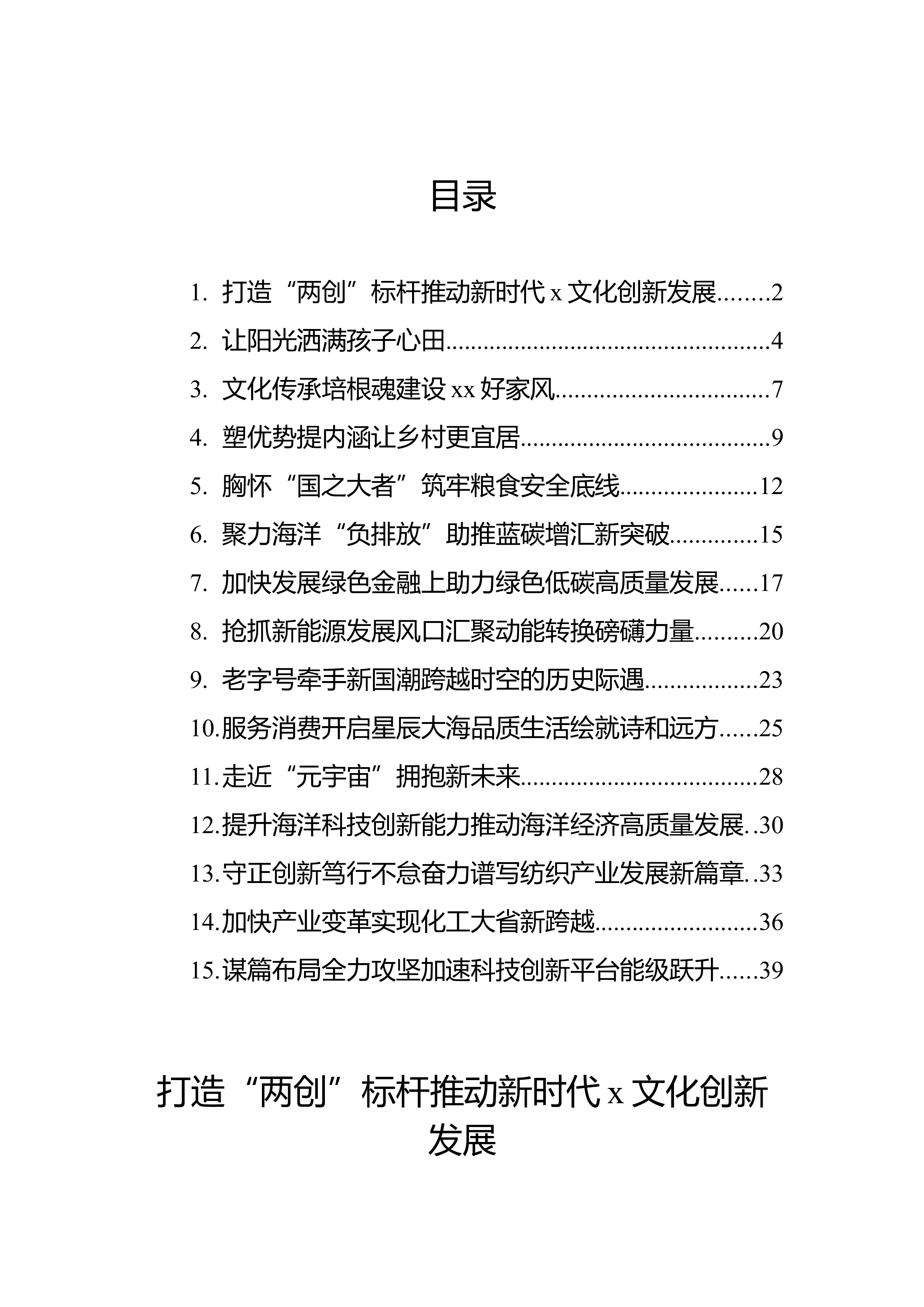 目录1.打造“两创”标杆推动新时代x文化创新发展........22.让阳光洒满孩子心田....................................................43.文化传承培根魂建设xx好家风..................................74.塑优势提内涵让乡村更宜居........................................95.胸怀“国之大者”筑牢粮食安全底线......................126.聚力海洋“负排放”助推蓝碳增汇新突破..............157.加快发展绿色金融上助力绿色低碳高质...