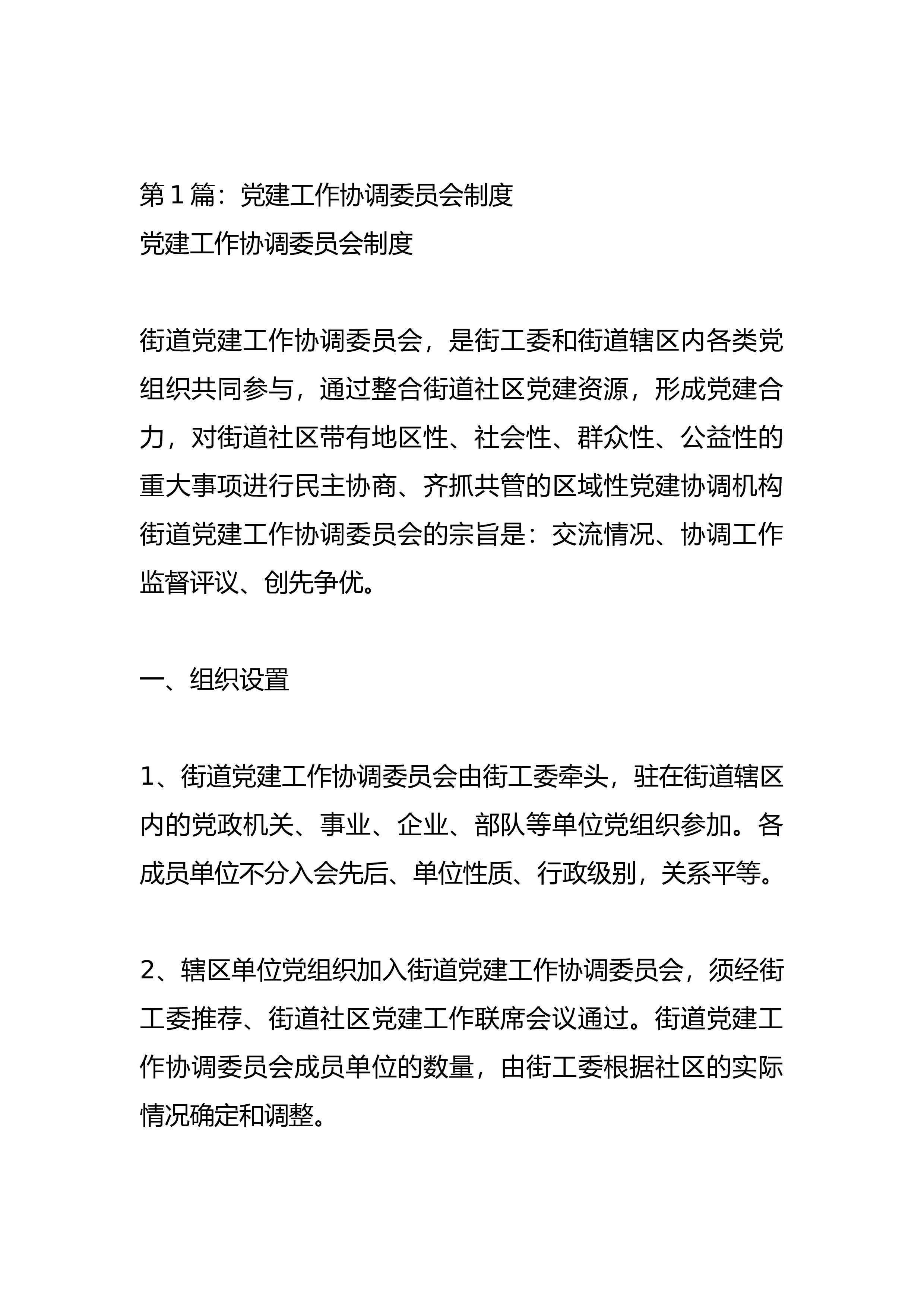 第1篇:党建工作协调委员会制度党建工作协调委员会制度街道党建工作协调委员会,是街工委和街道辖区内各类党组织共同参与,通过整合街道社区党建资源,形成党建合力,对街道社区带有地区性、社会性、群众性、公益性的重大事项进行民主协商、齐抓共管的区域性党建协调机构街道党建工作协调委员会的宗旨是:交流情况、协调工作监督评议、创先争优。一、组织设置1、街道党建工作协调委员会由街工委牵头,驻在街道辖区内的党政机关、事业、企业、部队等单位党组织参加。各成员单位不分入会先后、单位性质、行政级别,关系平等。2、辖区单位党组织加入街道党建工作协调委员会,须经街工委推荐、街道社区党建工作联席会议通过。街道党建工作协调委员...