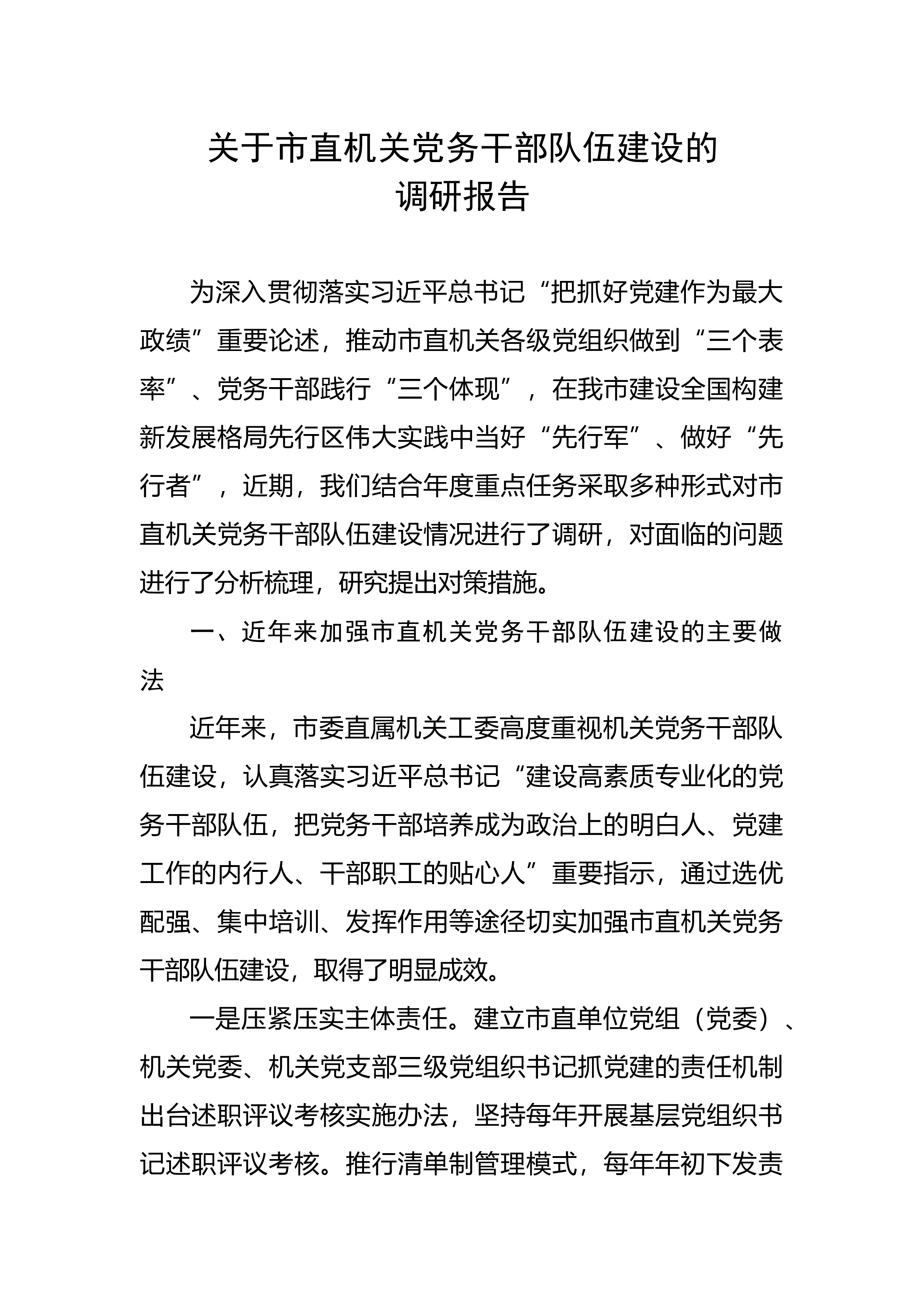 关于市直机关党务干部队伍建设的调研报告为深入贯彻落实习近平总书记“把抓好党建作为最大政绩”重要论述,推动市直机关各级党组织做到“三个表率”、党务干部践行“三个体现”,在我市建设全国构建新发展格局先行区伟大实践中当好“先行军”、做好“先行者”,近期,我们结合年度重点任务采取多种形式对市直机关党务干部队伍建设情况进行了调研,对面临的问题进行了分析梳理,研究提出对策措施。一、近年来加强市直机关党务干部队伍建设的主要做法近年来,市委直属机关工委高度重视机关党务干部队伍建设,认真落实习近平总书记“建设高素质专业化的党务干部队伍,把党务干部培养成为政治上的明白人、党建工作的内行人、干部职工的贴心人”重要指...
