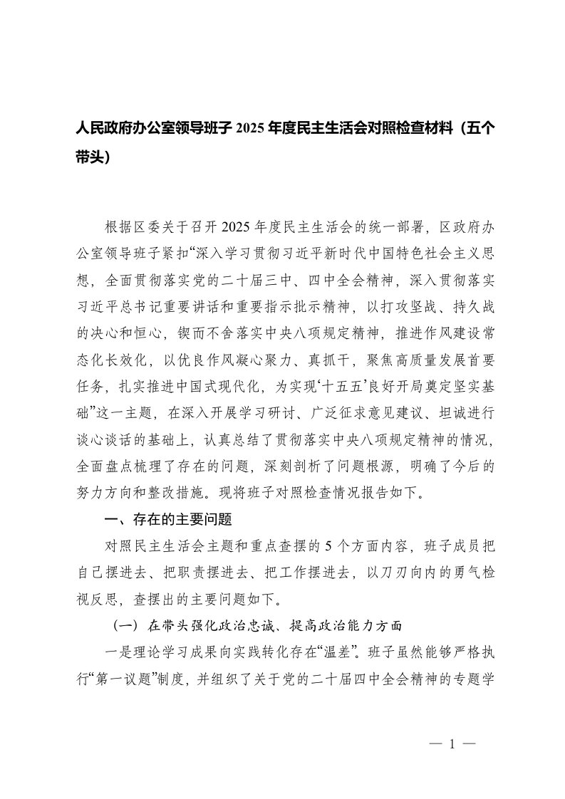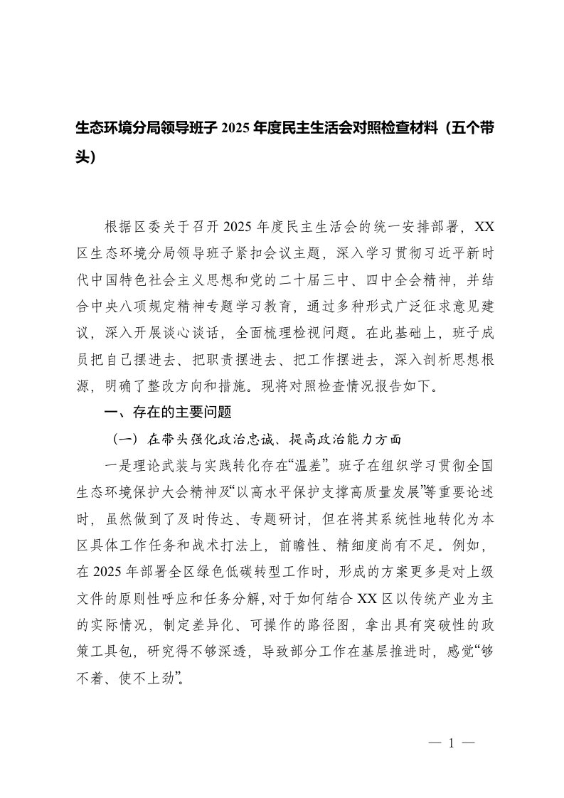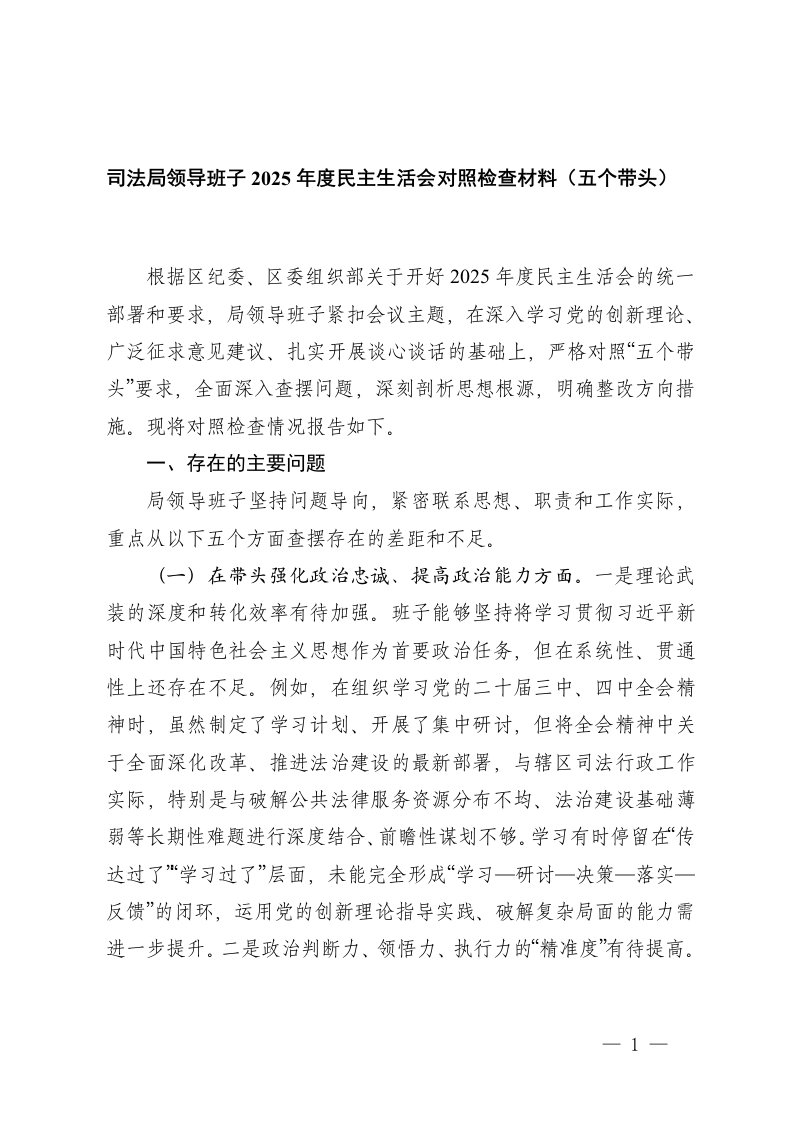 2025年度民主生活会对照检查材料五个带头民主生活会,对照检查材料,对照检查,五个带头,