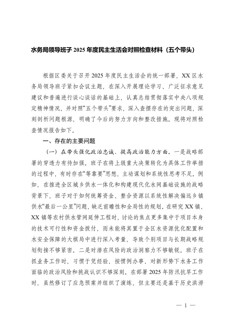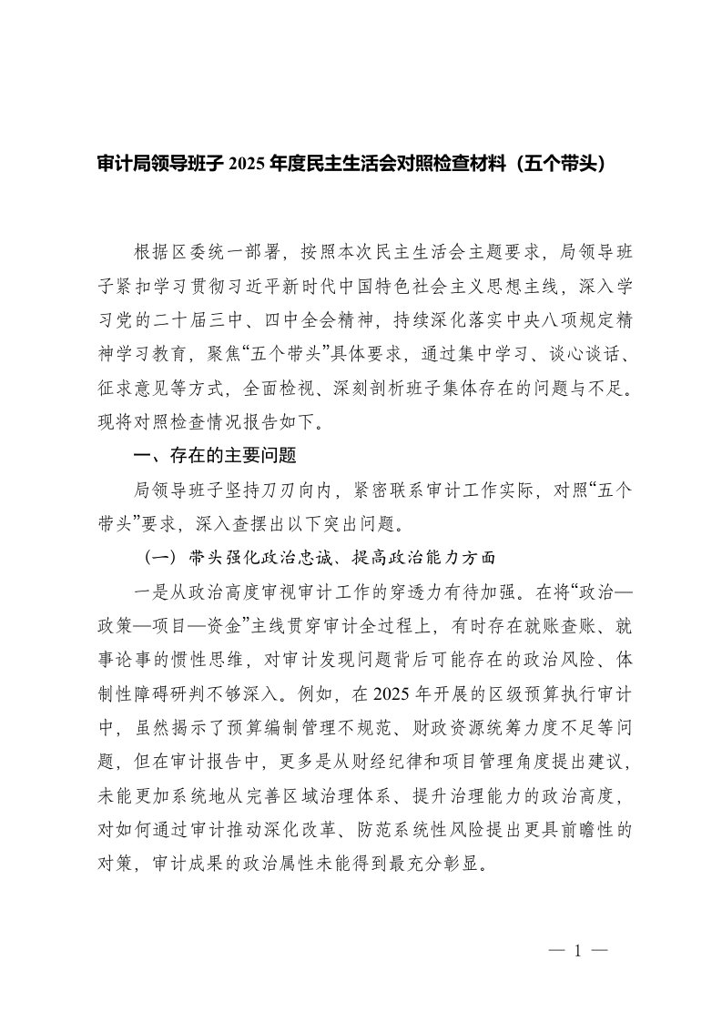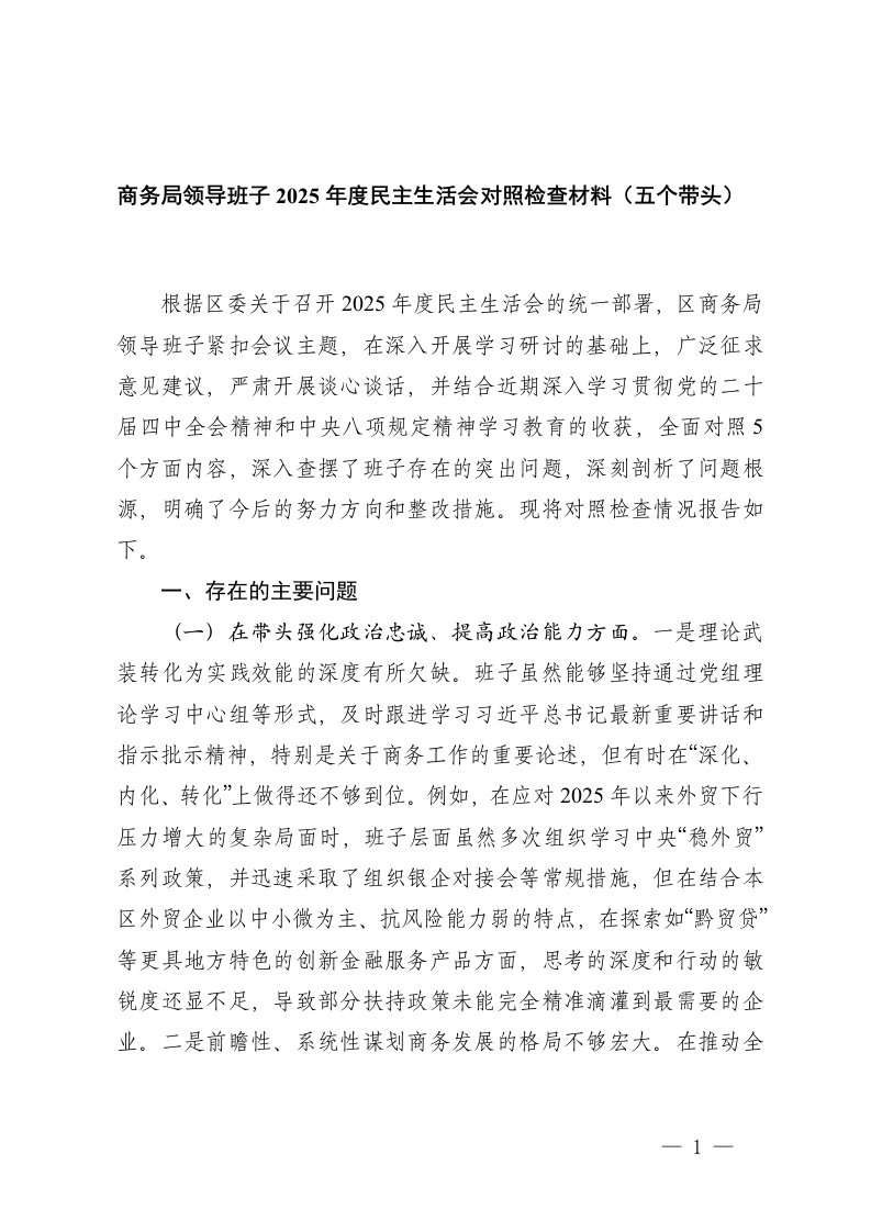 2025年度民主生活会对照检查材料五个带头