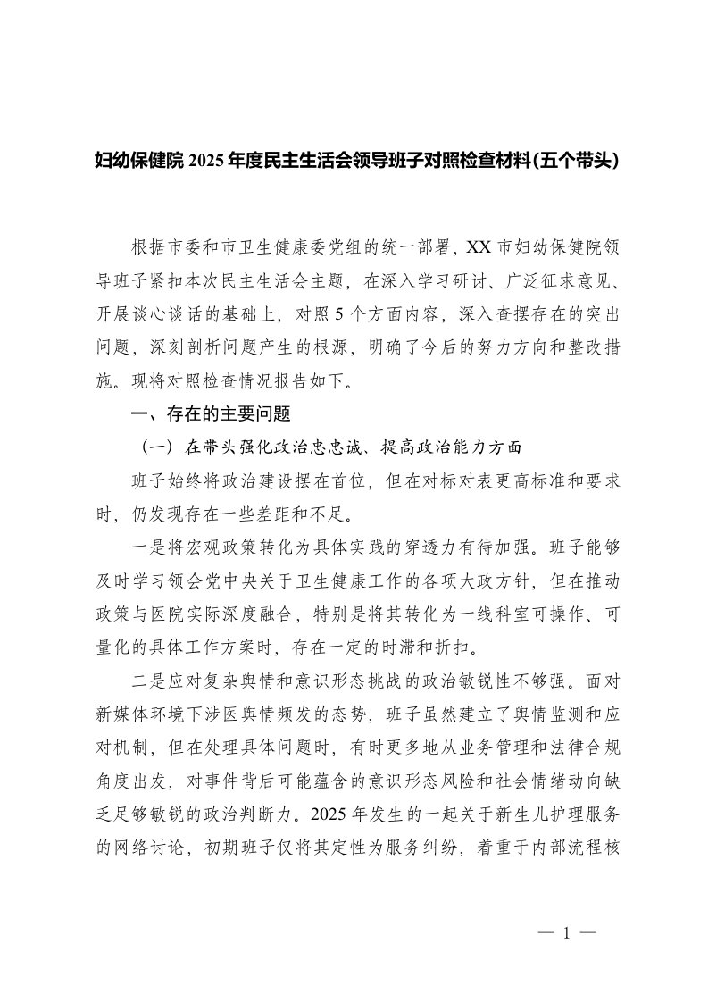 ,生活,材料市妇幼保健院2025年度民主生活会