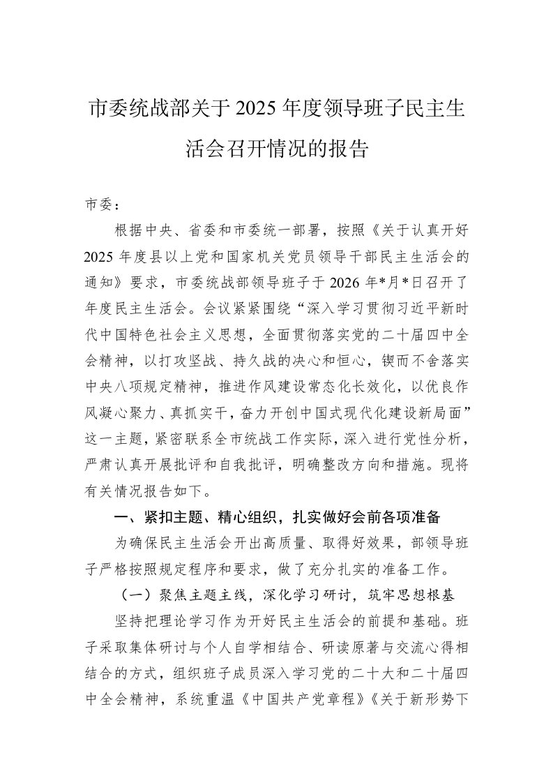 民主生活会召开情况的报告民主生活会,报告,统战,
