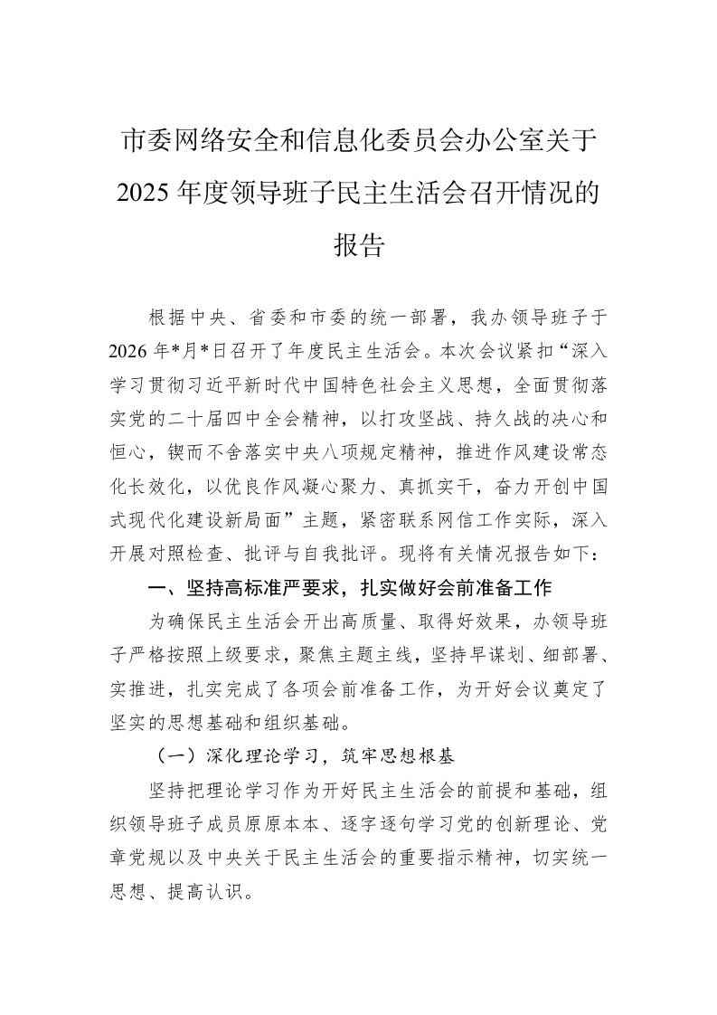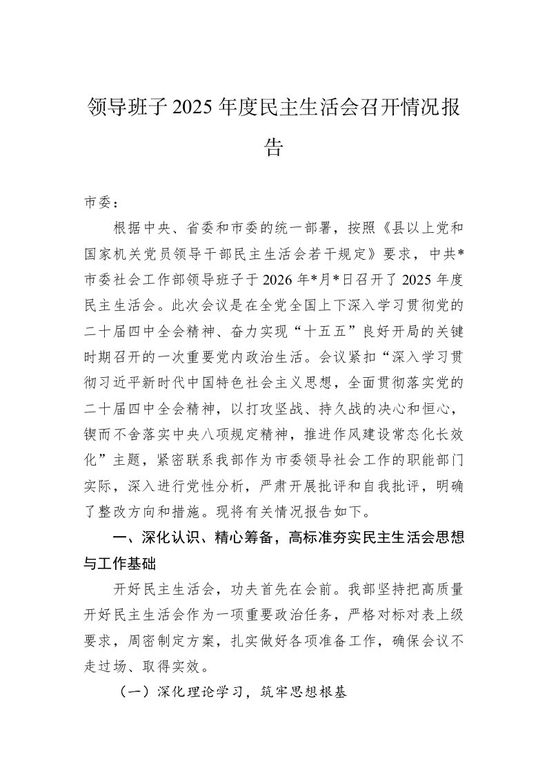 2025年度民主生活会召开情况报告民主生活会,情况报告,报告,