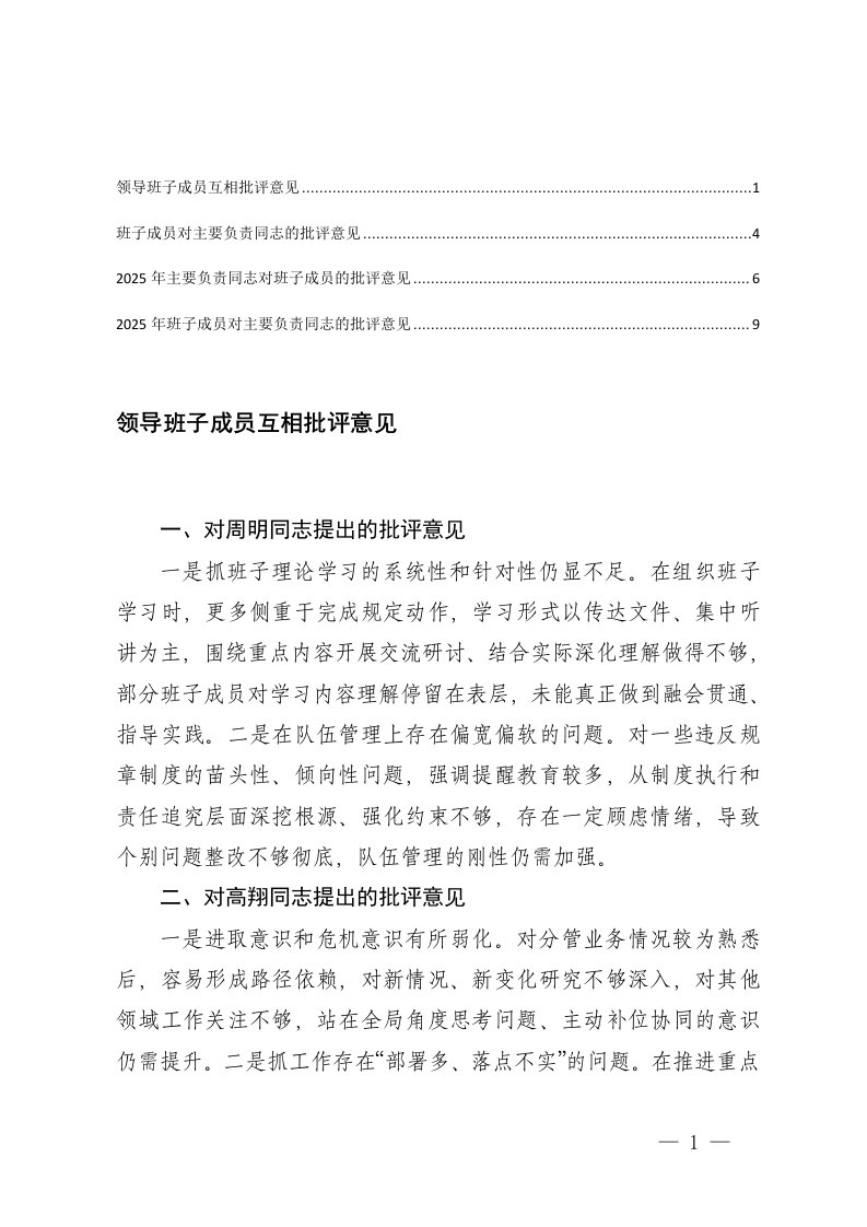 成员互相批评意见班子成员对主要负责同志的批评意见主要负责同志对班子成员的批评意见班子成员对主要负责同志的批评意见汇编