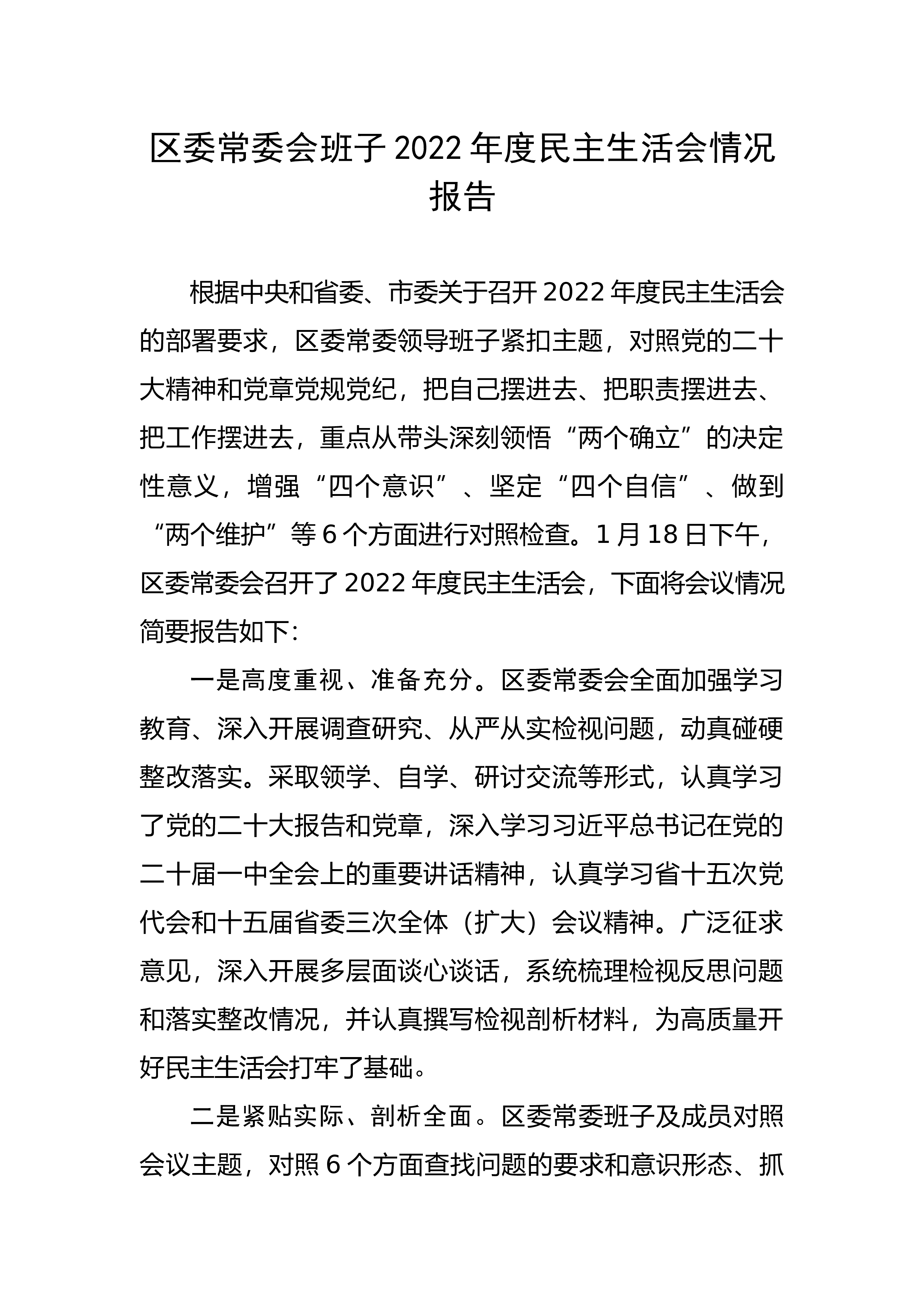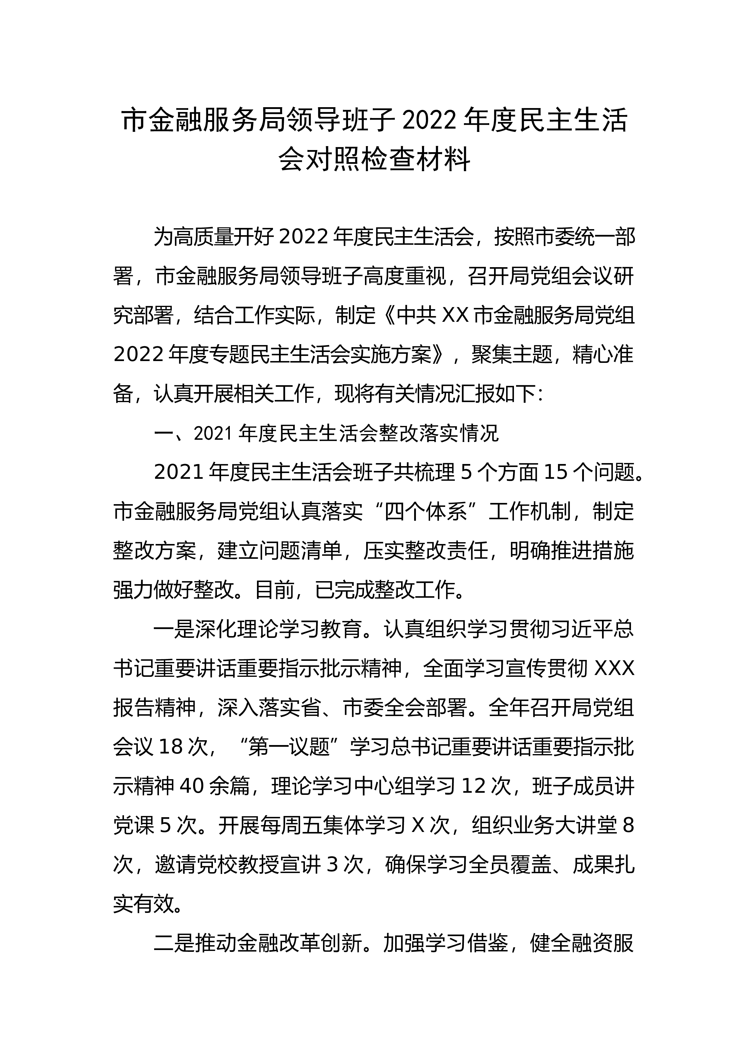 市金融服务局领导班子2022年度民主生活会对照检查材料为高质量开好2022年度民主生活会,按照市委统一部署,市金融服务局领导班子高度重视,召开局党组会议研究部署,结合工作实际,制定《中共XX市金融服务局党组2022年度专题民主生活会实施方案》,聚集主题,精心准备,认真开展相关工作,现将有关情况汇报如下:一、2021年度民主生活会整改落实情况2021年度民主生活会班子共梳理5个方面15个问题。市金融服务局党组认真落实“四个体系”工作机制,制定整改方案,建立问题清单,压实整改责任,明确推进措施强力做好整改。目前,已完成整改工作。一是深化理论学习教育。认真组织学习贯彻习近平总书记重要讲话重要指示批示...