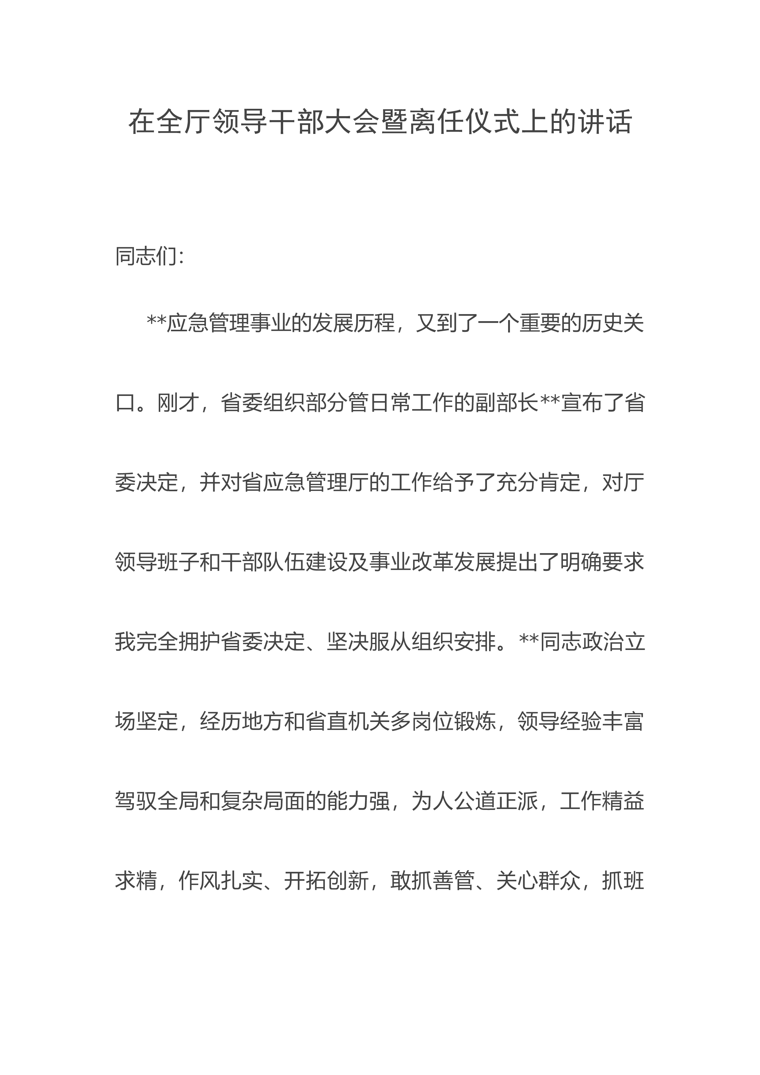 在全厅领导干部大会暨离任仪式上的讲话同志们:**应急管理事业的发展历程,又到了一个重要的历史关口。刚才,省委组织部分管日常工作的副部长**宣布了省委决定,并对省应急管理厅的工作给予了充分肯定,对厅领导班子和干部队伍建设及事业改革发展提出了明确要求我完全拥护省委决定、坚决服从组织安排。**同志政治立场坚定,经历地方和省直机关多岗位锻炼,领导经验丰富驾驭全局和复杂局面的能力强,为人公道正派,工作精益求精,作风扎实、开拓创新,敢抓善管、关心群众,抓班子、带队伍、促落实的能力强。我相信,在省委、省政府的坚强领导下,在以**同志为班长的新一届党委班子带领下,全厅全系统一定能够在新的起点上把**应急管理事...