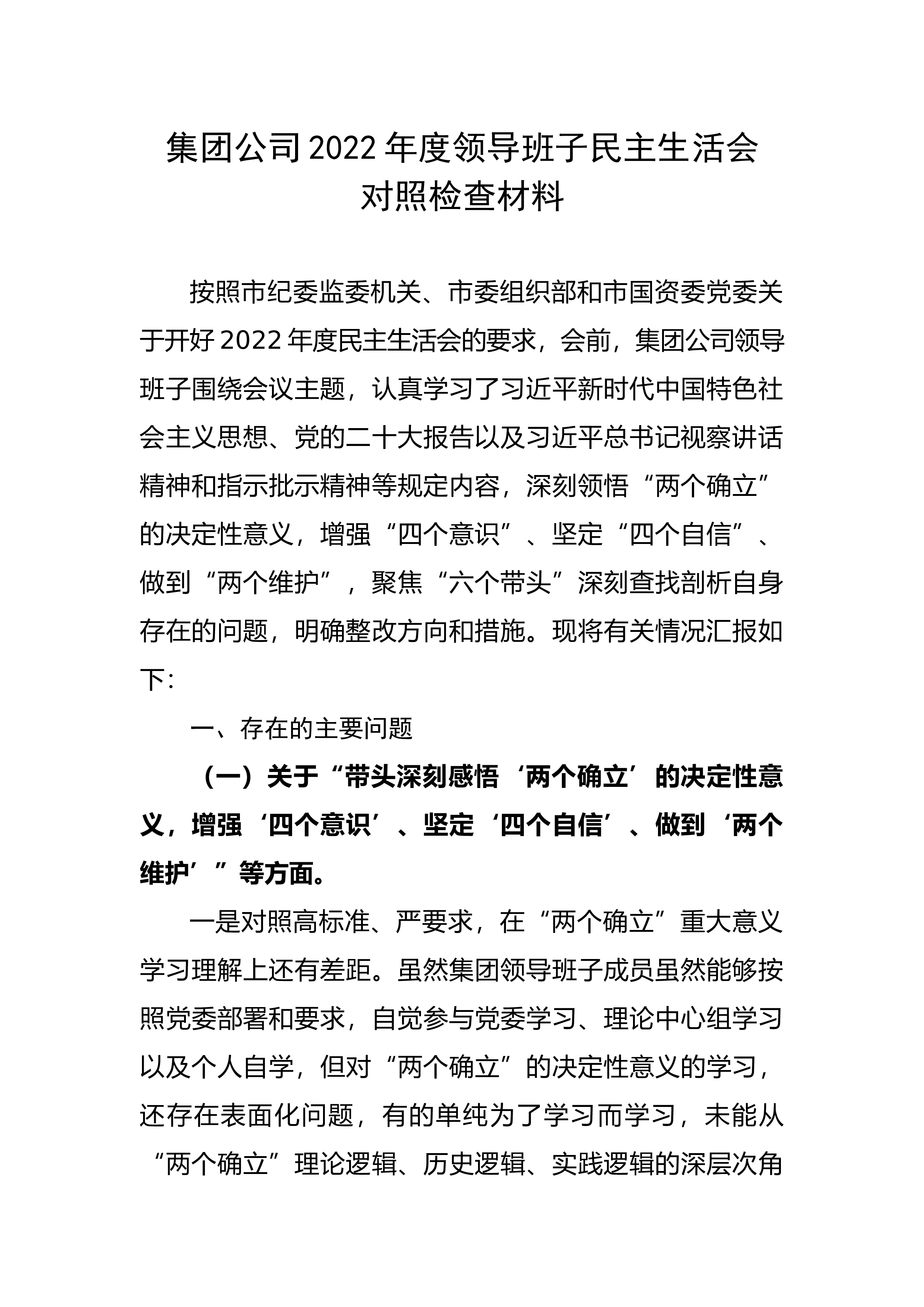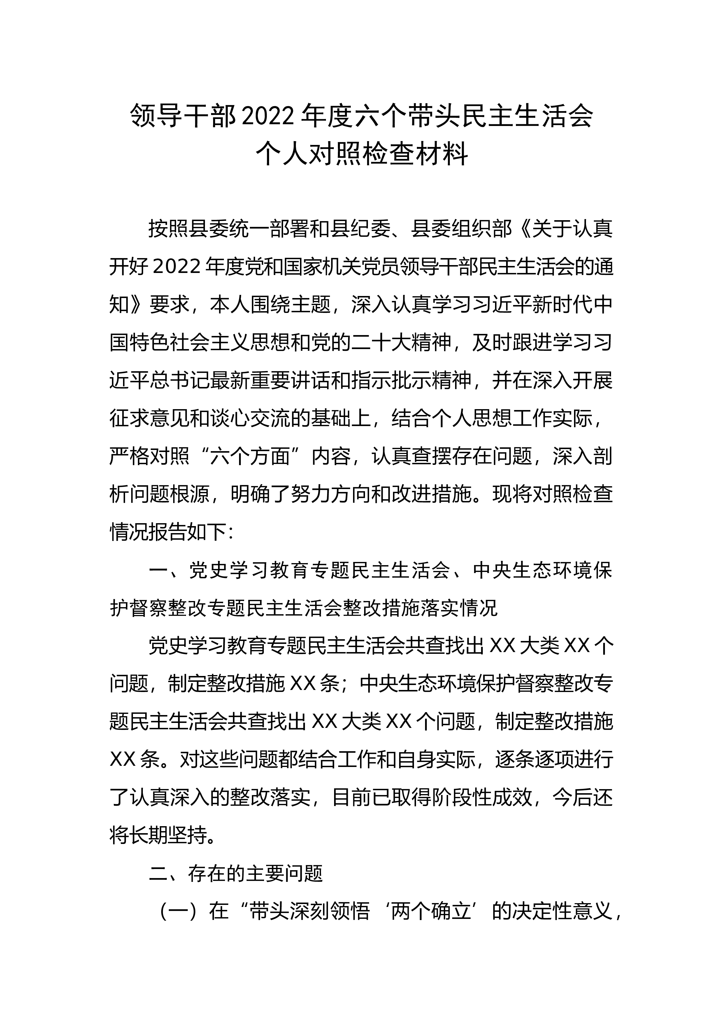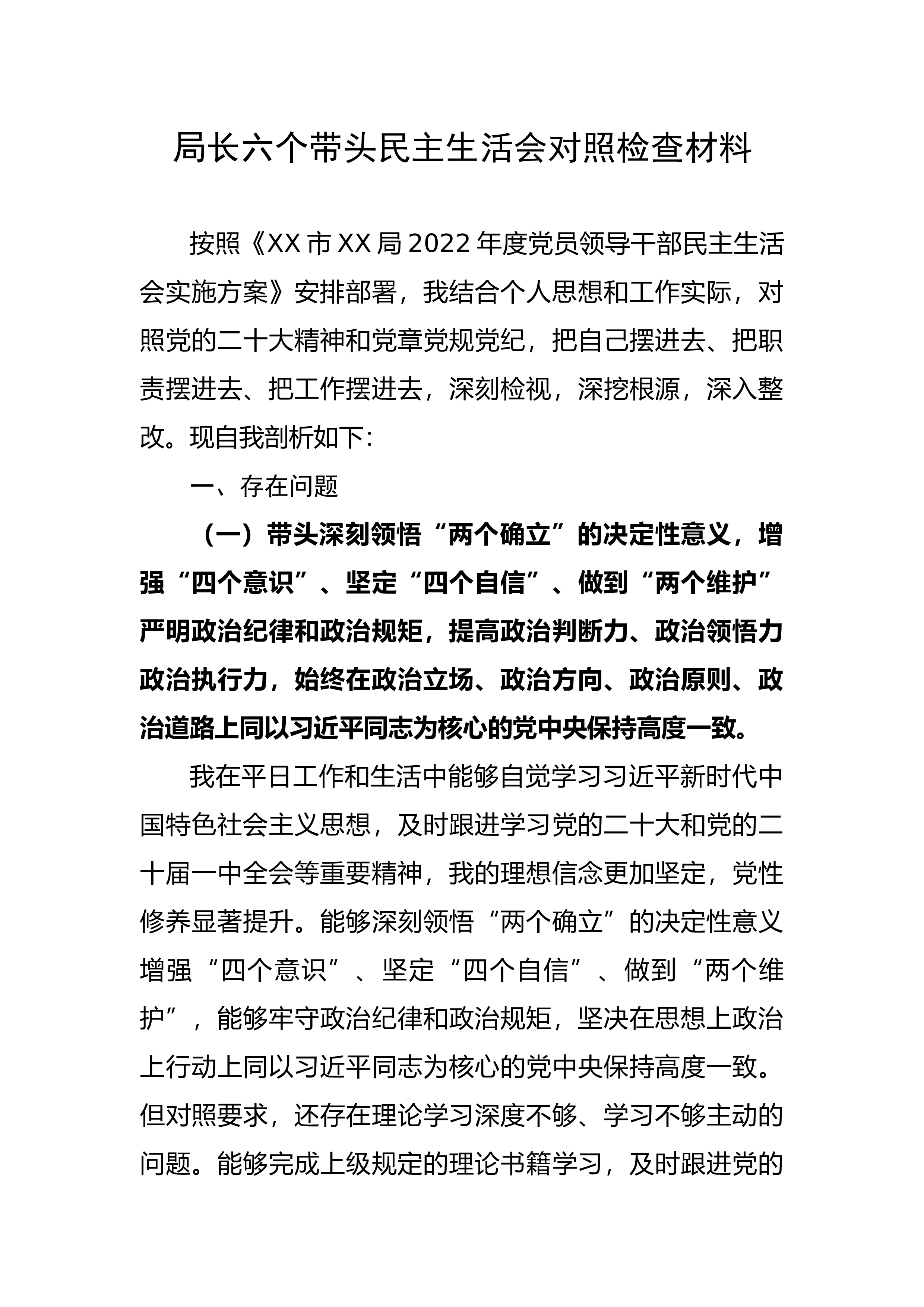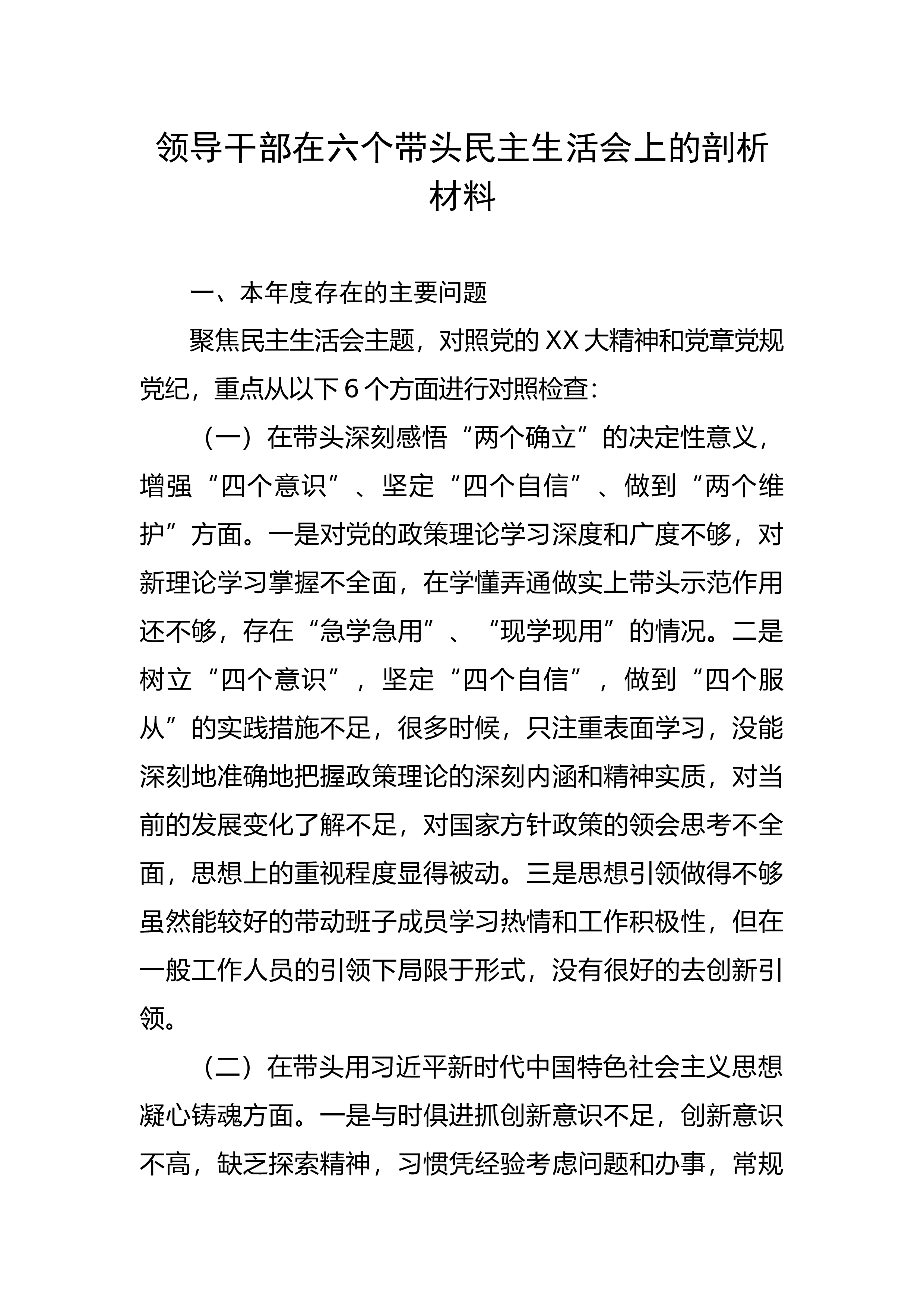 区组织部长六个带头民主生活会剖析材料根据区纪委、区委组织部《关于开好2022年度民主生活会的通知》要求,在开展学习教育、广泛征求意见建议谈心谈话的基础上,认真对照“六个方面”进行了深刻查摆检视,剖析了问题根源,明确了整改措施和方向。现将对照检查情况汇报如下:一、存在的主要问题(一)带头深刻领悟“两个确立”的决定性意义,增强“四个意识”、坚定“四个自信”、做到“两个维护”方面存在问题:一是认识领悟不够深刻。尽管自己在政治上始终严格要求,在政治立场、政治方向、政治原则和政治道路上始终与党中央保持高度一致,也经常参加各种培训和学习,但对“两个确立”的认识领悟还不够透彻、不够深入,存在“做”得非常坚决...