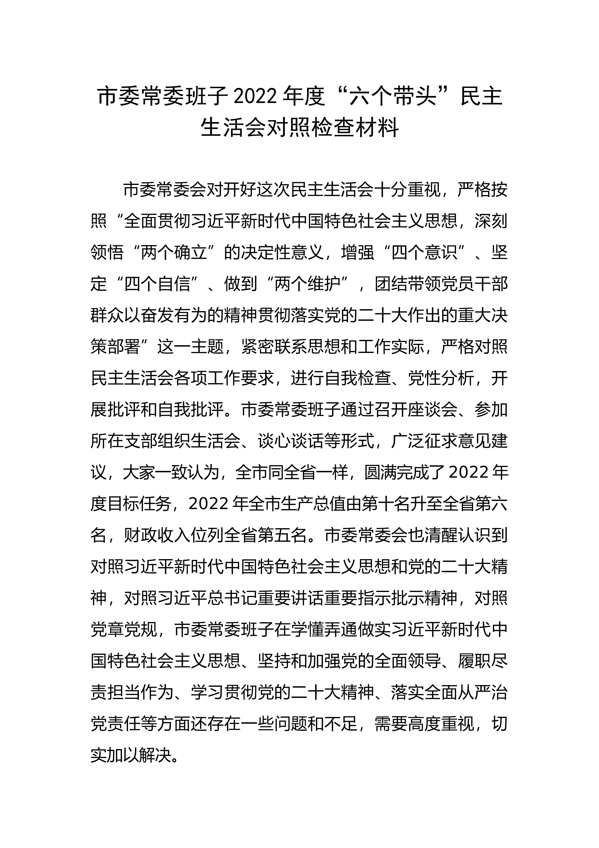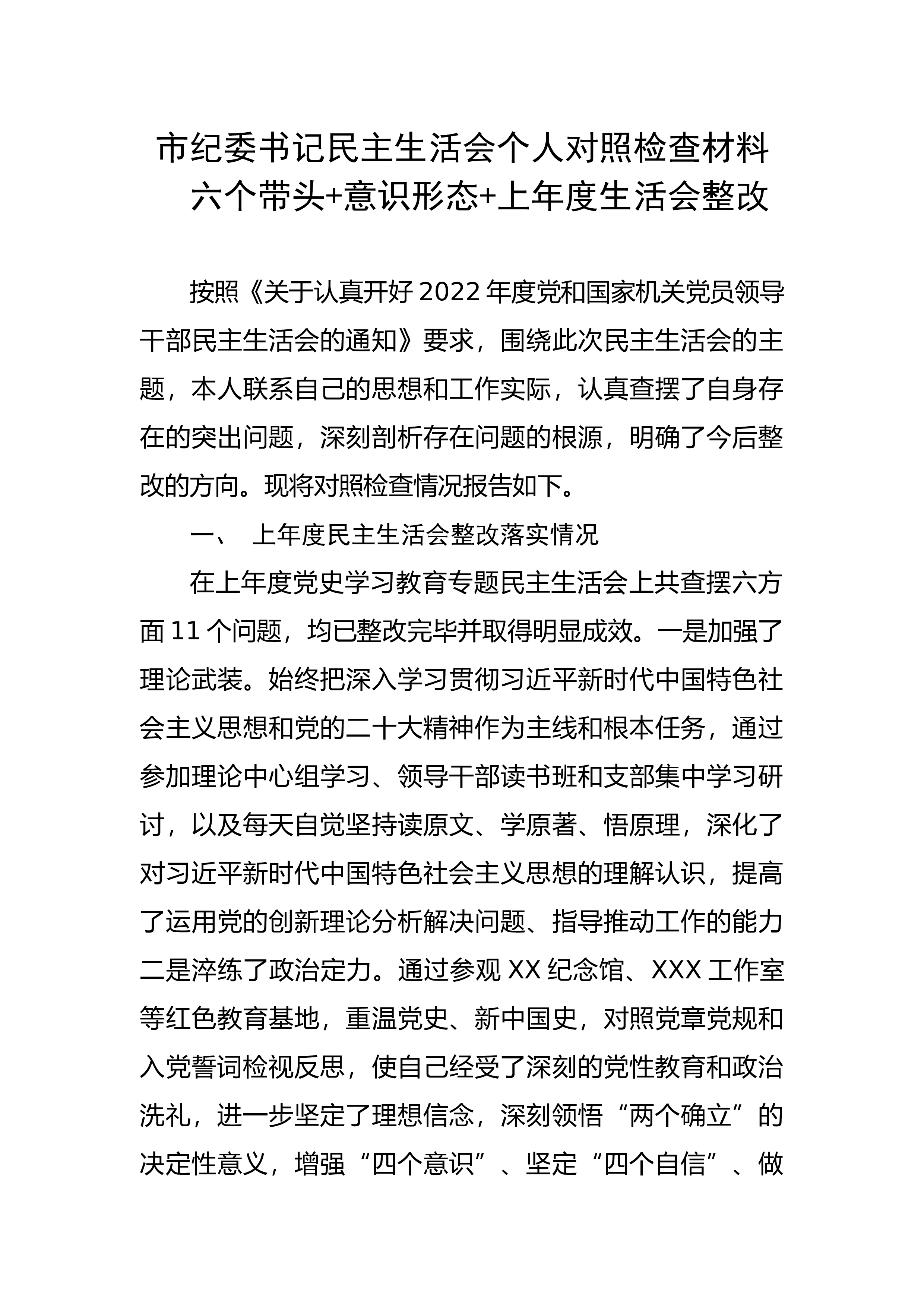 人武部长2022年度民主生活会发言提纲按照中央部署和省委、市委要求,本人在会前认真学习了习近平新时代中国特色社会主义思想、党的二十大精神等,参加了集中学习研讨,广泛征求了各方面的意见建议,深入开展了谈心谈话。逐一对照检查分析、系统检视剖析问题,在坚定共产主义理想信念、确保绝对忠诚纯洁可靠、端正聚焦备战打仗态度上有了进一步强化和提升,下面,我就结合个人学习、工作、生活情况,对照“六个带头”方面进行剖析。现对照检查情况报告如下:一、存在的主要问题(一)带头深刻领悟“两个确立”的决定性意义,增强“四个意识”、坚定“四个自信”、做到“两个维护”方面。突出表现在:一是对焦学思践悟,理论武装还欠火候。理论...