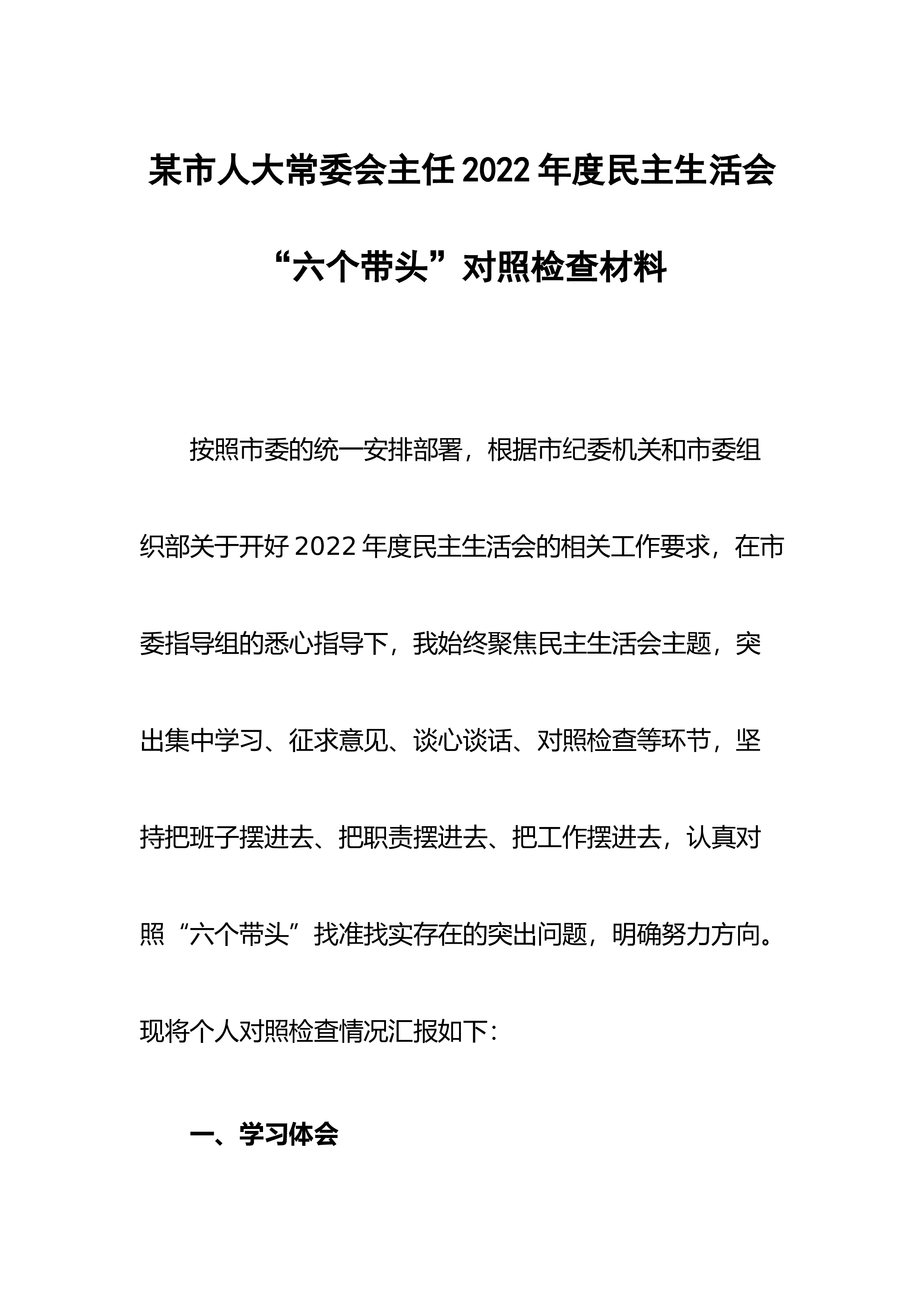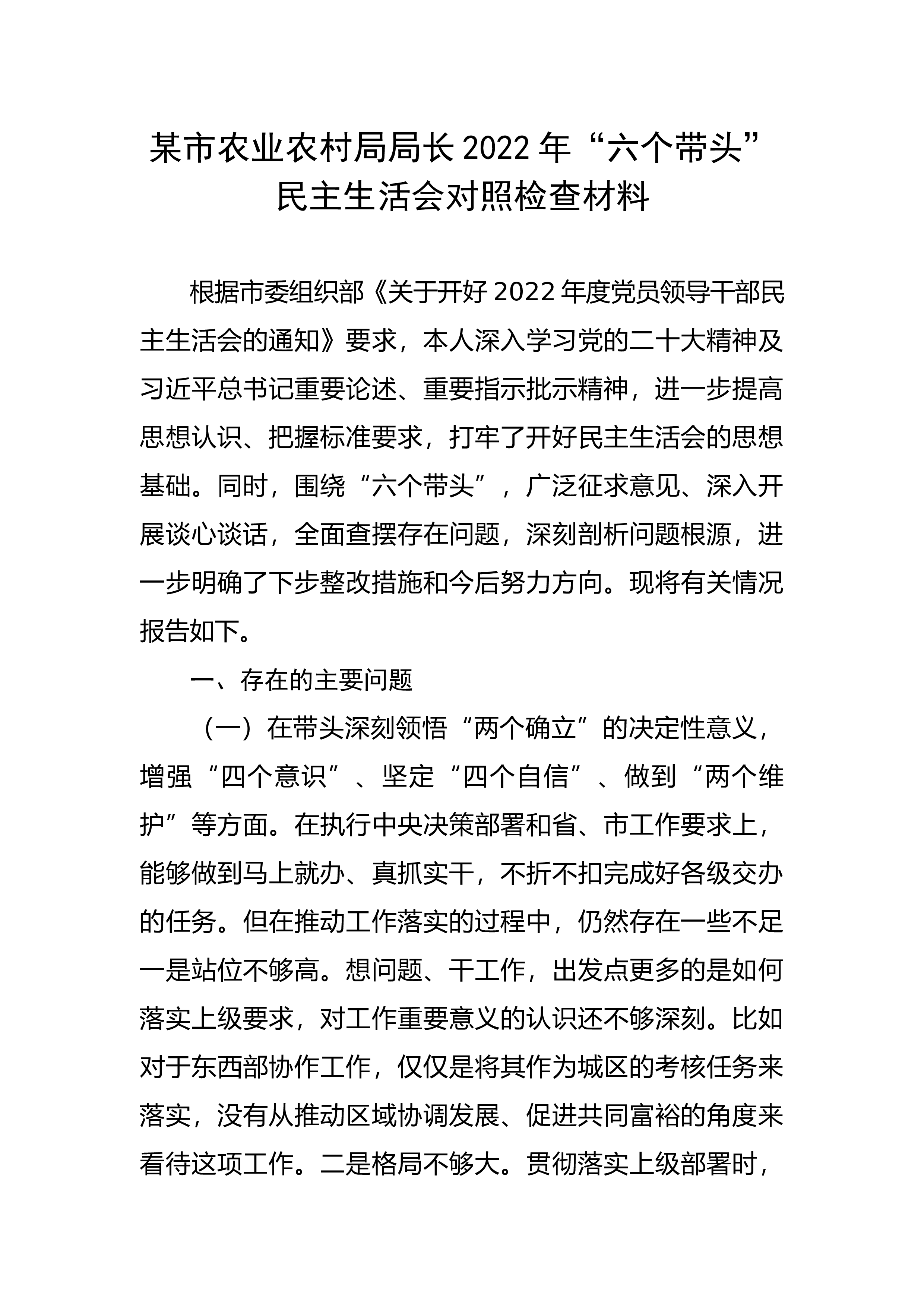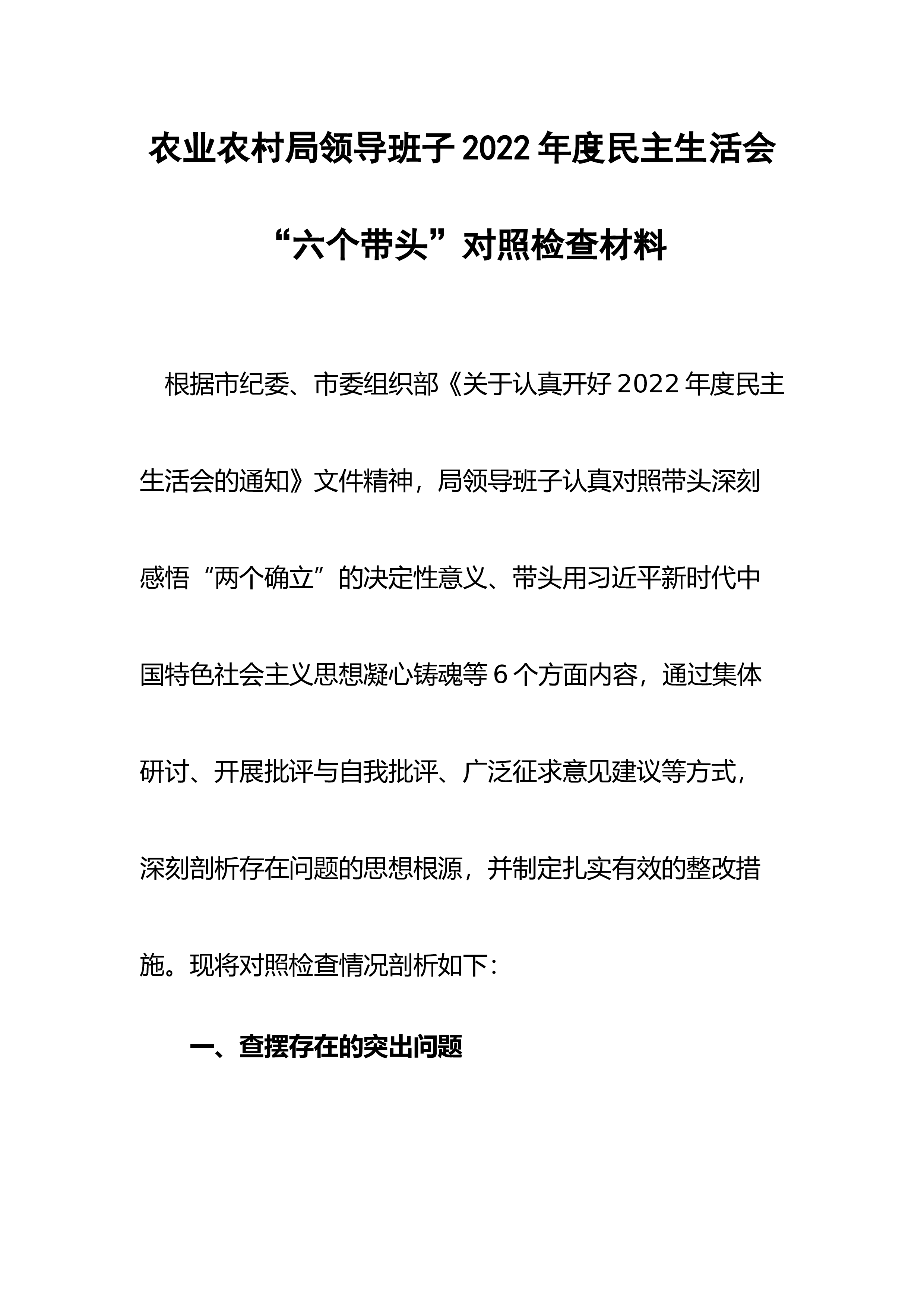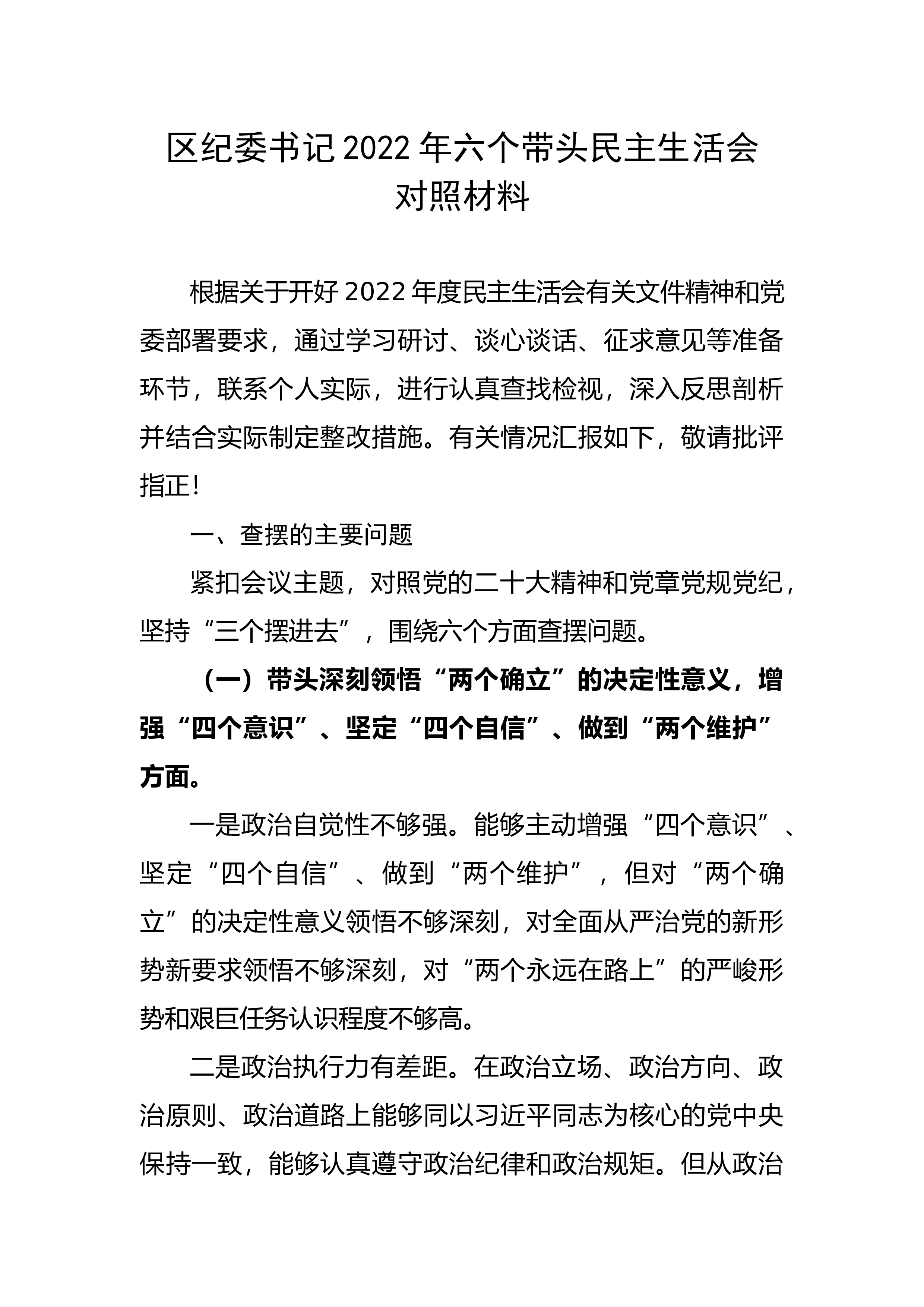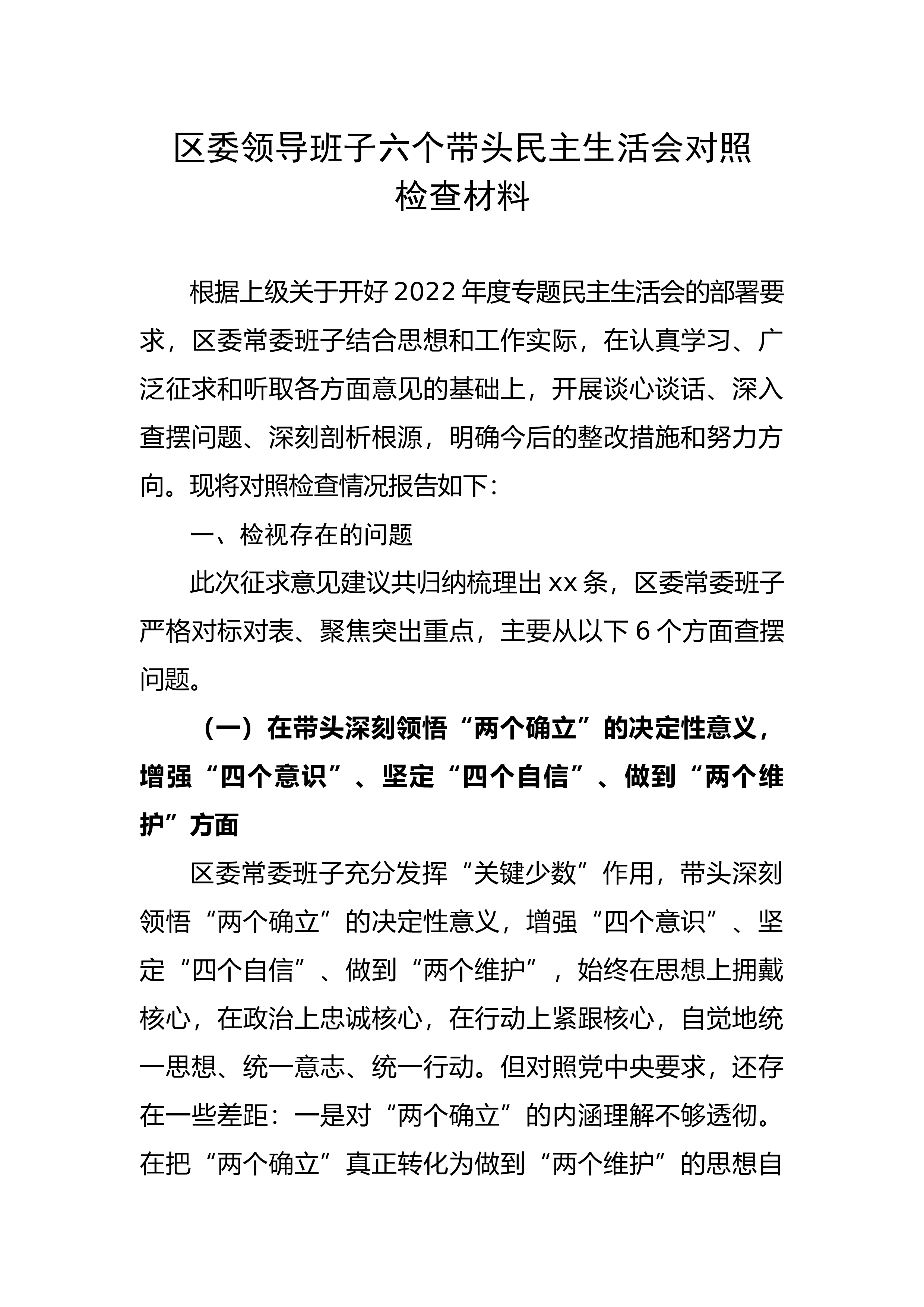区委领导班子六个带头民主生活会对照检查材料根据上级关于开好2022年度专题民主生活会的部署要求,区委常委班子结合思想和工作实际,在认真学习、广泛征求和听取各方面意见的基础上,开展谈心谈话、深入查摆问题、深刻剖析根源,明确今后的整改措施和努力方向。现将对照检查情况报告如下:一、检视存在的问题此次征求意见建议共归纳梳理出xx条,区委常委班子严格对标对表、聚焦突出重点,主要从以下6个方面查摆问题。(一)在带头深刻领悟“两个确立”的决定性意义,增强“四个意识”、坚定“四个自信”、做到“两个维护”方面区委常委班子充分发挥“关键少数”作用,带头深刻领悟“两个确立”的决定性意义,增强“四个意识”、坚定“四个...