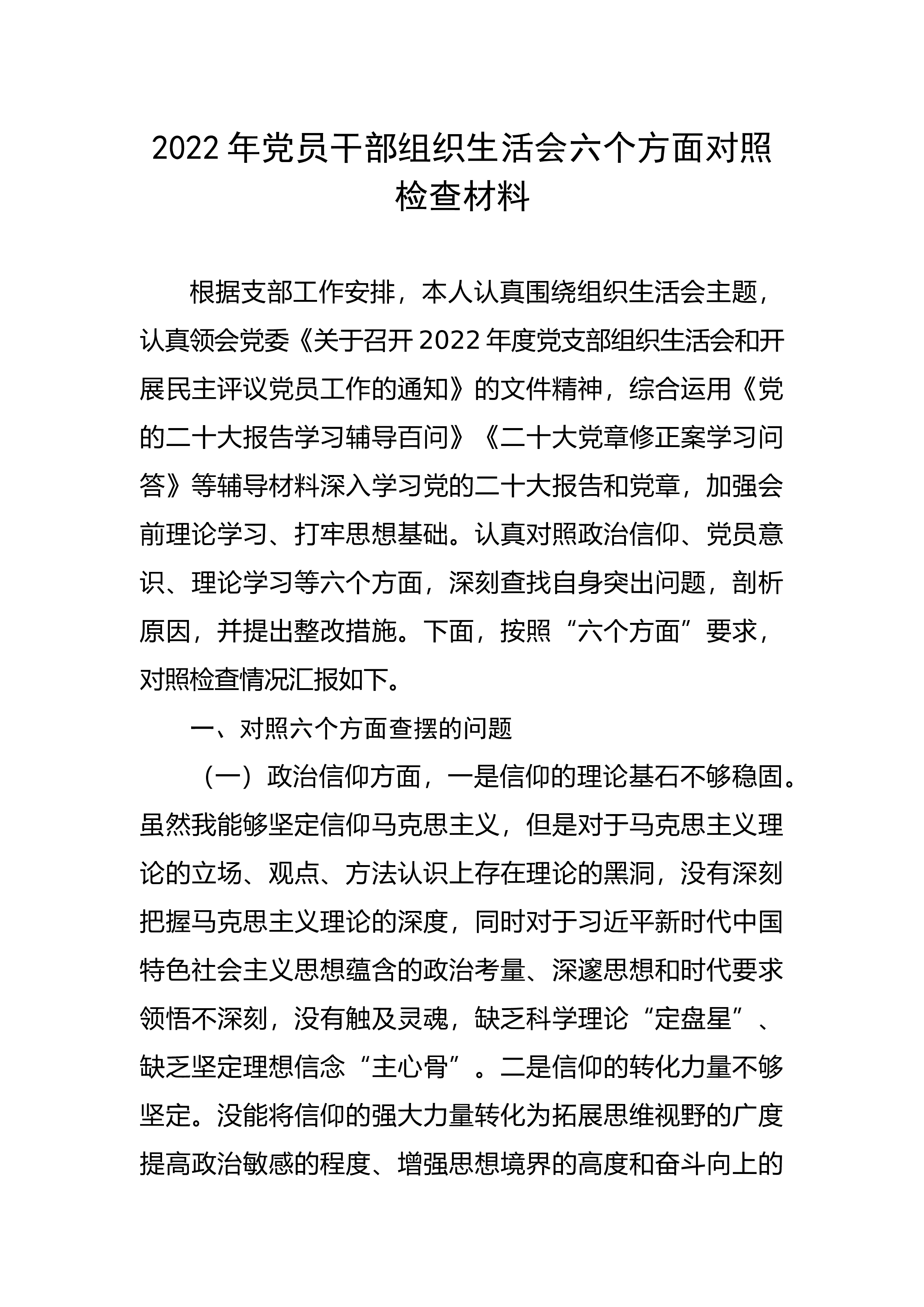 政协机关党支部班子2022年度组织生活会对照检查材料根据《中共XX县委组织部关于召开2022年度基层党组织组织生活会和开展民主评议党员的通知》和县政协机关党委要求,县政协机关党支部会前采取个人自学、研讨交流、党课辅导等方式,组织党员原原本本、逐字逐句学习XX报告和党章,学习习近平总书记在XX上的重要讲话精神,为开好此次组织生活打下了思想基础;同时,通过多方面征求了对支部委员会的意见建议,对照党支部职责,对照完成巡察以及上年度组织生活等问题整改情况,重点查摆增强政治功能和组织功能存在的问题和差距,认真剖析问题根源,明确了下步努力方向和整改措施。现将有关情况对照检查如下。 一、2022年度组织生...