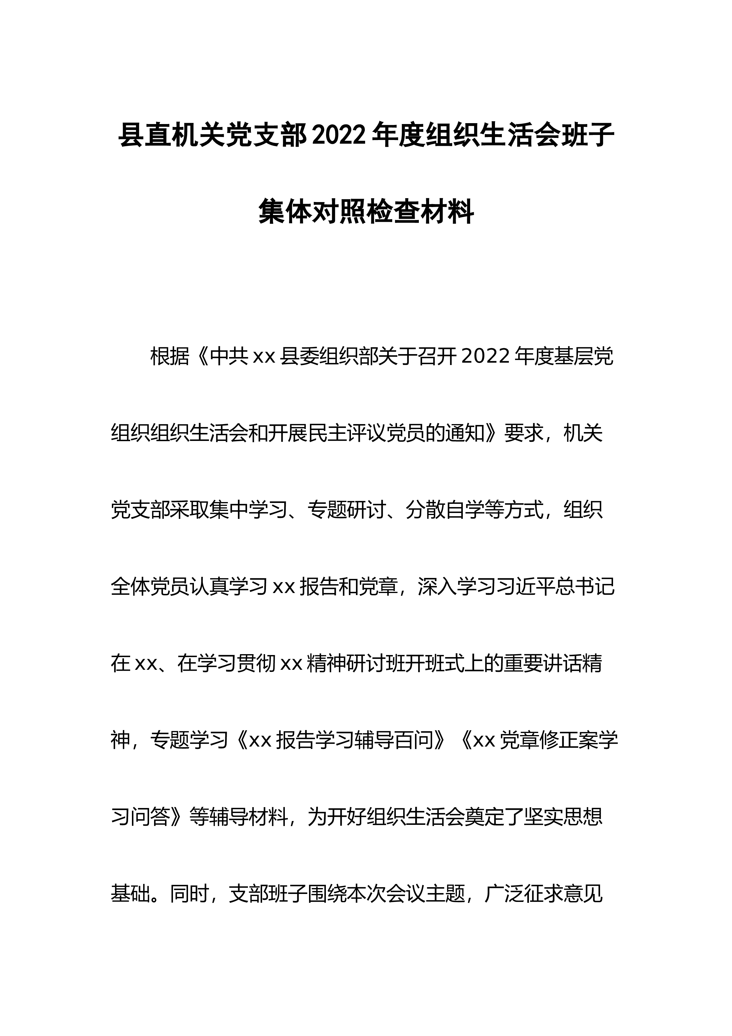 【组织生活会】县直机关党支部2022年度组织生活会班子集体对照检查材料