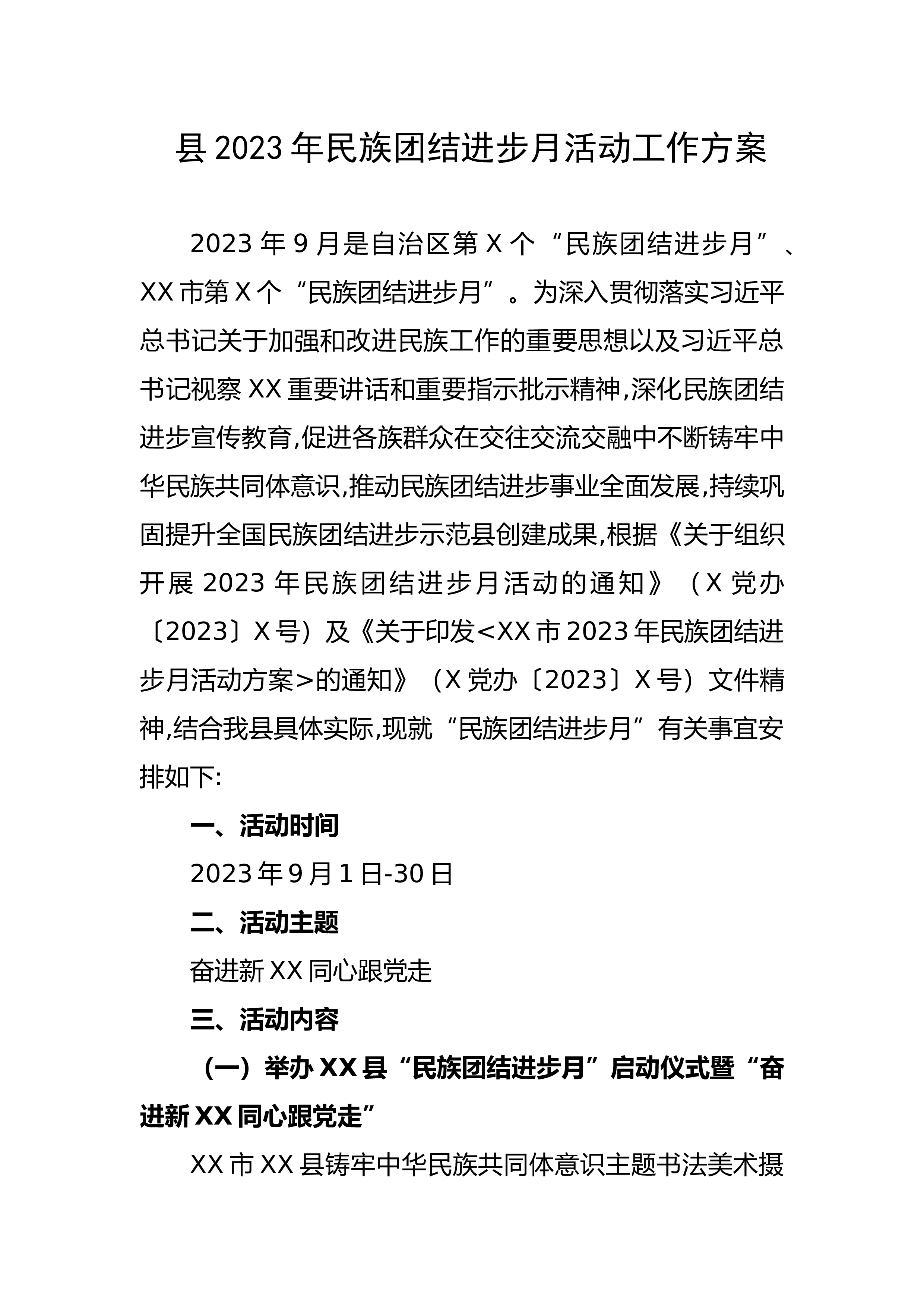 县2023年民族团结进步月活动工作方案2023年9月是自治区第X个“民族团结进步月”、XX市第X个“民族团结进步月”。为深入贯彻落实习近平总书记关于加强和改进民族工作的重要思想以及习近平总书记视察XX重要讲话和重要指示批示精神,深化民族团结进步宣传教育,促进各族群众在交往交流交融中不断铸牢中华民族共同体意识,推动民族团结进步事业全面发展,持续巩固提升全国民族团结进步示范县创建成果,根据《关于组织开展2023年民族团结进步月活动的通知》(X党办〔2023〕X号)及《关于印发的通知》(X党办〔2023〕X号)文件精神,结合我县具体实际,现就“民族团结进步月”有关事宜安排如下:一、活动时间2023年...