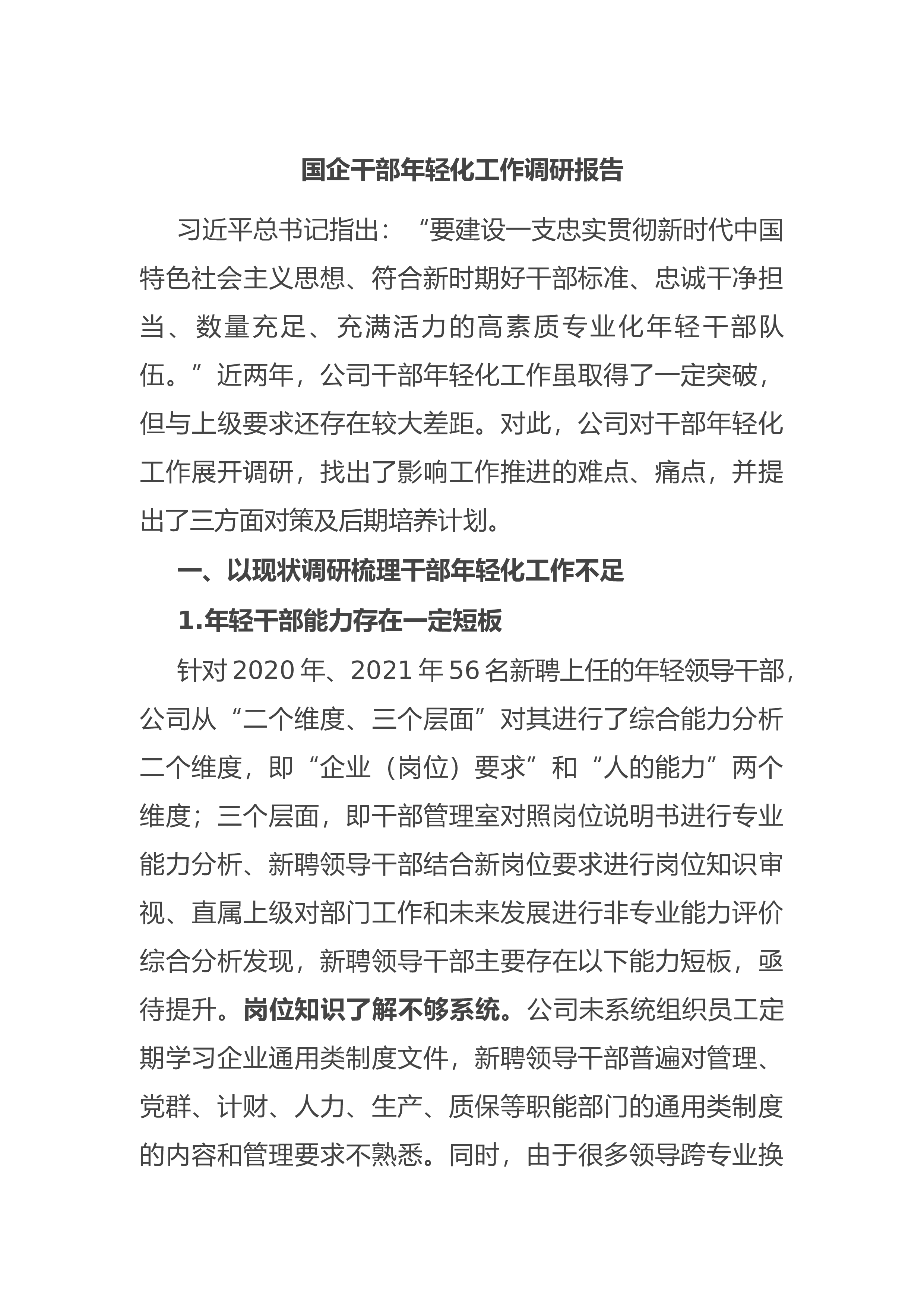 国企干部年轻化工作调研报告