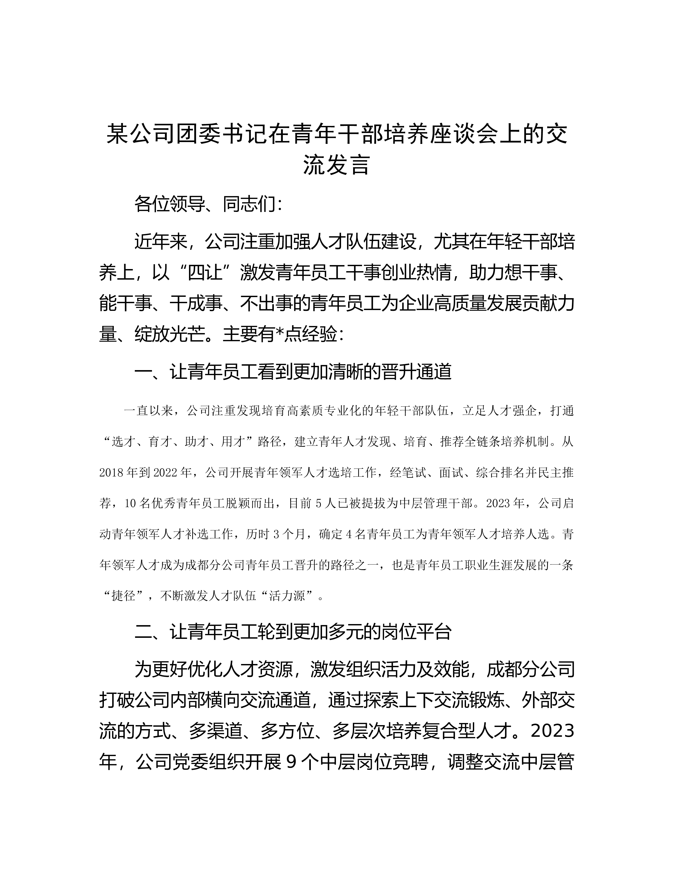 某公司团委书记在青年干部培养座谈会上的交流发言各位领导、同志们:近年来,公司注重加强人才队伍建设,尤其在