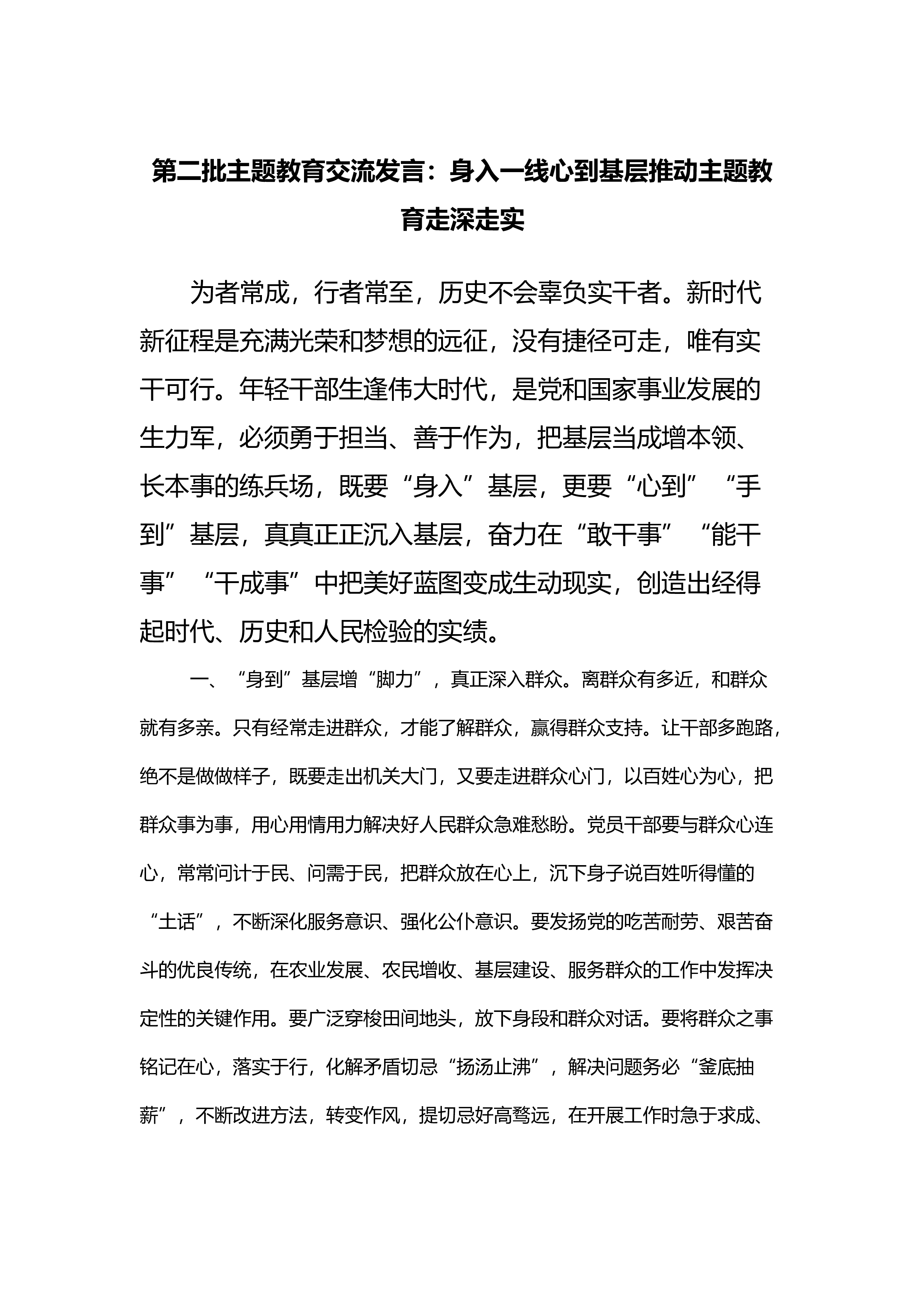 生逢伟大时代,是党和国家事业发展的生力军,必须勇于担当、善于作为,把基层当成增本领、长本事的练兵场,既要“身入”基层,更要“心到”“手到”基层,真真正正沉入基层,奋力在“敢干事”“能干事”“干成事”中把美好蓝图变成生动现实,创造出经得起时代、历史和人民检验的实绩。一、“身到”基层增“脚力”,真正深入群众。离群众有多近,和群众就有多亲。只有经常走进群众,才能了解群众,赢得群众支持。让干部多跑路,绝不是做做样子,既要走出机关大门...