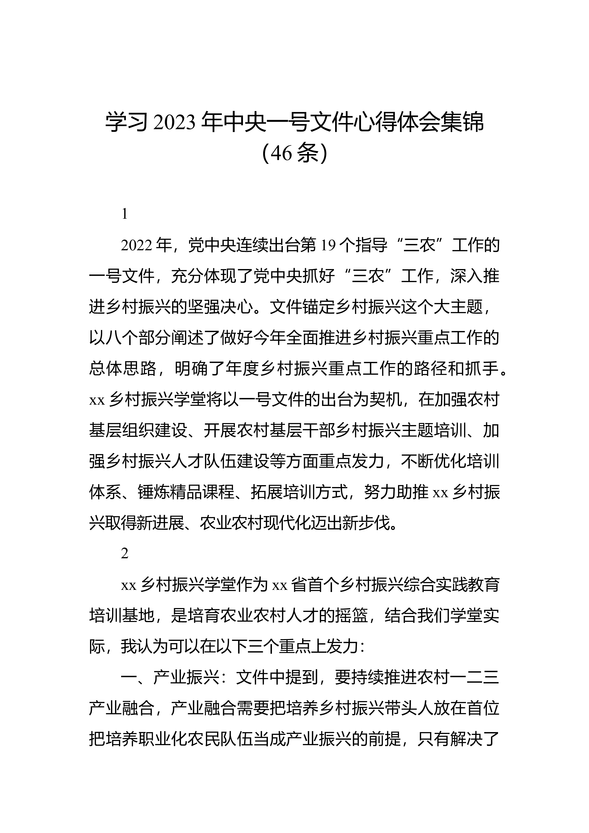学习2023年中央一号文件心得体会集锦(46条)12022年,党中央连续出台第19个指导“三农”工作的一号文件,充分体现了党中央抓好“三农”工作,深入推进乡村振兴的坚强决心。文件锚定乡村振兴这个大主题,以八个部分阐述了做好今年全面推进乡村振兴重点工作的总体思路,明确了年度乡村振兴重点工作的路径和抓手。xx乡村振兴学堂将以一号文件的出台为契机,在加强农村基层组织建设、开展农村基层干部乡村振兴主题培训、加强乡村振兴人才队伍建设等方面重点发力,不断优化培训体系、锤炼精品课程、拓展培训方式,努力助推xx乡村振兴取得新进展、农业农村现代化迈出新步伐。2xx乡村振兴学堂作为xx省首个乡村振兴综合实践教育培...