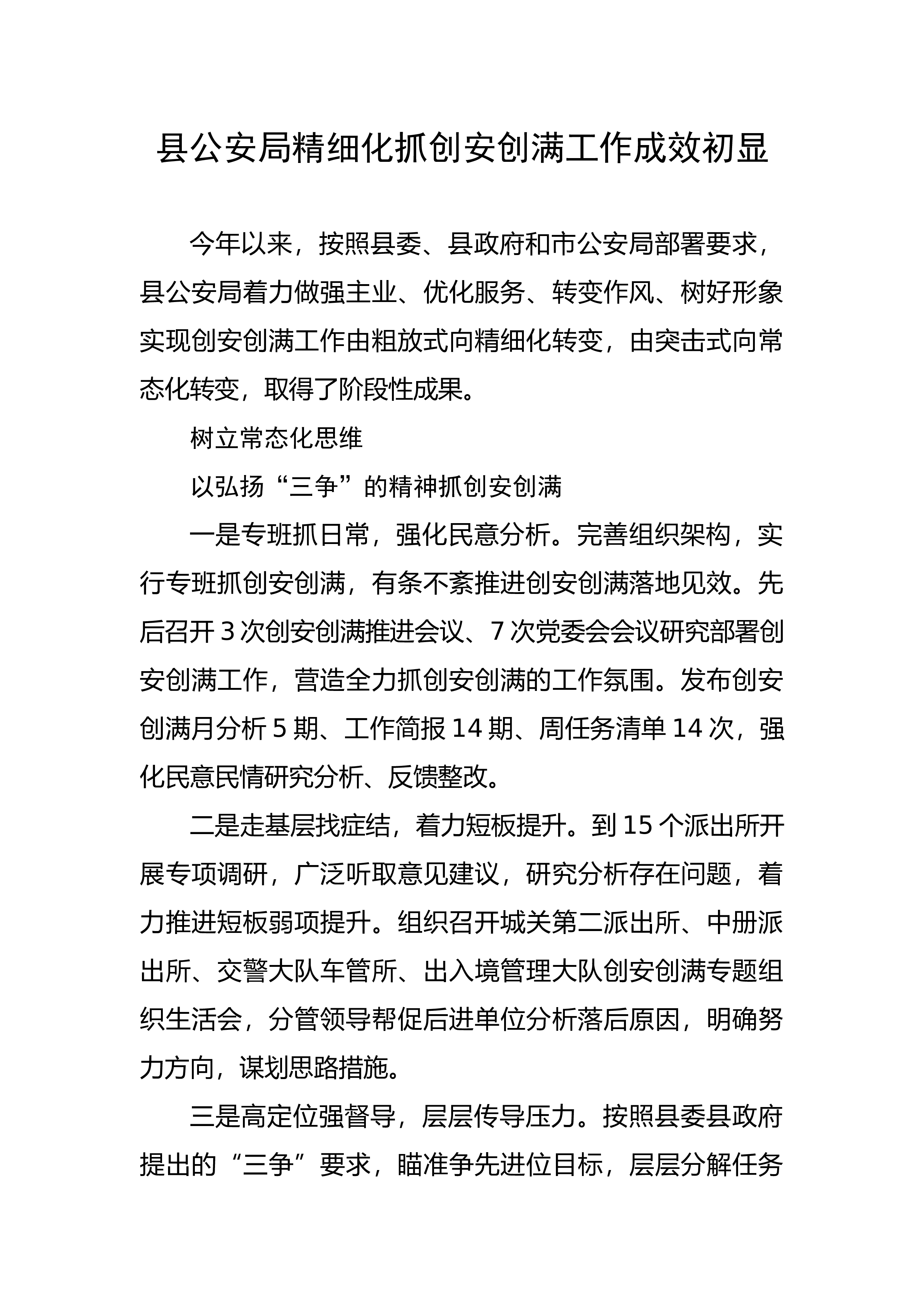 县公安局精细化抓创安创满工作成效初显今年以来,按照县委、县政府和市公安局部署要求,县公安局着力做强主业、优化服务、转变作风、树好形象实现创安创满工作由粗放式向精细化转变,由突击式向常态化转变,取得了阶段性成果。树立常态化思维以弘扬“三争”的精神抓创安创满一是专班抓日常,强化民意分析。完善组织架构,实行专班抓创安创满,有条不紊推进创安创满落地见效。先后召开3次创安创满推进会议、7次党委会会议研究部署创安创满工作,营造全力抓创安创满的工作氛围。发布创安创满月分析5期、工作简报14期、周任务清单14次,强化民意民情研究分析、反馈整改。二是走基层找症结,着力短板提升。到15个