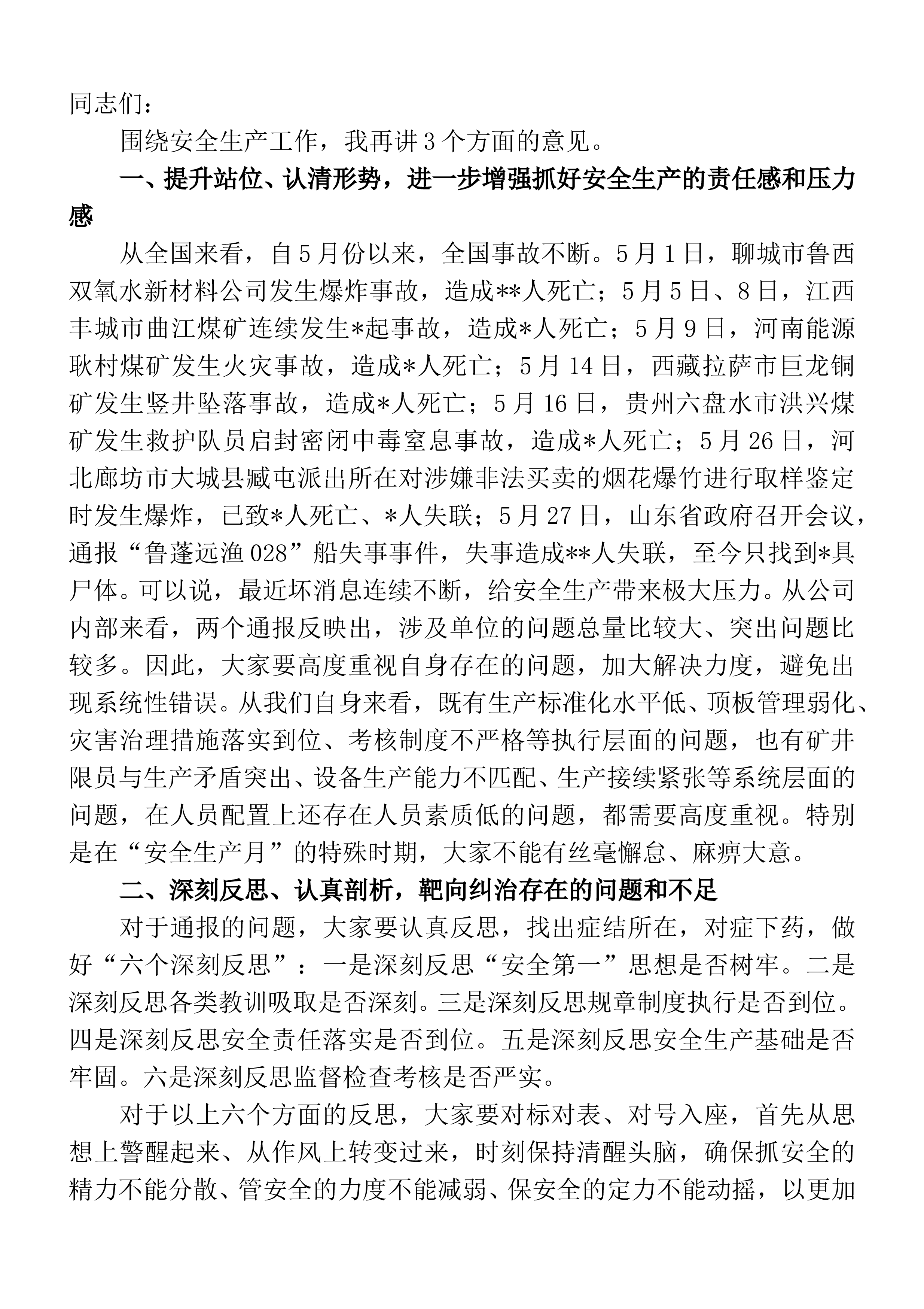 同志们:围绕安全生产工作,我再讲3个方面的意见。一、提升站位、认清形势,进一步增强抓好安全生产的责任感和压力感从全国来看,自5月份以来,全国事故不断。5月1日,聊城市鲁西双氧水新材料公司发生爆炸事故,造成**人死亡;5月5日、8日,江西丰城市曲江煤矿连续发生*起事故,造成*人死亡;5月9日,河南能源耿村煤矿发生火灾事故,造成*人死亡;5月14日,西藏拉萨市巨龙铜矿发生竖井坠落事故,造成*人死亡;5月16日,贵州六盘水市洪兴煤矿发生救护队员启封密闭中毒窒息事故,造成*人死亡;5月26日,河北廊坊市大城县臧屯