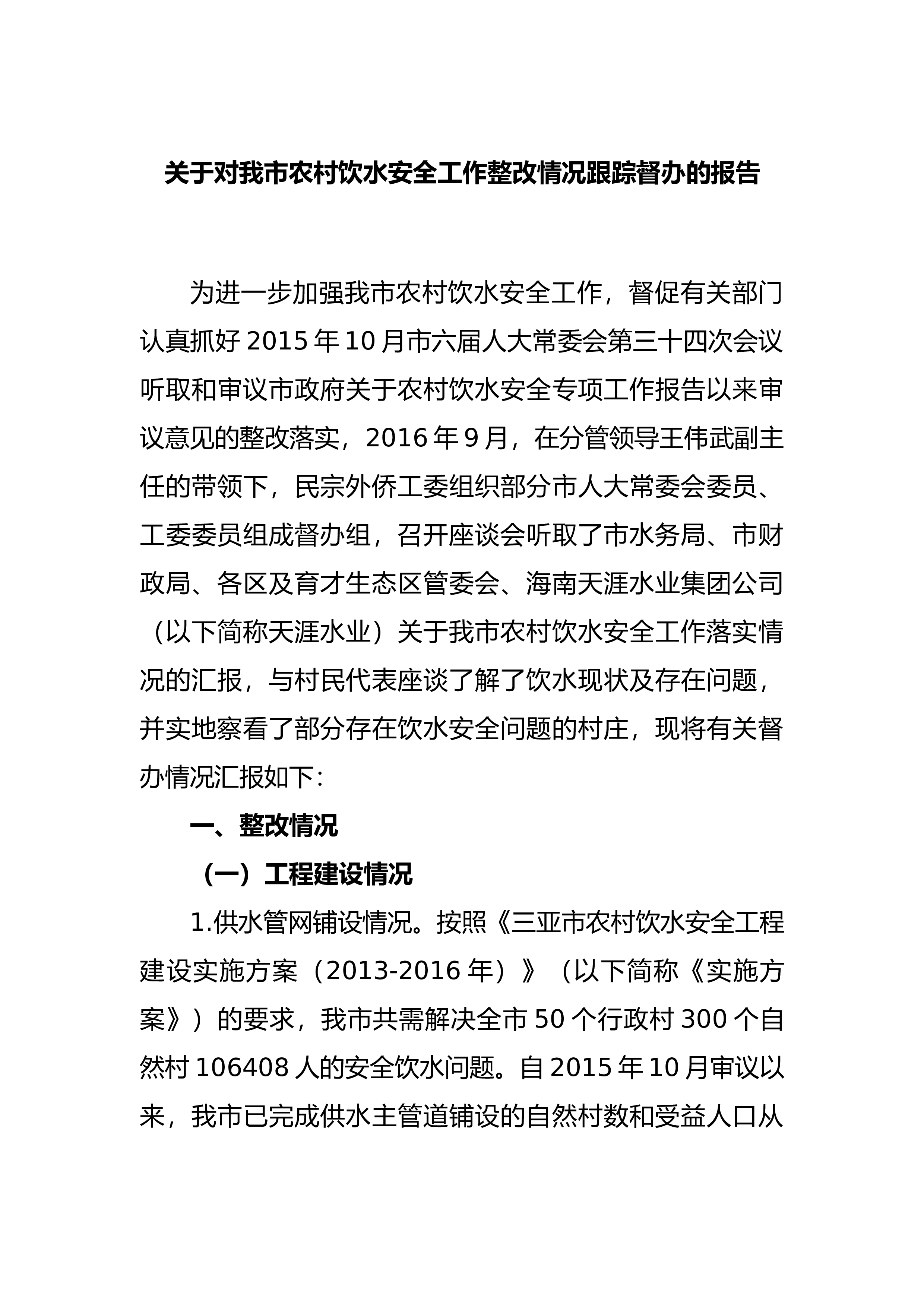 关于对我市农村饮水安全工作整改情况跟踪督办的报告为进一步加强我市农村饮水安全工作,督促有关部门认真抓好2015年10月市六届人大常委会第三十四次会议听取和审议市政府关于农村饮水安全专项工作报告以来审议意见的整改落实,2016年9月,在分管领导王伟武副主任的带领下,民宗外侨工委组织部分市人大常委会委员、工委委员组成督办组,召开座谈会听取了市水务局、市财政局、各区及育才生态区管委会、海南天涯水业集团公司(以下简称天涯水业)关于我市农村饮水安全工作落实情况的汇报,与村民代表座谈了解了饮水现状及存在问题,并实地察看了部分存在饮水安全问题的村庄,现将有关督办情况汇报如下:一、整改情况(一)工程建设情况1...