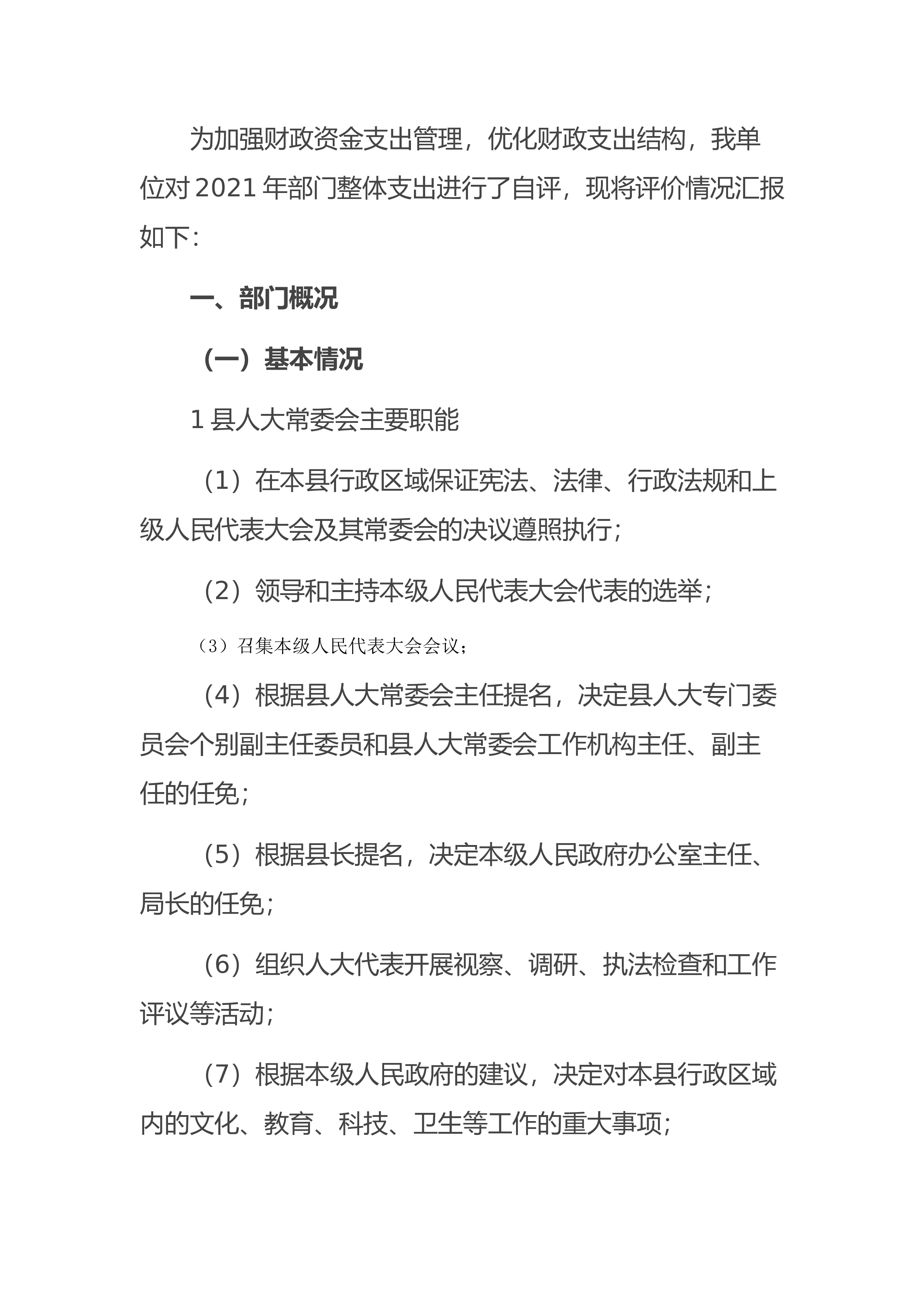为加强财政资金支出管理,优化财政支出结构,我单位对2021年部门整体支出进行了自评,现将评价情况汇报如下:一、部门概况(一)基本情况1县人大常委会主要职能(1)在本县行政区域保证宪法、法律、行政法规和上级人民代表大会及其常委会的决议遵照执行;(2)领导和主持本级人民代表大会代表的选举;(3)召集本级人民代表大会会议;(4)根据县人大常委会主任提名,决定县人大专门委员会个别副主任委员和县人大常委会工作机构主任、副主任的任免;(5)根据县长提名,决定本级人民政府办公室主任、局长的任免;(6)组织人大代表开展视察、调研、执法检查和工作评议等活动;(7)根据本级人民政府的建议,决定对本县行政区域内的文...