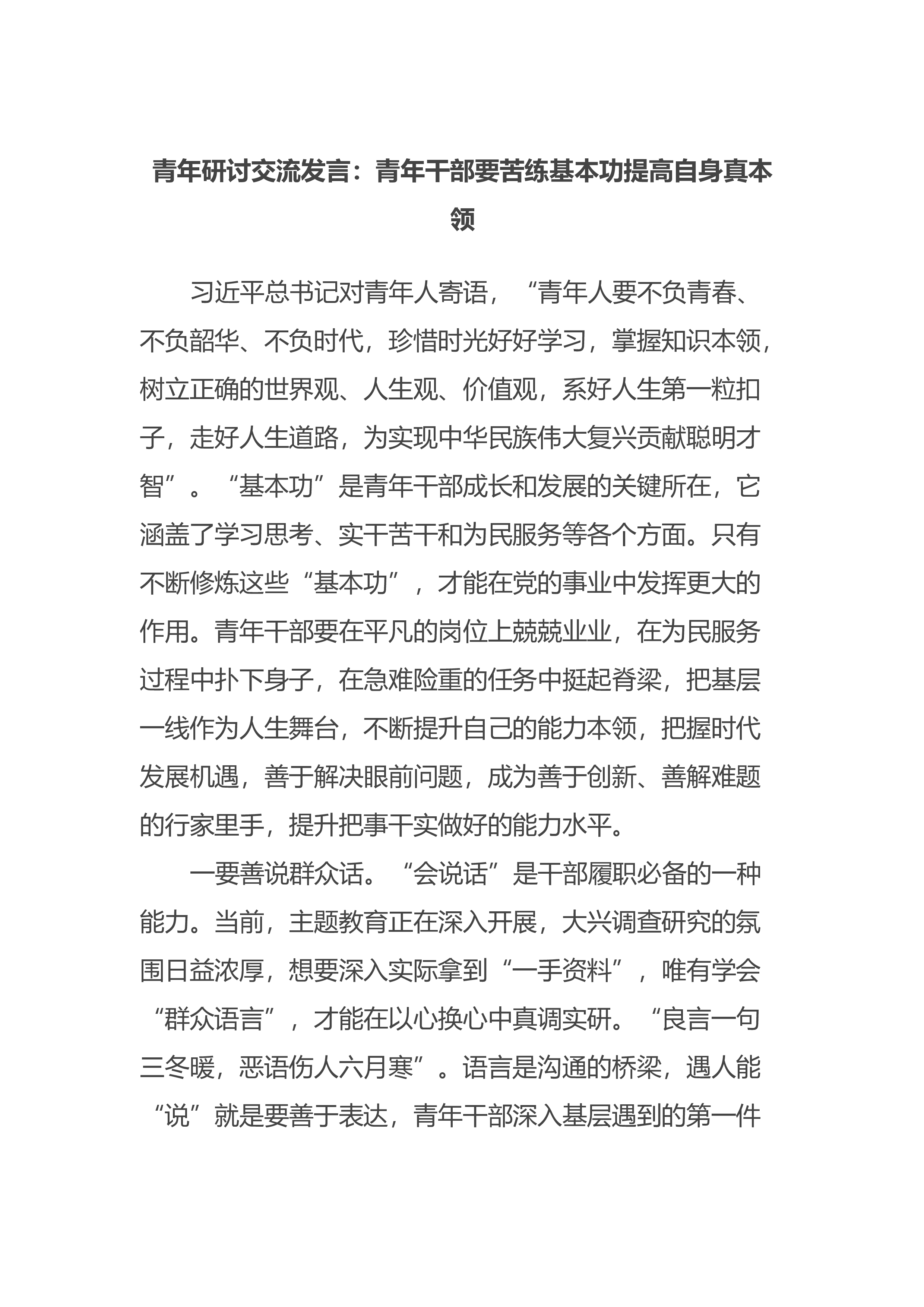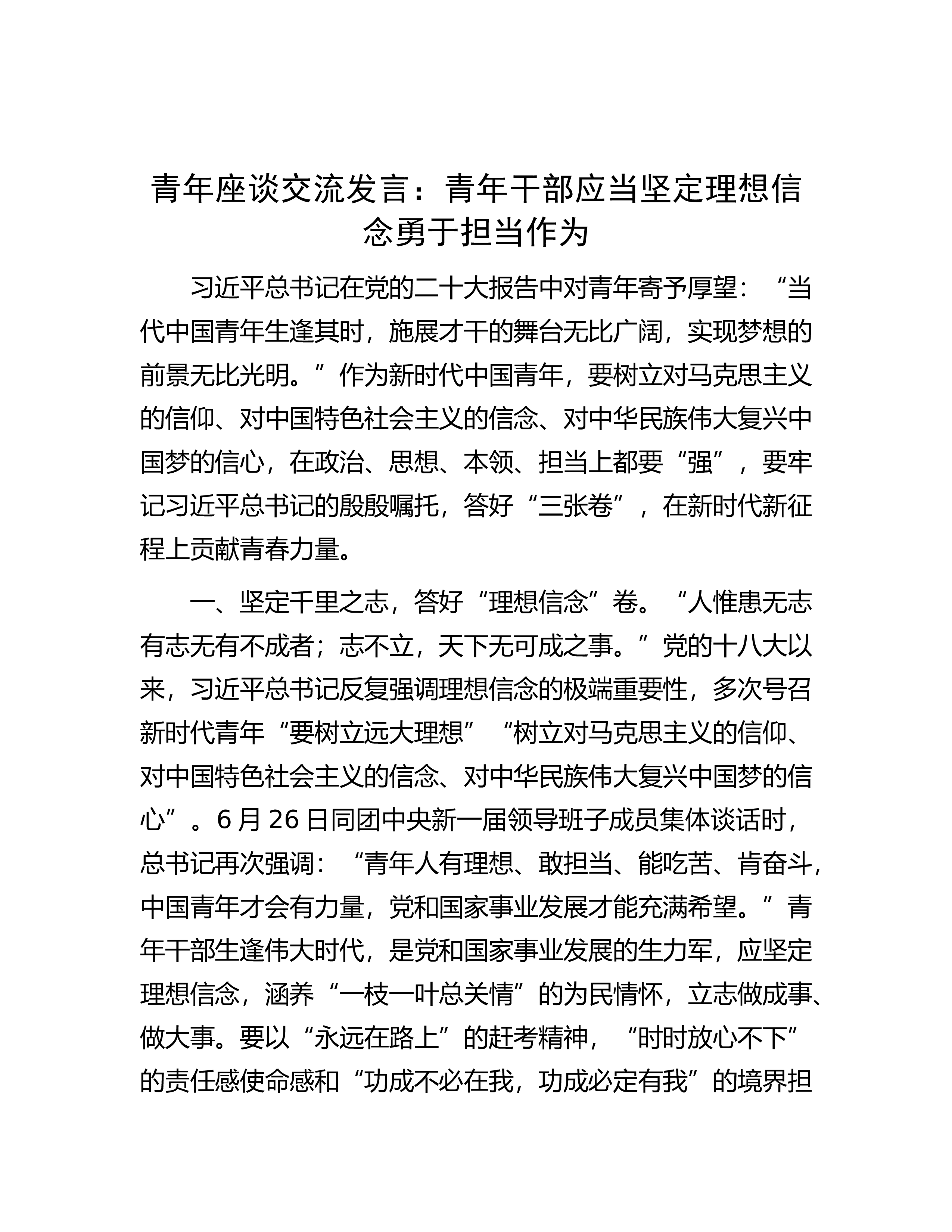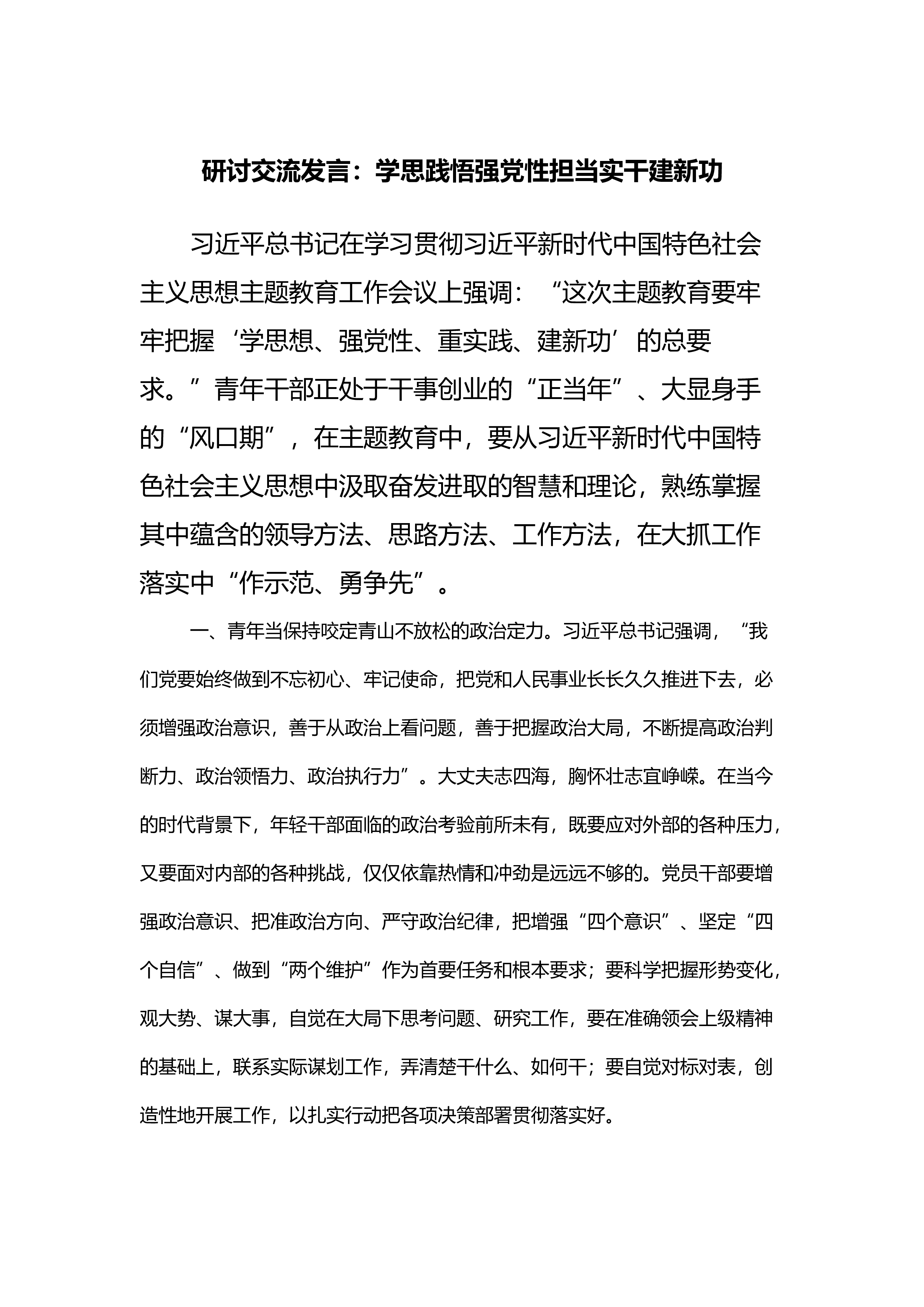 研讨交流发言:学思践悟强党性担当实干建新功习近平总书记在学习贯彻习近平新时代中国特色社会主义思想主T教育工作会议上强调:“这次主T教育要牢牢把握‘学思想、强党性、重实践、建新功’的总要求。”青年干部正处于干事创业的“正当年”、大显身手的“风口期”,在主T教育中,要从习近平新时代中国特色社会主义思想中汲取奋发进取的智慧和理论,熟练掌握其中蕴含的领导方法、思路方法、工作方法,在大抓工作落实中“作示范、勇争先”。一、青年当保持咬定青山不放松的政治定力。习近平总书记强调,“我们党要始终做到不忘初心、牢记使命,把党和人民事业长长久久推进下去,必须增强政治意识,善于从政治上看问题,善于把握政治大局,不断提...