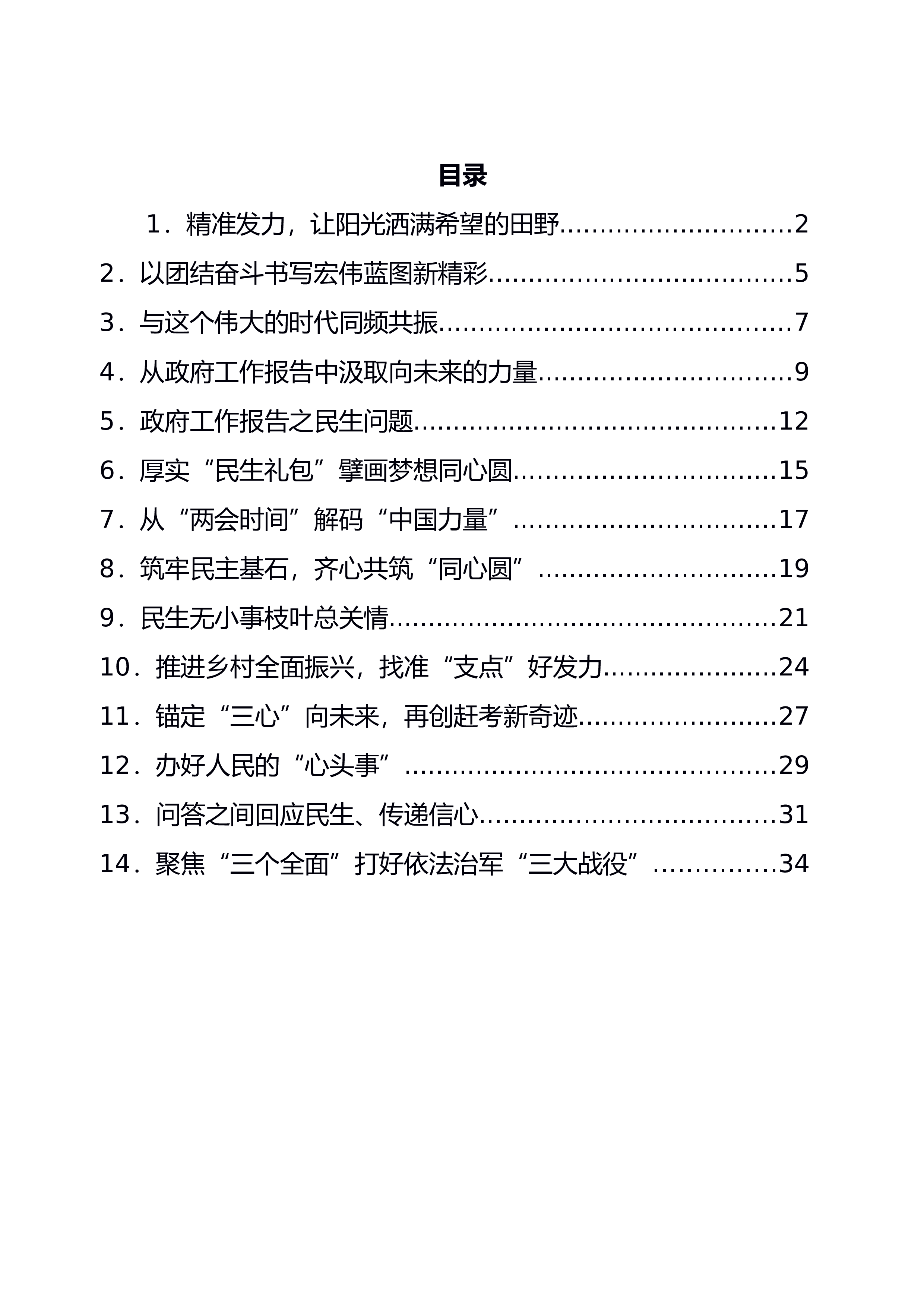 2021年全国两会精神传达提纲全国两会精神传达提纲一、大会概况十三届全国人大四次会议于3月5日至11日在北京举行。这次会议是在“两个一百年”奋斗目标的历史交汇点上召开的一次重要会议。大会坚持以习近平新时代中国特色社会主义思想为指导,全面贯彻党的十九大和十九届二中、三中、四中、五中全会精神,对于鼓舞和动员全国各族人民更加紧密地团结在以总书记同志为核心的党中央周围,坚定信心、开拓进取,勠力同心做好今年经济社会发展工作,实现“十四五”时期我国发展开好局、起好步,以优异成绩庆祝建党100周年,具有十分重要的意义。大会共有10项议程:一是审议政府工作报告;二是审查国民经济和社会发展第十四个五年规划和20...