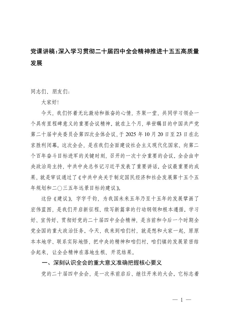 2025年11月党课讲稿深入学习贯彻二十届四中