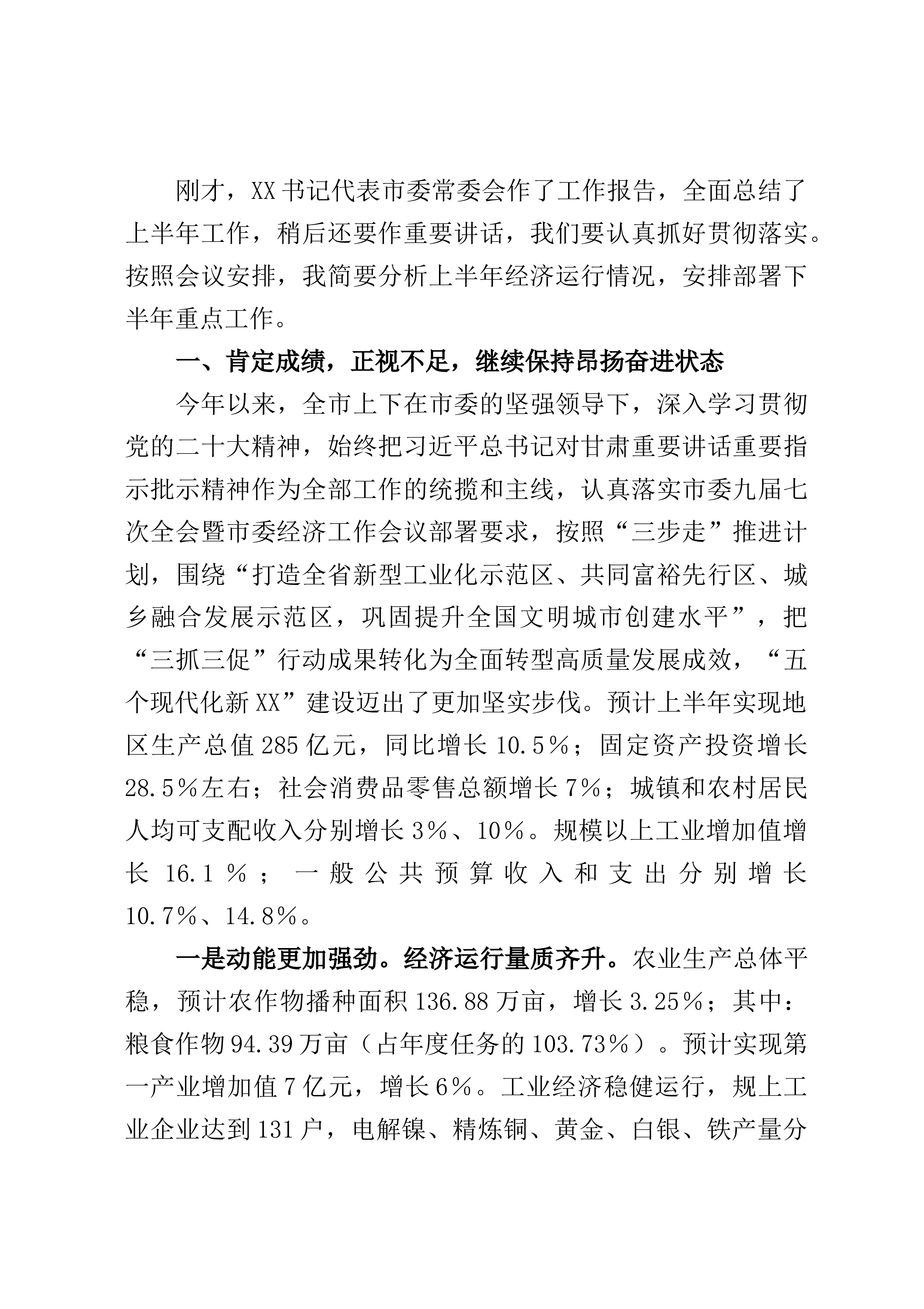 刚才,XX书记代表市委常委会作了工作报告,全面总结了上半年工作,稍后还要作重要讲话,我们要认真抓好贯彻落实。按照会议安排,我简要分析上半年经济运行情况,安排部署下半年重点工作。一、肯定成绩,正视不足,继续保持昂扬奋进状态今年以来,全市上下在市委的坚强领导下,深入学习贯彻党的二十大精神,始终把习近平总书记对甘肃重要讲话重要指示批示精神作为全部工作的统揽和主线,认真落实市委九届七次全会暨市委经济工作会议部署要求,按照“三步走”推进计划,围绕“打造全省新型工业化示范区、共同富裕先行区、城乡融合发展示范区,巩固提升全国文明城市创建水平”,把“三抓三促”行动成果转化为全面转型高质量发展成效,“五个现代化...