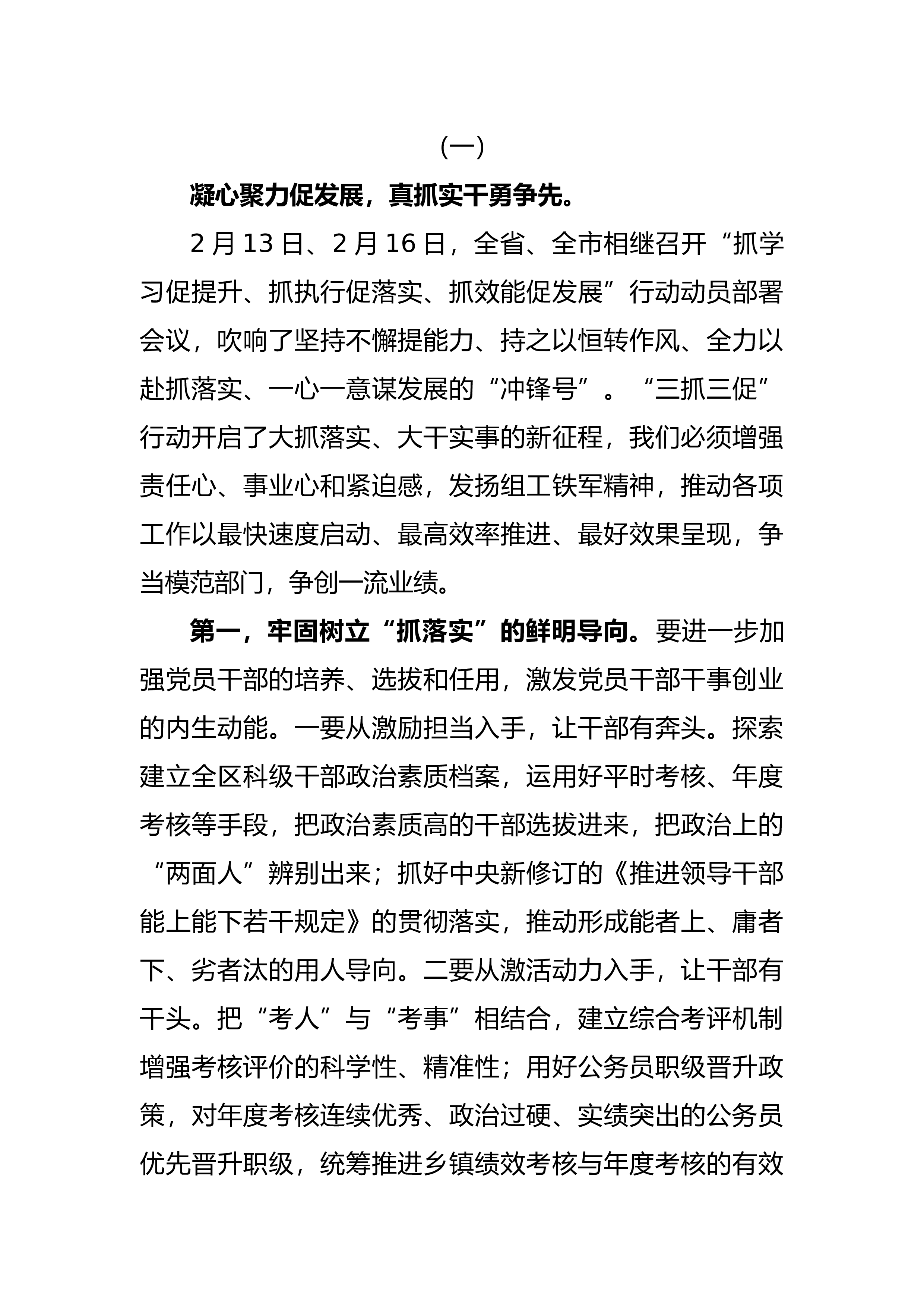 (一)凝心聚力促发展,真抓实干勇争先。2月13日、2月16日,全省、全市相继召开“抓学习促提升、抓执行促落实、抓效能促发展”行动动员部署会议,吹响了坚持不懈提能力、持之以恒转作风、全力以赴抓落实、一心一意谋发展的“冲锋号”。“三抓三促”行动开启了大抓落实、大干实事的新征程,我们必须增强责任心、事业心和紧迫感,发扬组工铁军精神,推动各项工作以最快速度启动、最高效率推进、最好效果呈现,争当模范部门,争创一流业绩。第一,牢固树立“抓落实”的鲜明导向。要进一步加强党员干部的培养、选拔和任用,激发党员干部干事创业的内生动能。一要从激励担当入手,让干部有奔头。探索建立全区科级干部政治素质档案,运用好平时考...