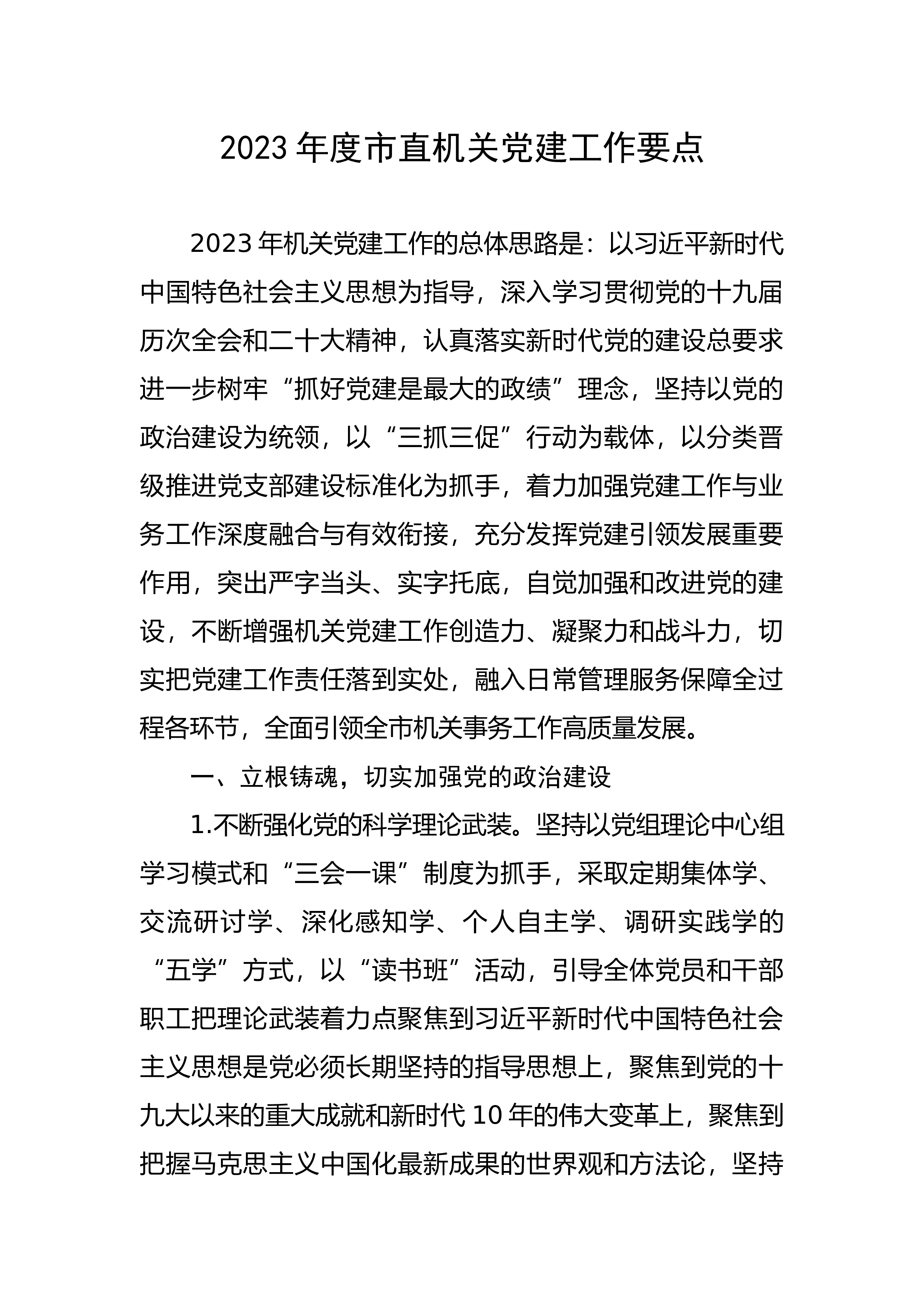 2023年度市直机关党建工作要点2023年机关党建工作的总体思路是:以习近平新时代中国特色社会主义思想为指导,深入学习贯彻党的十九届历次全会和二十大精神,认真落实新时代党的建设总要求进一步树牢“抓好党建是最大的政绩”理念,坚持以党的政治建设为统领,以“三抓三促”行动为载体,以分类晋级推进党支部建设标准化为抓手,着力加强党建工作与业务工作深度融合与有效衔接,充分发挥党建引领发展重要作用,突出严字当头、实字托底,自觉加强和改进党的建设,不断增强机关党建工作创造力、凝聚力和战斗力,切实把党建工作责任落到实处,融入日常管理服务保障全过程各环节,全面引领全市机关事务工作高质量发展。一、立根铸魂,切实加强...