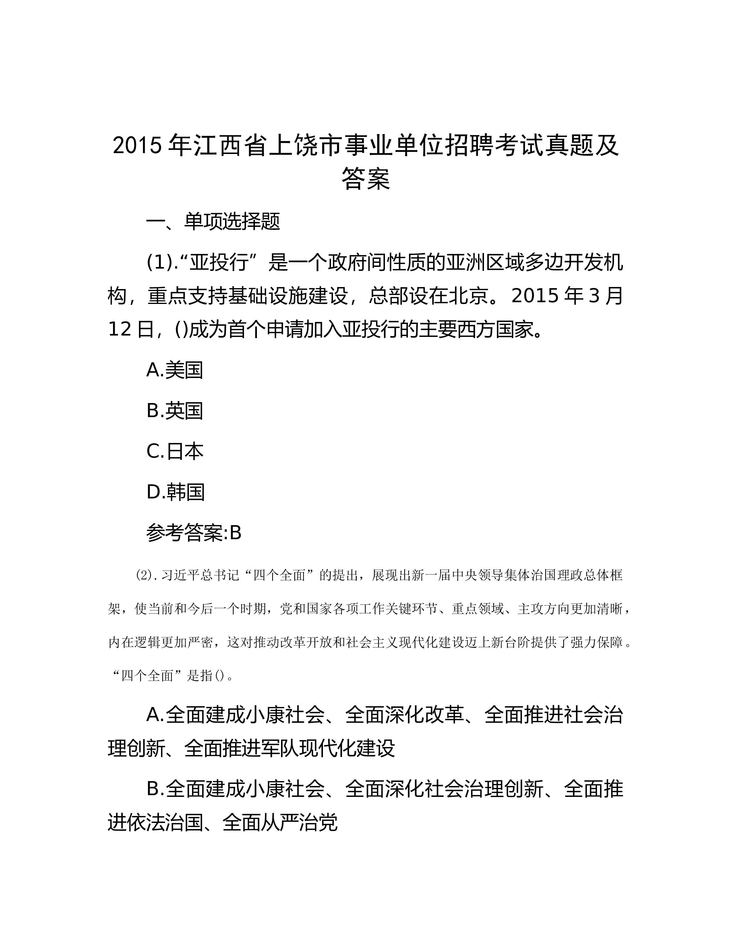 2015年江西省上饶市事业单位招聘考试真题及答案一、单项选择题(1).“亚投行”是一个政府间性质的亚洲区域多边开发机构,重点支持基础设施建设,总部设在北京。2015年3月12日,()成为首个申请加入亚投行的主要西方国家。A.美国B.英国C.日本D.韩国参考答案:B(2).习近平总书记“四个全面”的提出,展现出新一届中央领导集体治国理政总体框架,使当前和今后一个时期,党和国家各项工作关键环节、重点领域、主攻方向更加清晰,内在逻辑更加严密,这对推动改革开放和社会主义现代化建设迈上新台阶提供了强力保障。“四个全面”是指()。A.全面建成小康社会、全面深化改革、全面推进