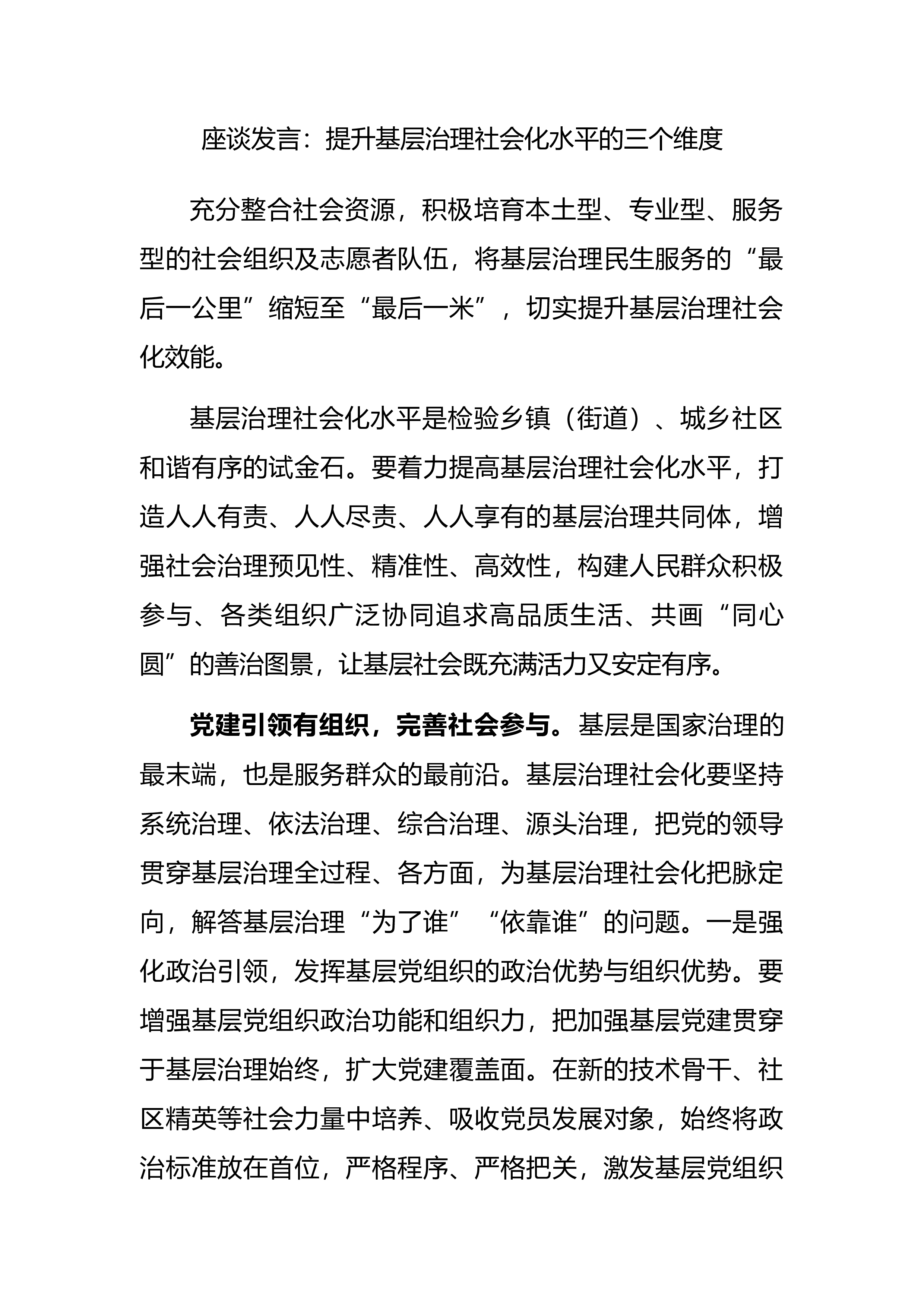 座谈发言:提升基层治理社会化水平的三个维度充分整合社会资源,积极培育本土型、专业型、服务型的社会组织及志愿者队伍,将基层治理民生服务的“最后一公里”缩短至“最后一米”,切实提升基层治理社会化效能。基层治理社会化水平是检验乡镇(街道)、城乡社区和谐有序的试金石。要着力提高基层治理社会化水平,打造人人有责、人人尽责、人人享有的基层治理共同体,增强