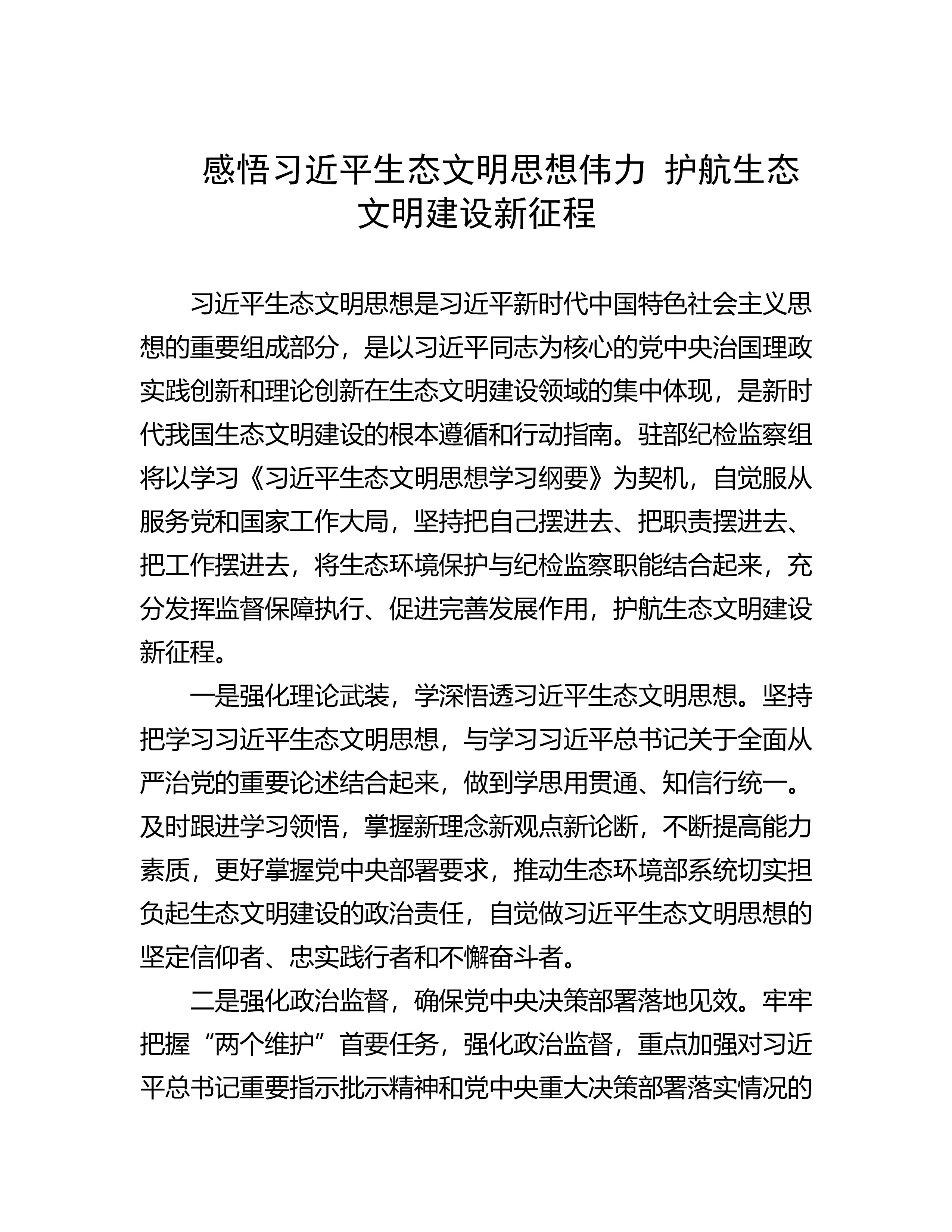 感悟习近平生态文明思想伟力护航生态文明建设新征程习近平生态文明思想是习近平新时代中国特色社会主义思想的重要组成部分,是以习近平同志为核心的党中央治国理政实践创新和理论创新在生态文明建设领域的集中体现,是新时代我国生态文明建设的根本遵循和行动指南。驻部纪检监察组将以学习《习近平生态文明思想学习纲要》为契机,自觉服从服务党和国家工作大局,坚持把自己摆进去、把职责摆进去、把工作摆进去,将生态环境保护与纪检监察职能结合起来,充分发挥监督保障执行、促进完善发展作用,护航生态文明建设新征程。一是强化理论武装,学深悟透习近平生态文明思想。坚持把学习习近平生态文明思想,与学习习近平总书记关于全面从严治党的重要...