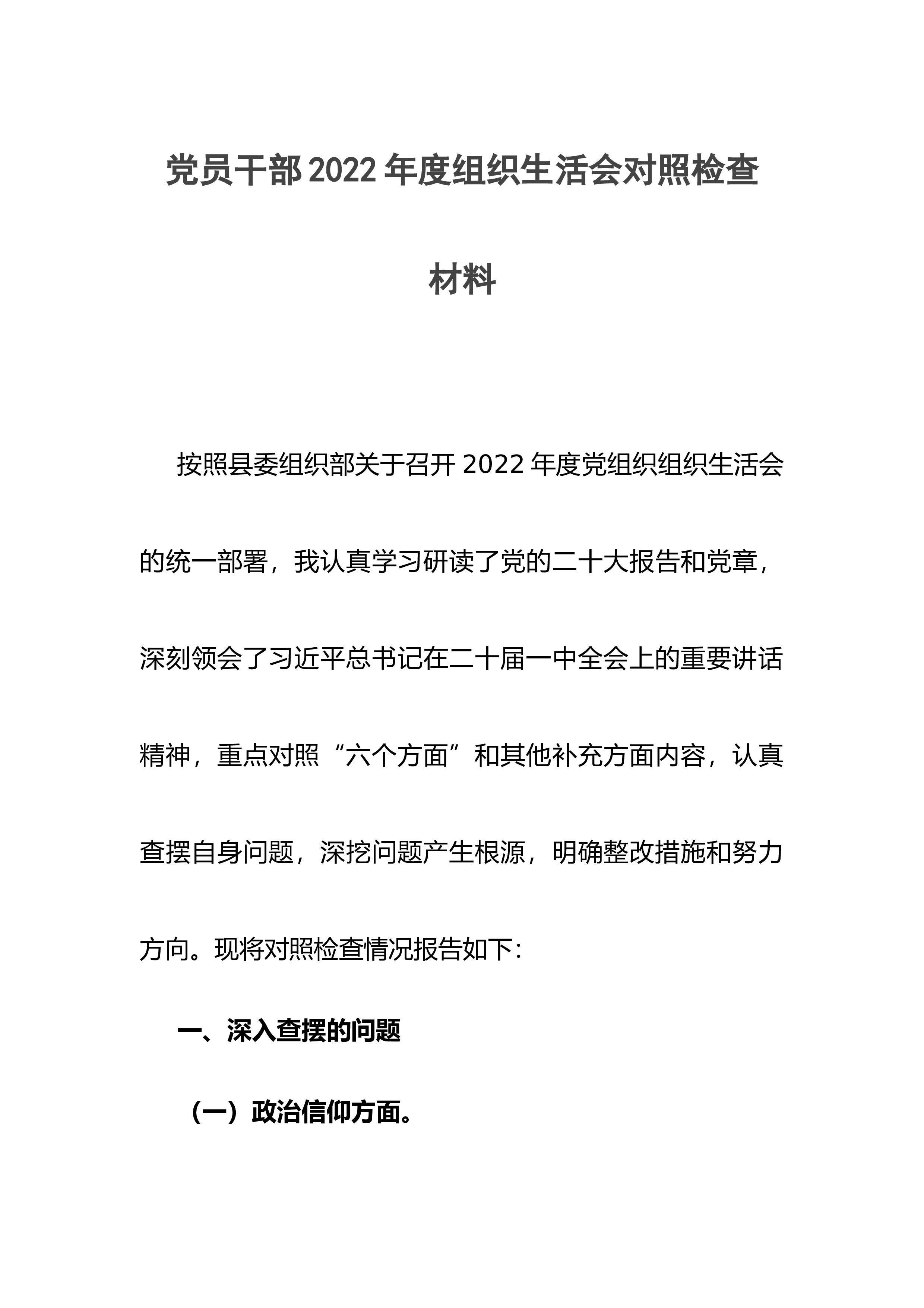 党员干部2022年度组织生活会对照检查材料按照县委组织部关于召开2022年度党组织组织生活会的统一部署,我认真学习研读了党的二十大报告和党章,深刻领会了习近平总书记在二十届一中全会上的重要讲话精神,重点对照“六个方面”和其他补充方面内容,认真查摆自身问题,深挖问题产生根源,明确整改措施和努力方向。现将对照检查情况报告如下:一、深入查摆的问题(一)政治信仰方面。一是大局意识不够牢固。在工作中还缺乏一定的大局意识、全局观念,导致自己对党的大政方针的把握不深、不透,认识不敏锐、不深刻,主要表现在有时只注重考虑自己份内工作,而没有站在单位的立场想问题、看事情,更不用说站在全市经济社会发展的角度去看问题...
