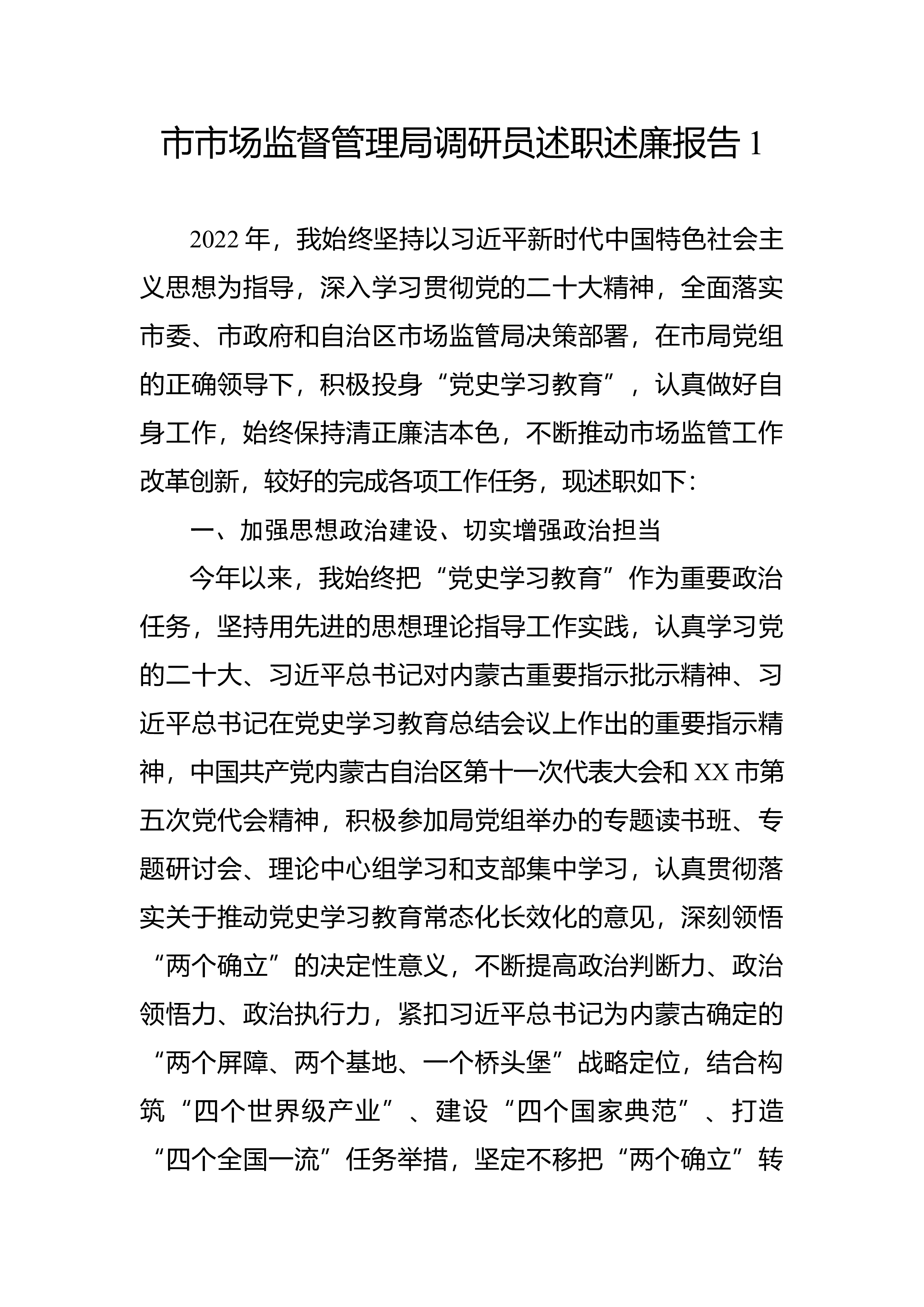 市市场监督管理局调研员述职述廉报告12022年,我始终坚持以习近平新时代中国特色社会主义思想为指导,深入学习贯彻党的二十大精神,全面落实市委、市政府和自治区市场监管局决策部署,在市局党组的正确领导下,积极投身“党史学习教育”,认真做好自身工作,始终保持清正廉洁本色,不断推动市场监管工作改革创新,较好的完成各项工作任务,现述职如下:一、加强思想政治建设、切实增强政治担当今年以来,我始终把“党史学习教育”作为重要政治任务,坚持用先进的思想理论指导工作实践,认真学习党的二十大、习近平总书记对内蒙古重要指示批示精神、习近平总书记在党史学习教育总结会议上作出的重要指示精神,中国共产党内蒙古自治区第十一次...