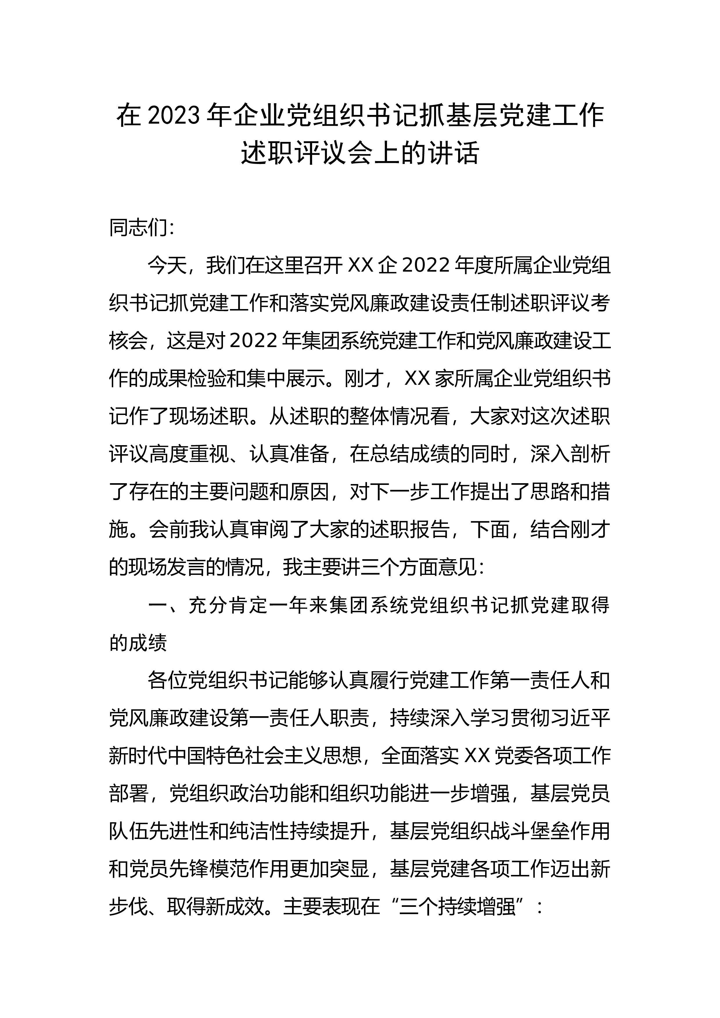 书记在2022年度基层党组织书记落实主体责任述职评议会议上的主持讲话同志们:在全区上下深入学习宣传贯彻习近平新时代中国特色社会主义思想和党的二十大精神之际,我们根据中央、XX省委、XX市委有关精神和部署要求,今天在这里召开2022年度XX区基层党组织书记落实主体责任述职评议会议,主要任务是总结工作、交流经验、分析问题、研究举措,进一步提升我区全面从严治党工作水平。今年的述职主要包括三个方面:一是抓基层党建工作情况;二是履行党风廉政建设主体责任情况;三是落实意识形态工作责任制情况。市纪委、市委组织部、市委宣传部高度重视这次述职评议会,XX同志专程前来指导,让我们以热烈的掌声欢迎他们的到来!今天的...