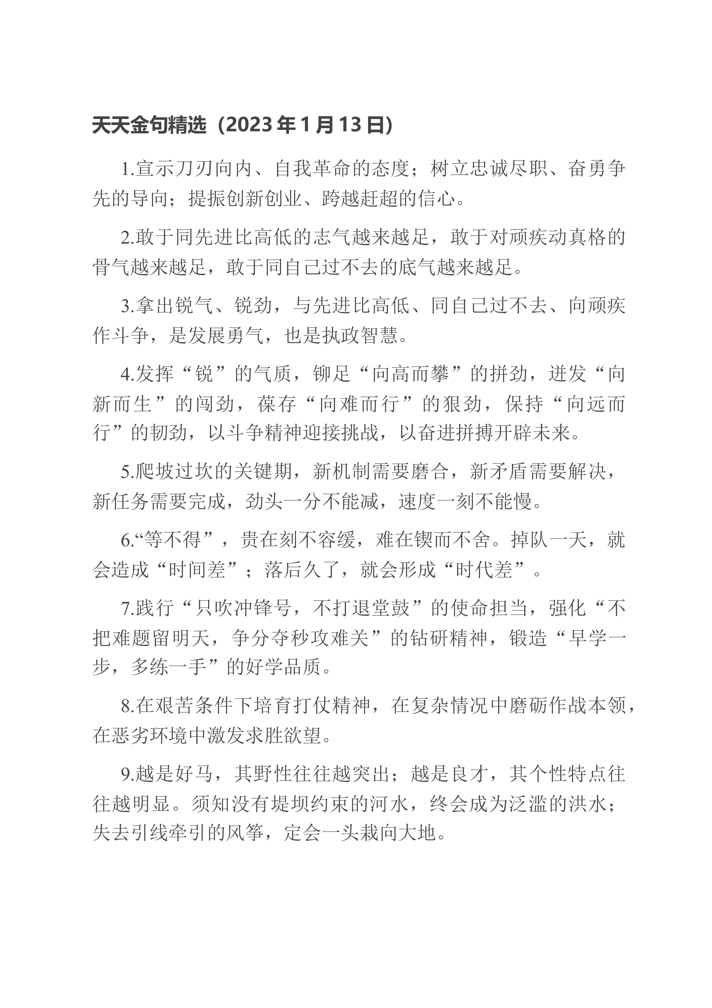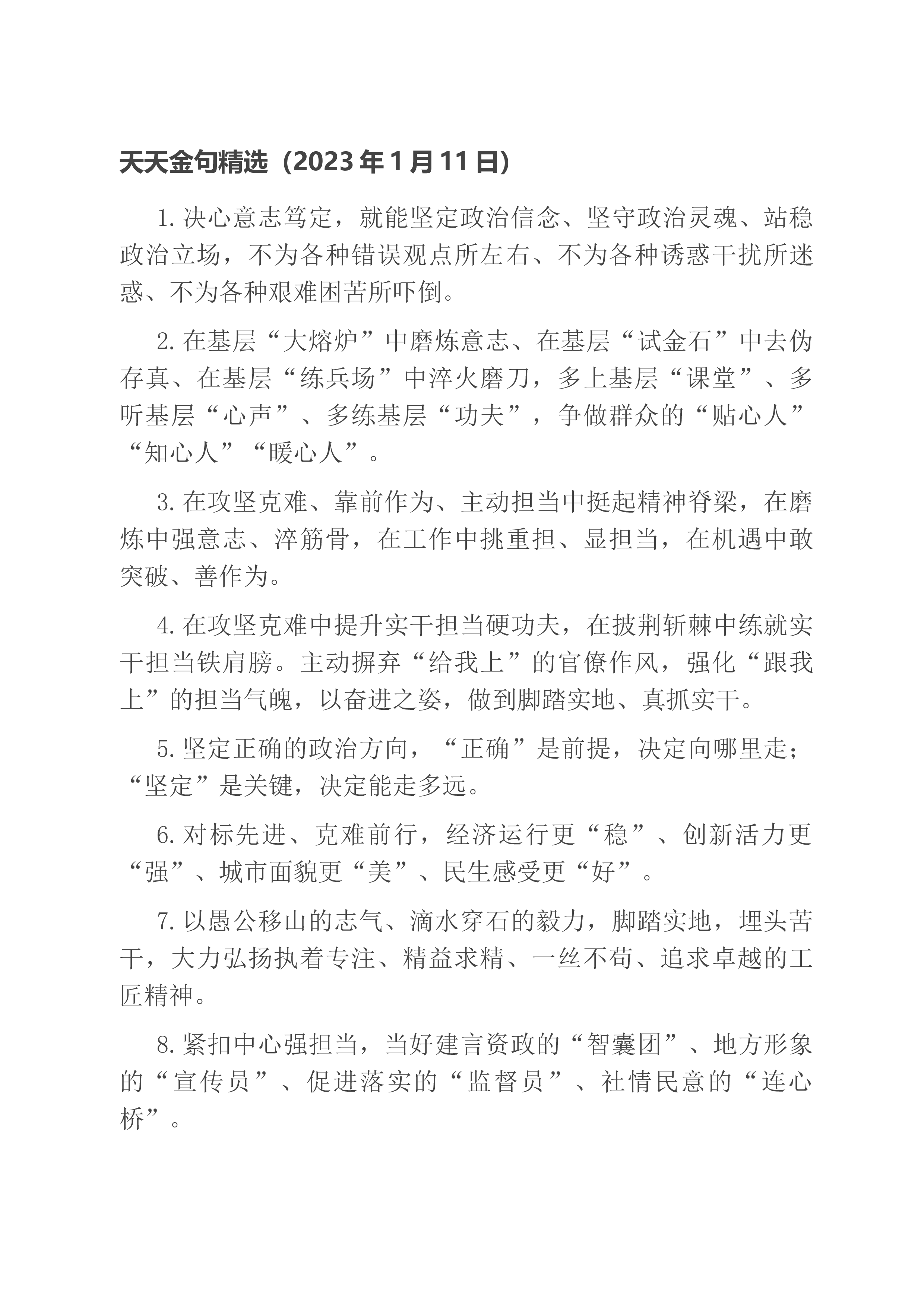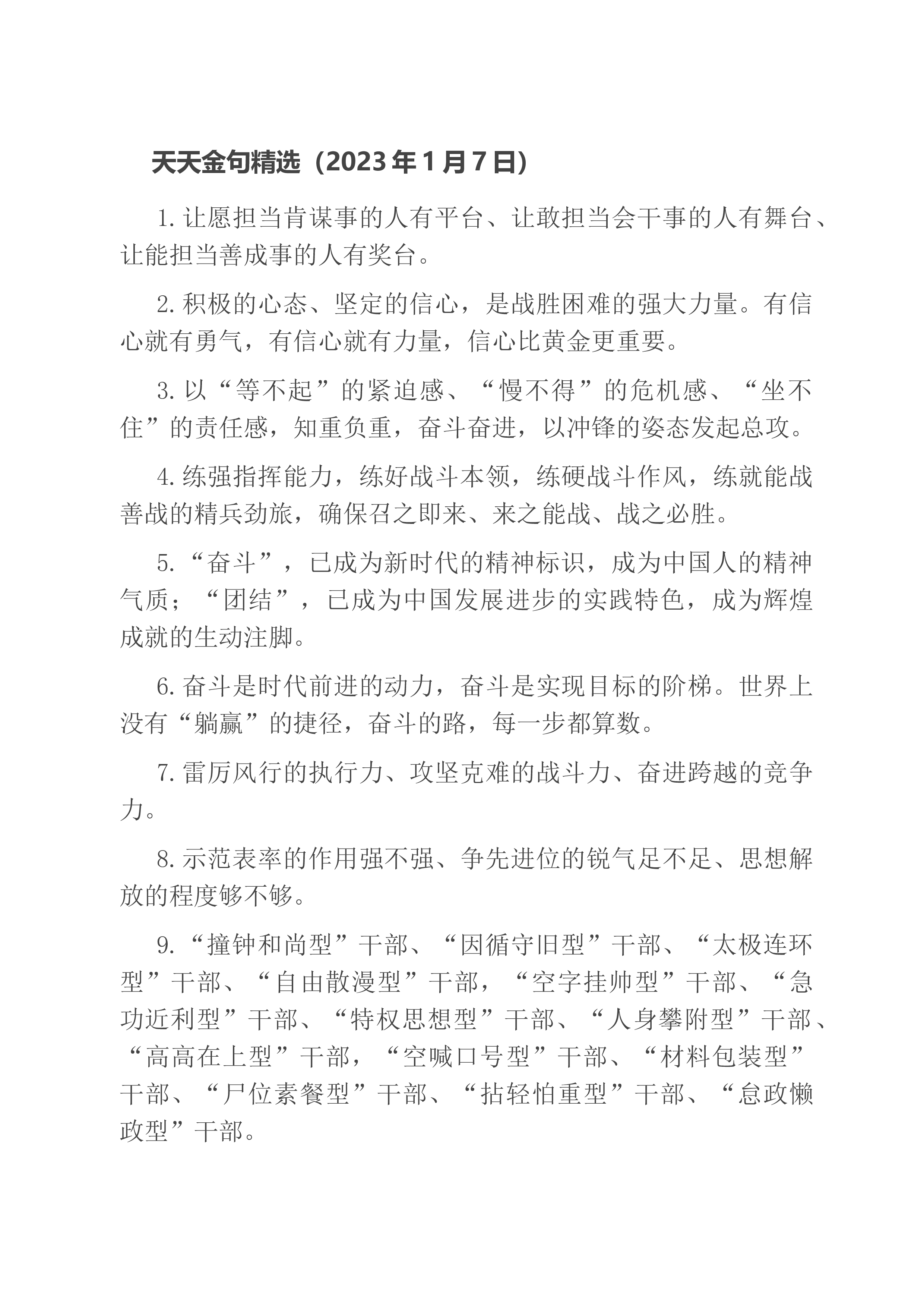 天天金句精选(2023年1月7日)1.让愿担当肯谋事的人有平台、让敢担当会干事的人有舞台、让能担当善成事的人有奖台。2.积极的心态、坚定的信心,是战胜困难的强大力量。有信心就有勇气,有信心就有力量,信心比黄金更重要。3.以“等不起”的紧迫感、“慢不得”的危机感、“坐不住”的责任感,知重负重,奋斗奋进,以冲锋的姿态发起总攻。4.练强指挥能力,练好战斗本领,练硬战斗作风,练就能战善战的精兵劲旅,确保召之即来、来之能战、战之必胜。5.“奋斗”,已成为新时代的精神标识,成为中国人的精神气质;“团结”,已成为中国发展进步的实践特色,成为辉煌成就的生动注脚。6.奋斗是时代前进的动力,奋斗是实现目标的阶梯。...