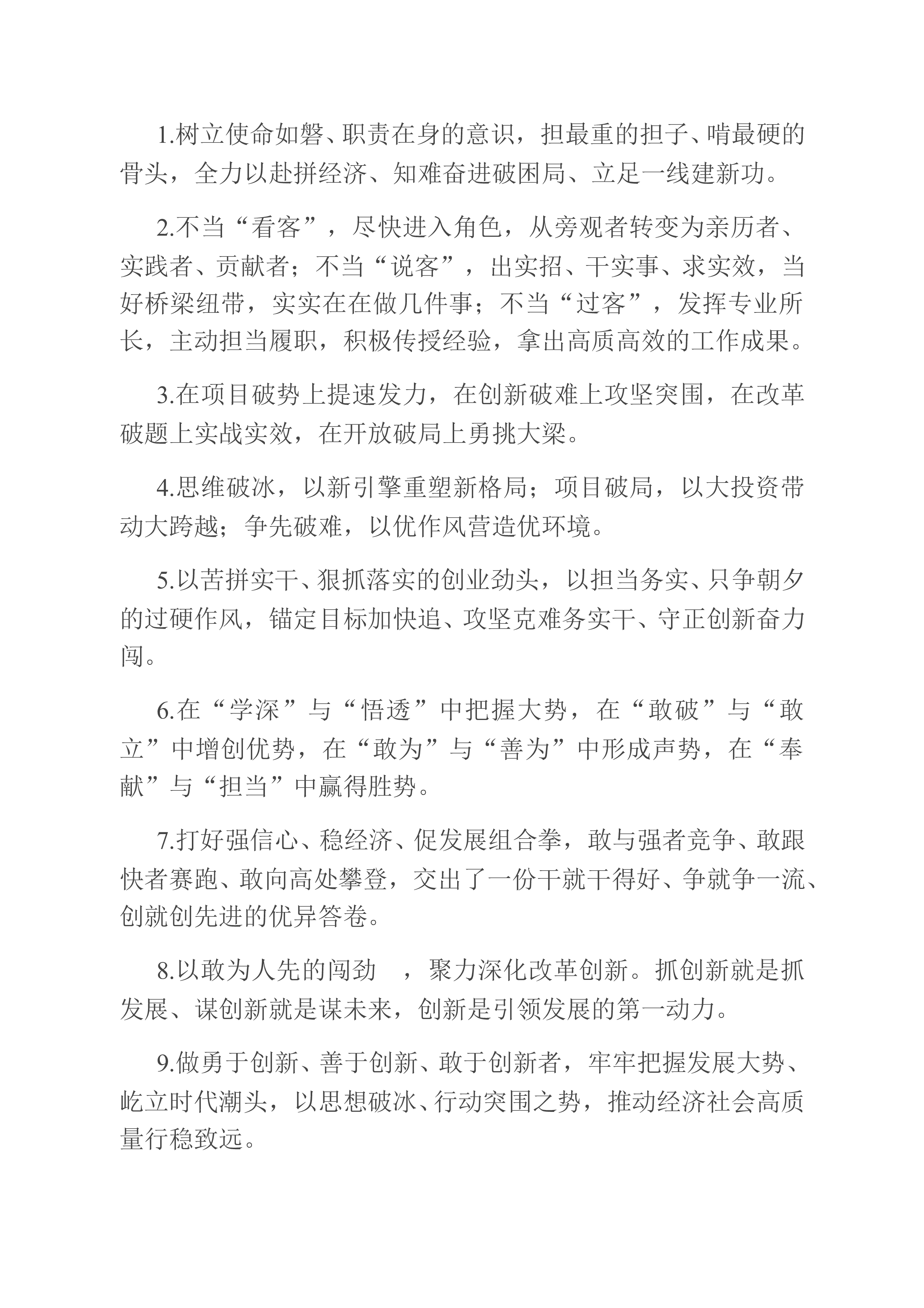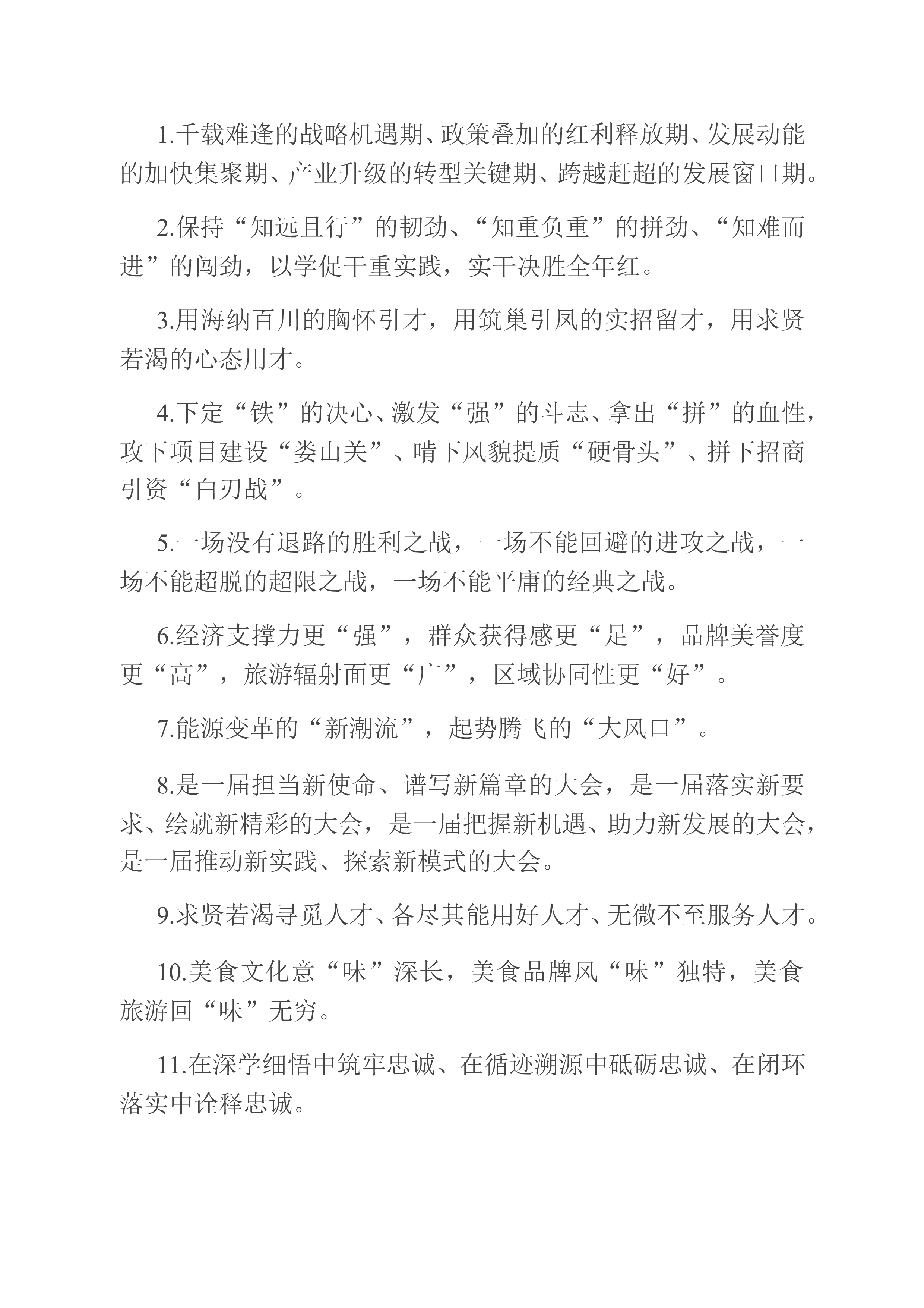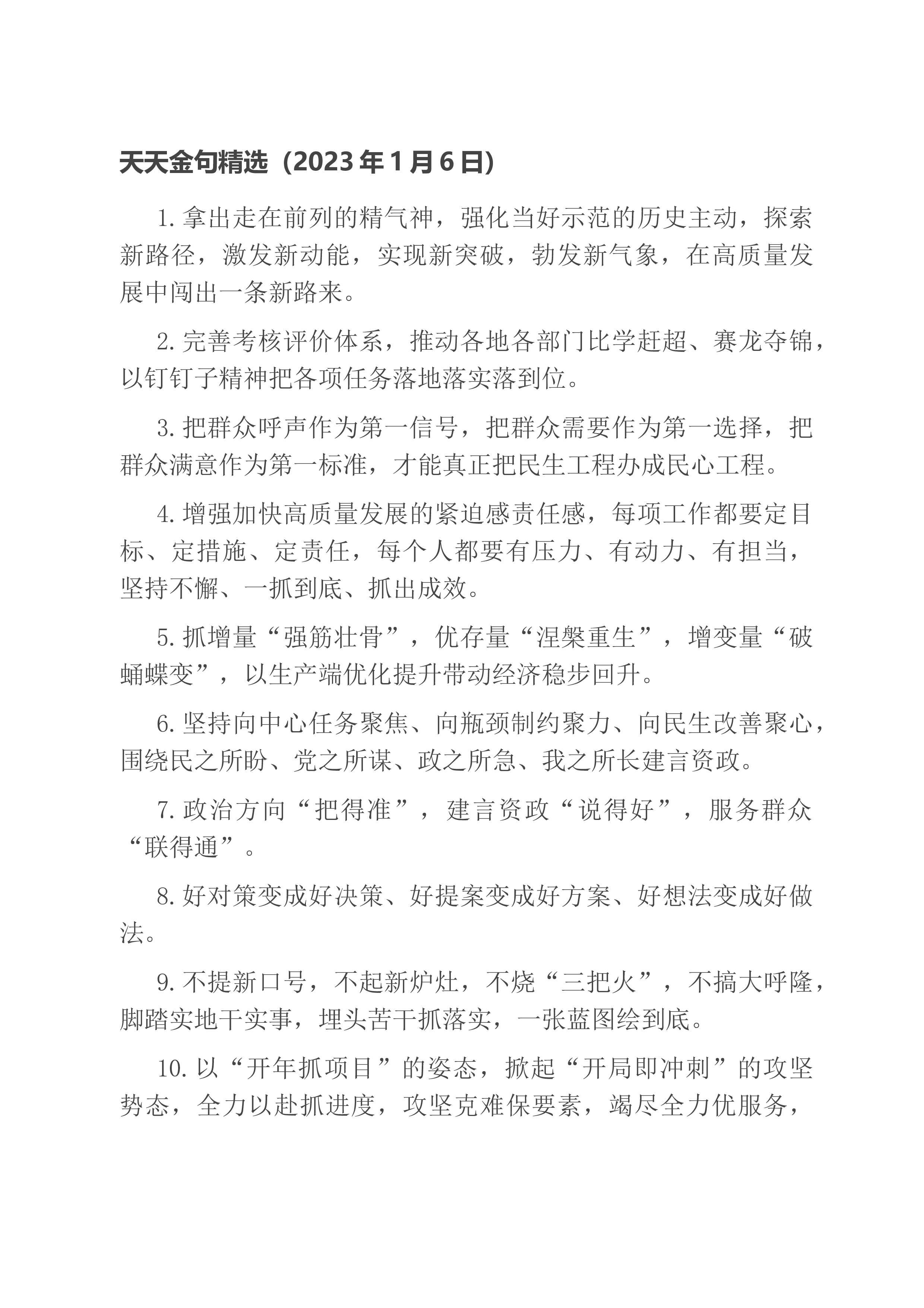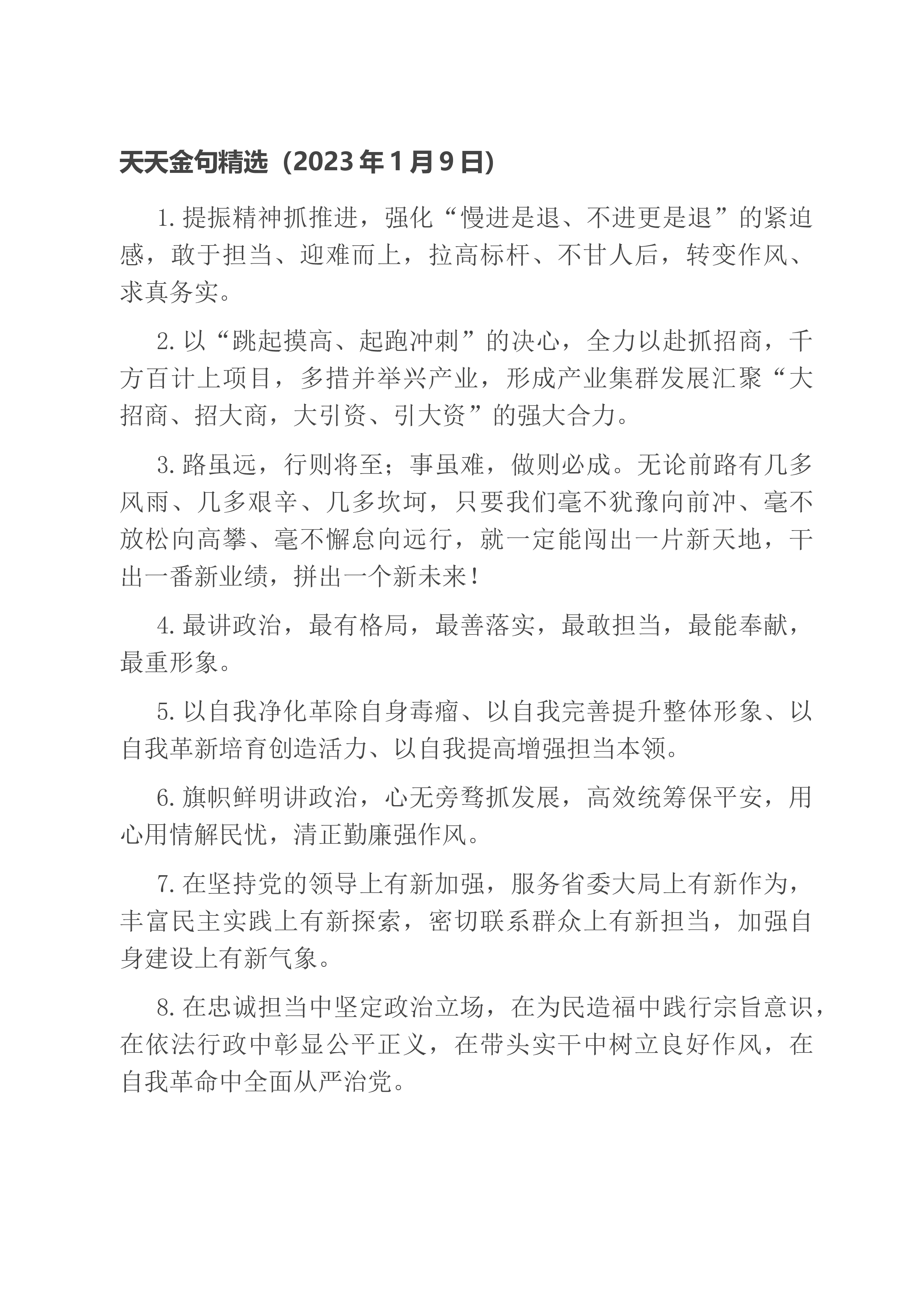 天天金句精选(2023年1月7日)1.让愿担当肯谋事的人有平台、让敢担当会干事的人有舞台、让能担当善成事的人有奖台。2.积极的心态、坚定的信心,是战胜困难的强大力量。有信心就有勇气,有信心就有力量,信心比黄金更重要。3.以“等不起”的紧迫感、“慢不得”的危机感、“坐不住”的责任感,知重负重,奋斗奋进,以冲锋的姿态发起总攻。4.练强指挥能力,练好战斗本领,练硬战斗作风,练就能战善战的精兵劲旅,确保召之即来、来之能战、战之必胜。5.“奋斗”,已成为新时代的精神标识,成为中国人的精神气质;“团结”,已成为中国发展进步的实践特色,成为辉煌成就的生动注脚。6.奋斗是时代前进的动力,奋斗是实现目标的阶梯。...