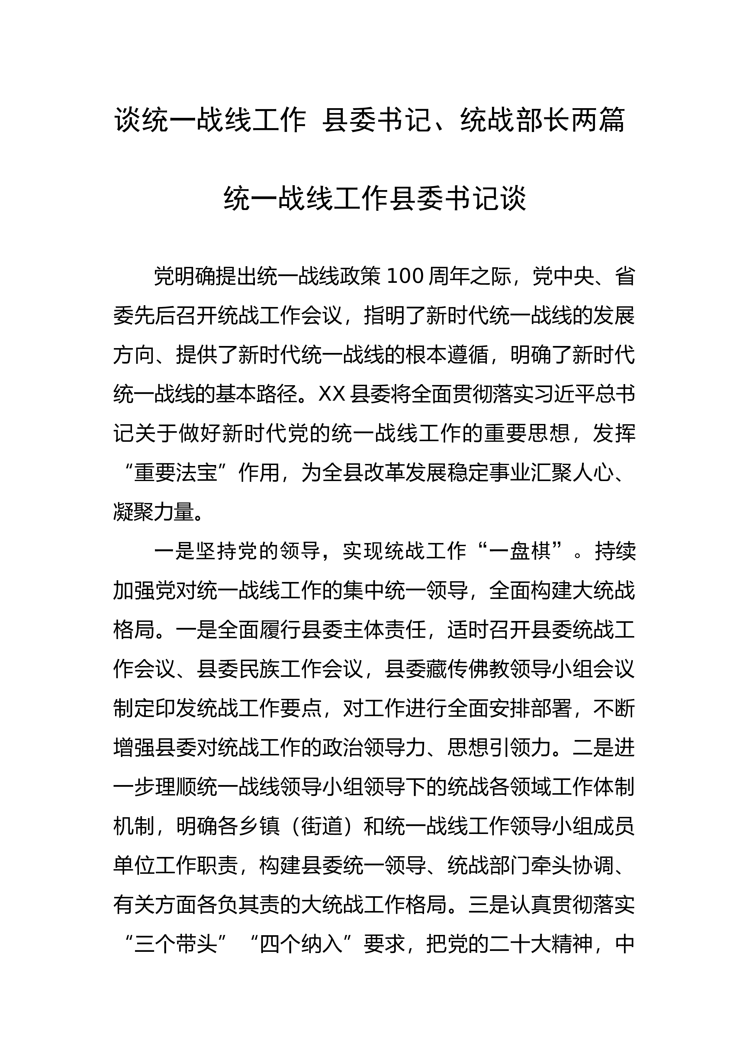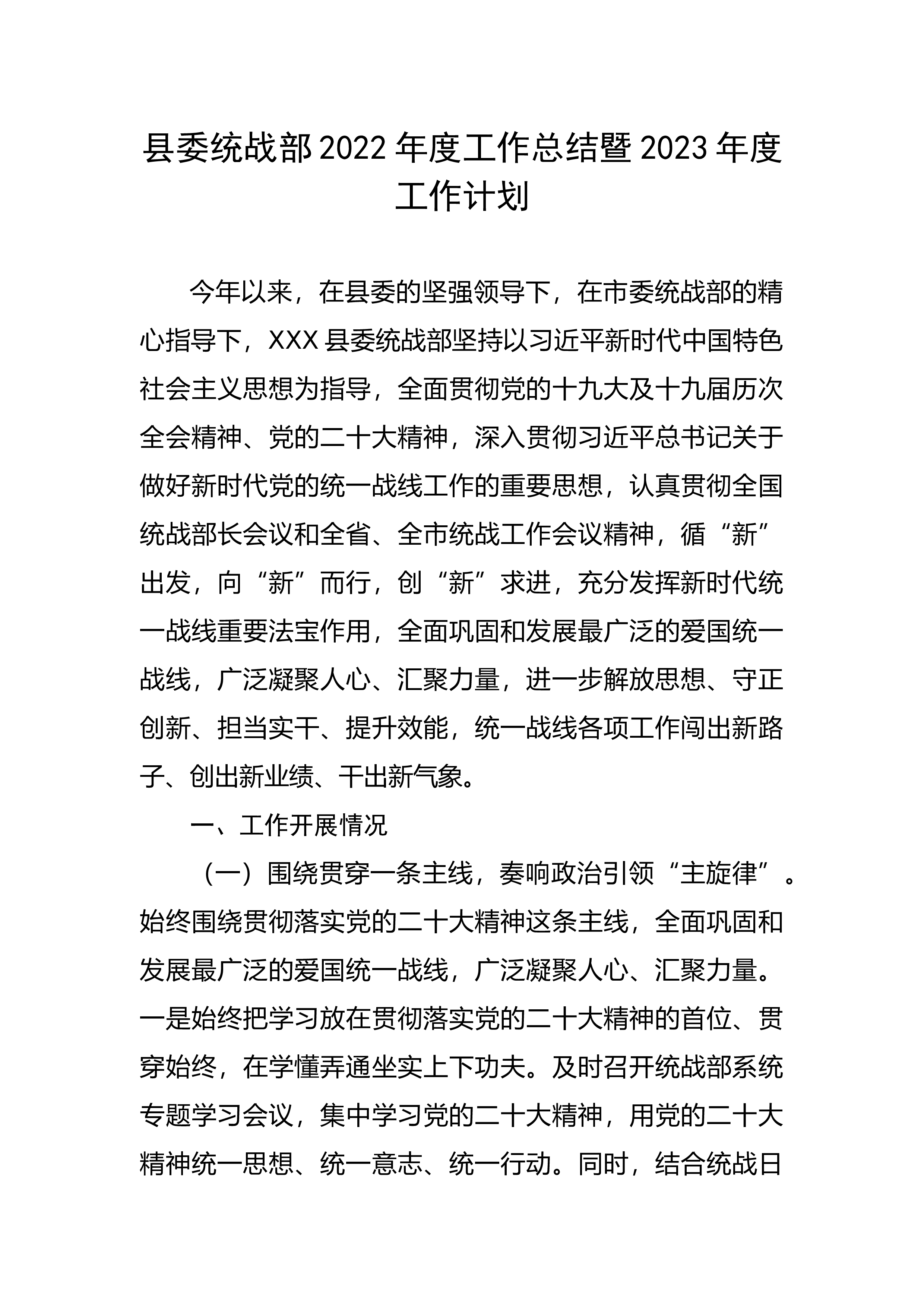 县委统战部2022年度工作总结暨2023年度工作计划今年以来,在县委的坚强领导下,在市委统战部的精心指导下,XXX县委统战部坚持以习近平新时代中国特色社会主义思想为指导,全面贯彻党的十九大及十九届历次全会精神、党的二十大精神,深入贯彻习近平总书记关于做好新时代党的统一战线工作的重要思想,认真贯彻全国统战部长会议和全省、全市统战工作会议精神,循“新”出发,向“新”而行,创“新”求进,充分发挥新时代统一战线重要法宝作用,全面巩固和发展最广泛的爱国统一战线,广泛凝聚人心、汇聚力量,进一步解放思想、守正创新、担当实干、提升效能,统一战线各项工作闯出新路子、创出新业绩、干出新气象。一、工作开展情况(一)...