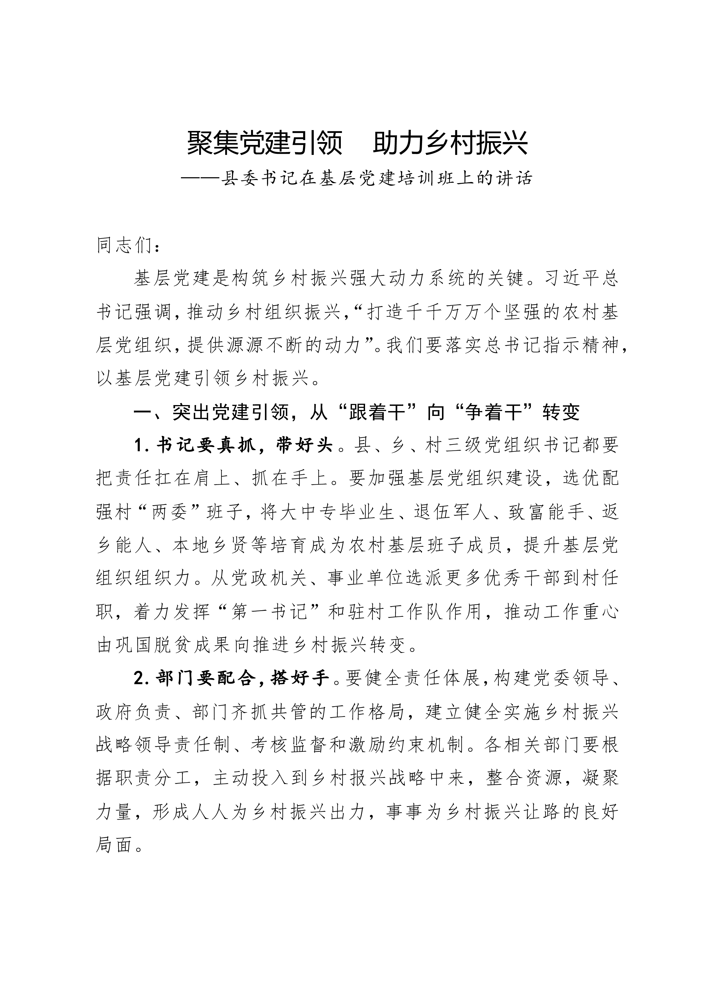 聚集党建引领助力乡村振兴——县委书记在基层党建培训班上的讲话同志们:基层党建是构筑乡村振兴强大动力系统的关键。习近平总书记强调,推动乡村组织振兴,“打造千千万万个坚强的农村基层党组织,提供源源不断的动力”。我们要落实总书记指示精神,以基层党建引领乡村振兴。一、突出党建引领,从“跟着干”向“争着干”转变1.书记要真抓,带好头。县、乡、村三级党组织书记都要把责任扛在肩上、抓在手上。要加强基层党组织建设,选优配强村“两委”班子,将大中专毕业生、