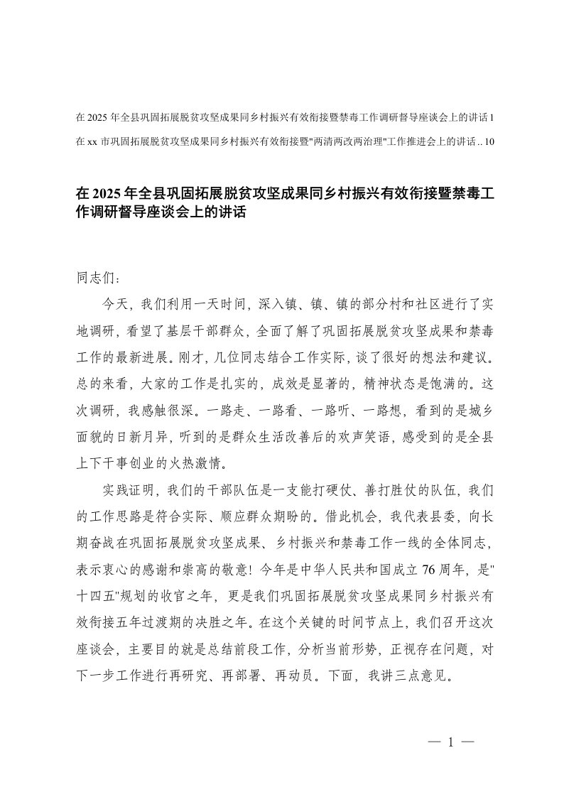 成果同乡村振兴有效衔接暨禁毒工作调研督导两清两改两治理座谈会上的讲话