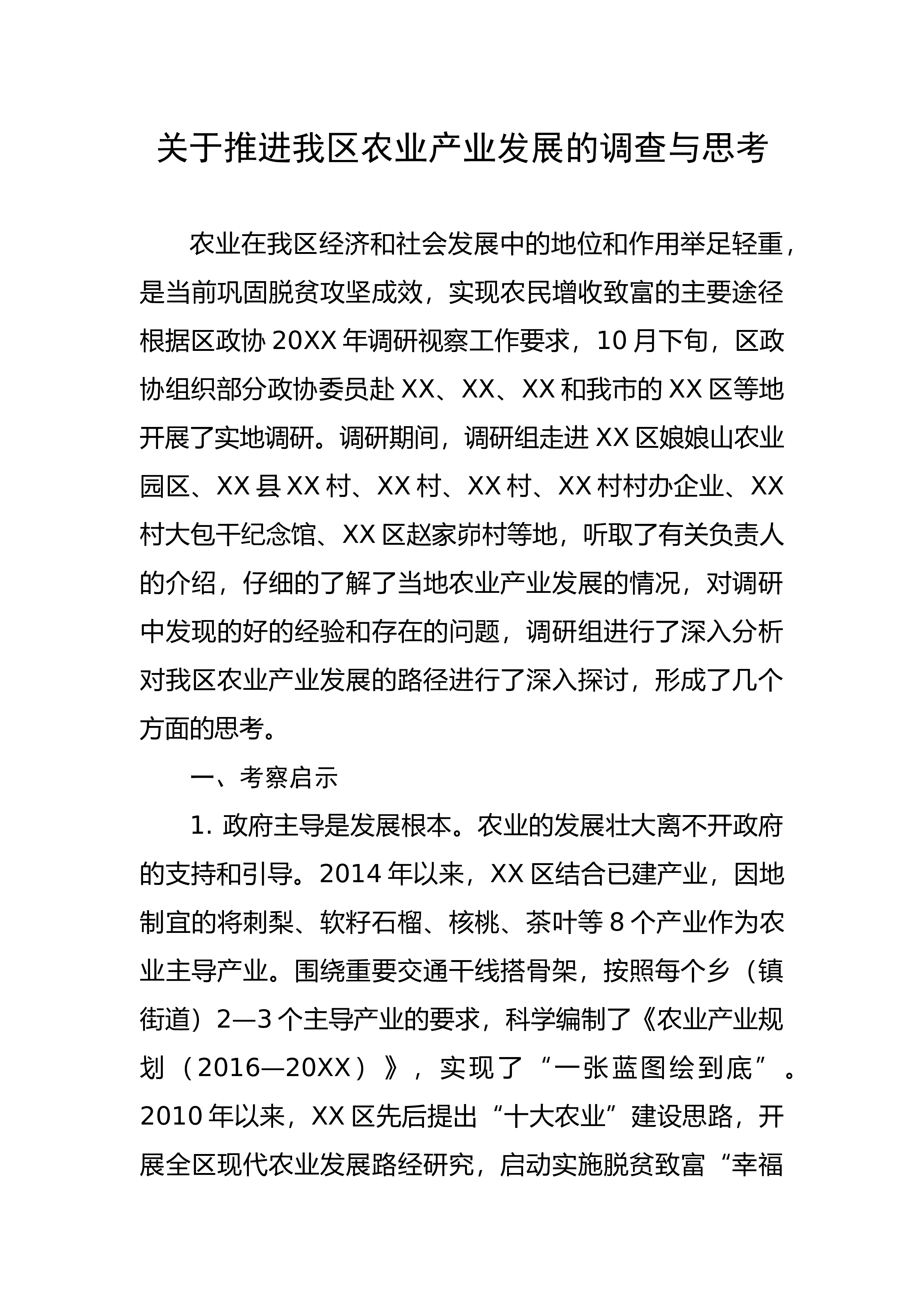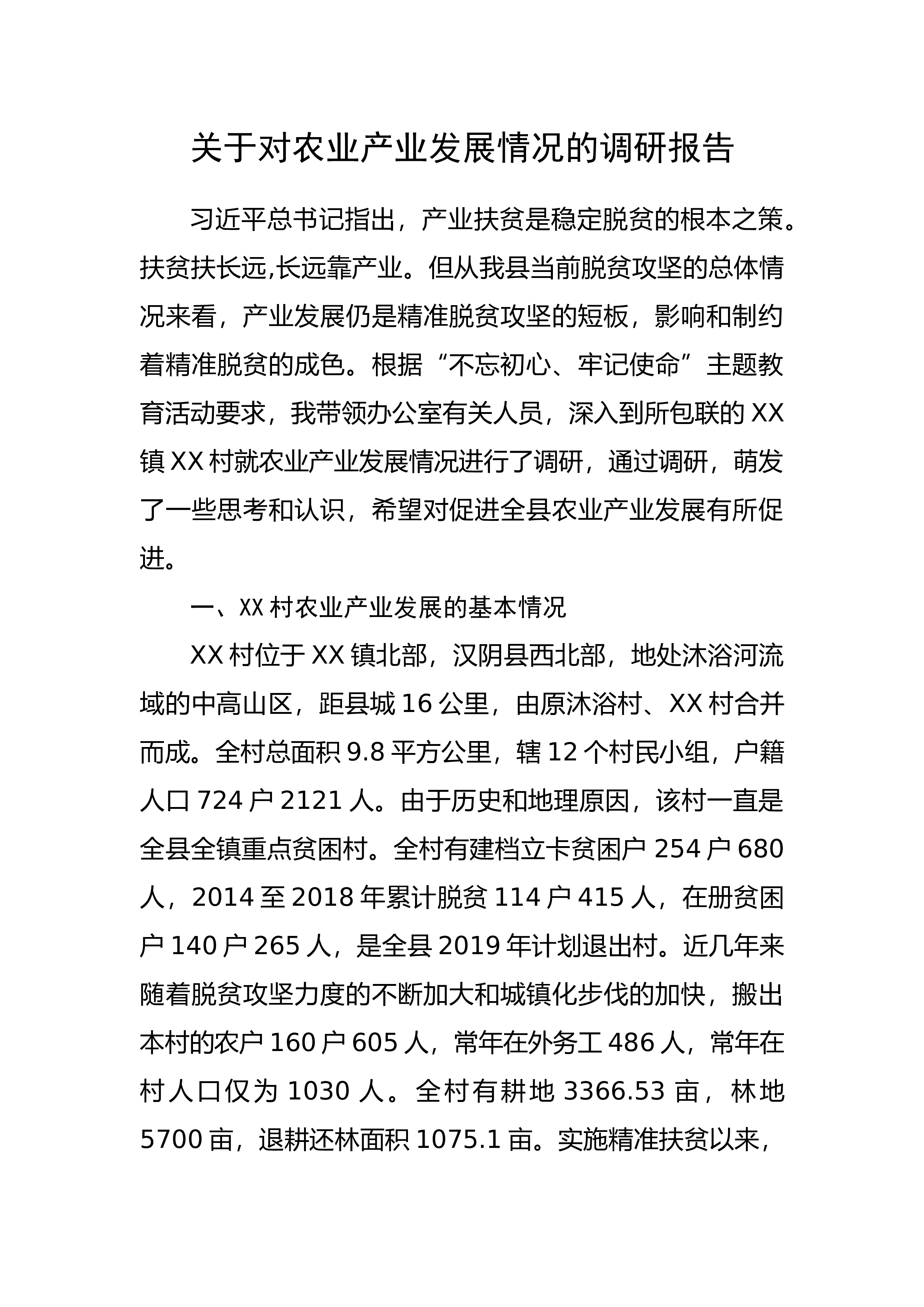 关于对农业产业发展情况的调研报告 习近平总书记指出,产业扶贫是稳定脱贫的根本之策。扶贫扶长远,长远靠产业。但从我县当前脱贫攻坚的总体情况来看,产业发展仍是精准脱贫攻坚的短板,影响和制约着精准脱贫的成色。根据“不忘初心、牢记使命”主T教育活动要求,我带领办公室有关人员,深入到所包联的XX镇XX村就农业产业发展情况进行了调研,通过调研,萌发了一些思考和认识,希望对促进全县农业产业发展有所促进。一、XX村农业产业发展的基本情况XX村位于XX镇北部,汉阴县西北部,地处沐浴河流域的中高山区,距县城16公里,由原沐浴村、XX村合并而成。全村总面积9.8平方公里,辖12个村民小组,户籍人口724户2121人...