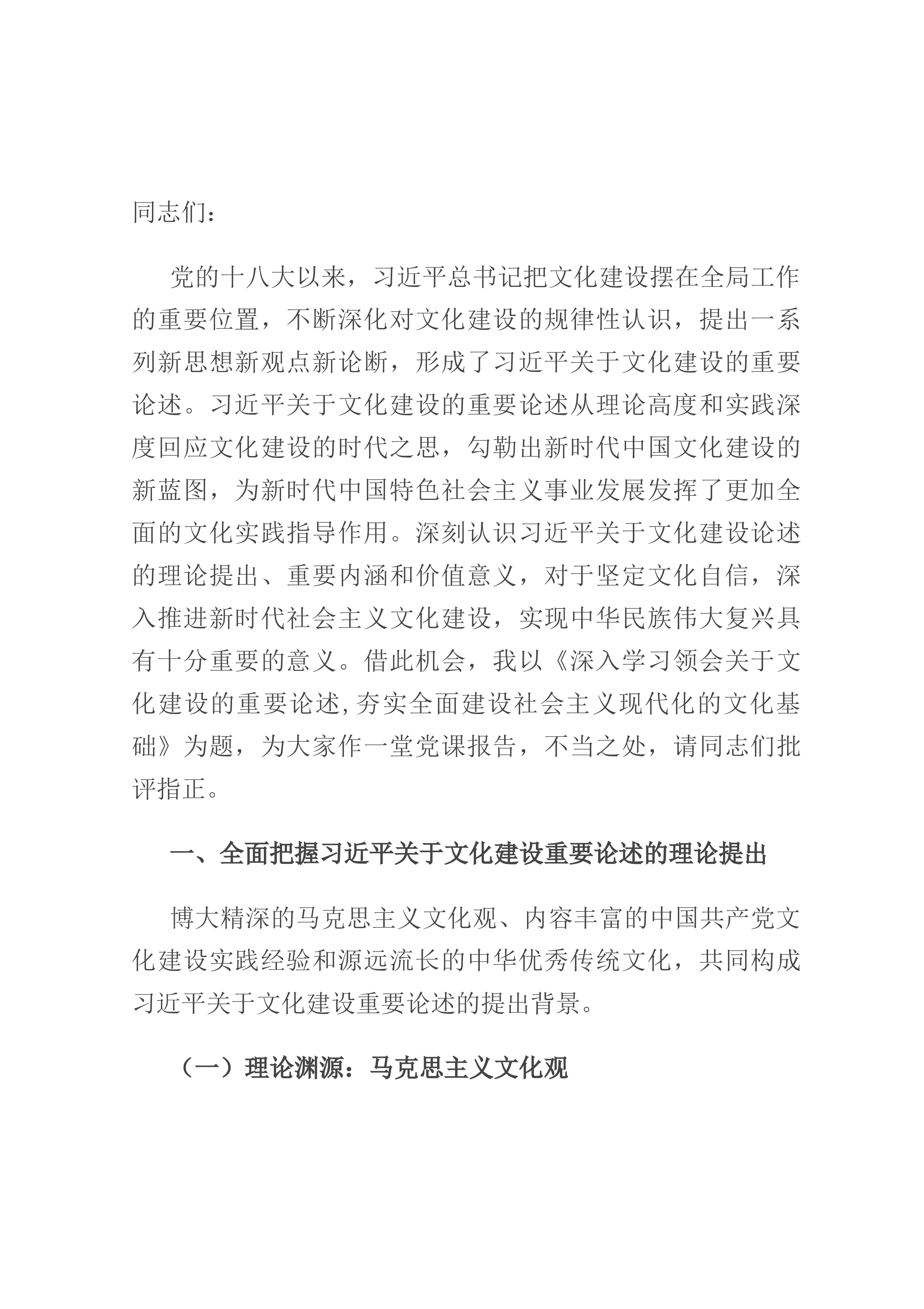 同志们:党的十八大以来,习近平总书记把文化建设摆在全局工作的重要位置,不断深化对文化建设的规律性认识,提出一系列新思想新观点新论断,形成了习近平关于文化建设的重要论述。习近平关于文化建设的重要论述从理论高度和实践深度回应文化建设的时代之思,勾勒出新时代中国文化建设的新蓝图,为新时代中国特色社会主义事业发展发挥了更加全面的文化实践指导作用。深刻认识习近平关于文化建设论述的理论提出、重要内涵和价值意义,对于坚定文化自信,深入推进新时代社会主义文化建设,实现中华民族伟大复兴具有十分重要的意义。借此机会,我以《深入学习领会关于文化建设的重要论述,夯实全面建设社会主义现代化的文化基础》为题,为大家作一堂...