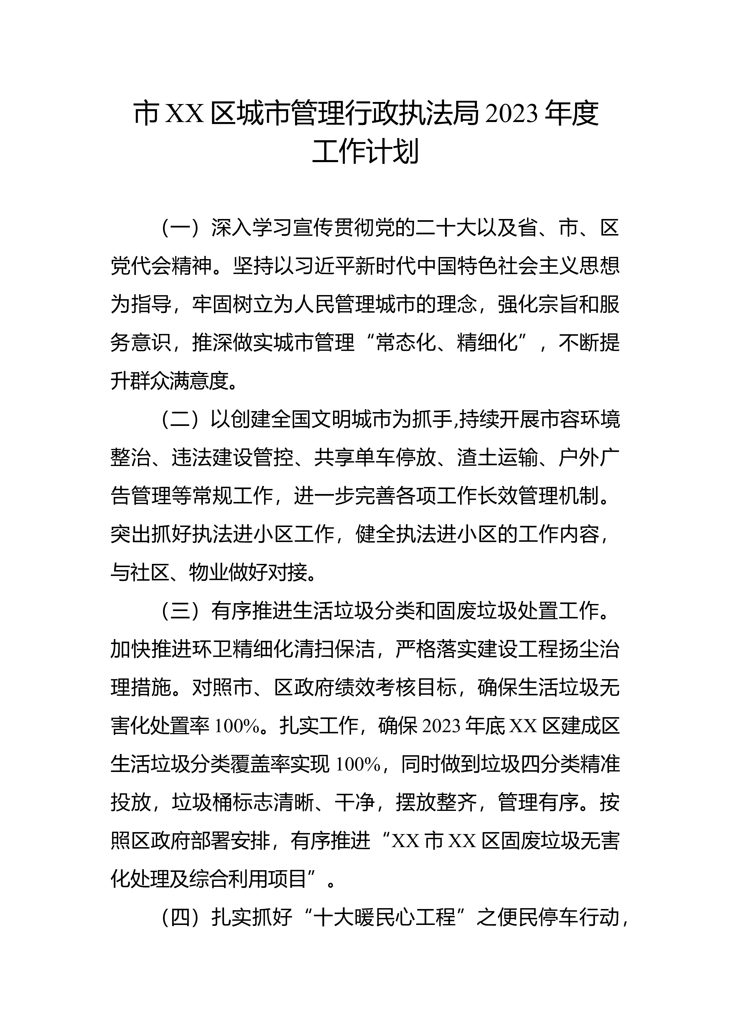 市XX区城市管理行政执法局2023年度工作计划(一)深入学习宣传贯彻党的二十大以及省、市、区党代会精神。坚持以习近平新时代中国特色社会主义思想为指导,牢固树立为人民管理城市的理念,强化宗旨和服务意识,推深做实城市管理“常态化、精细化”,不断提升群众满意度。(二)以创建全国文明城市为抓手,持续开展市容环境整治、违法建设管控、共享单车停放、渣土运输、户外广告管理等常规工作,进一步完善各项工作长效管理机制。突出抓好执法进小区工作,健全执法进小区的工作内容,与社区、物业做好对接。(三)有序推进生活垃圾分类和固废垃圾处置工作。加快推进环卫精细化清扫保洁,严格落实建设工程扬尘治理措施。对照市、区政府绩效考...