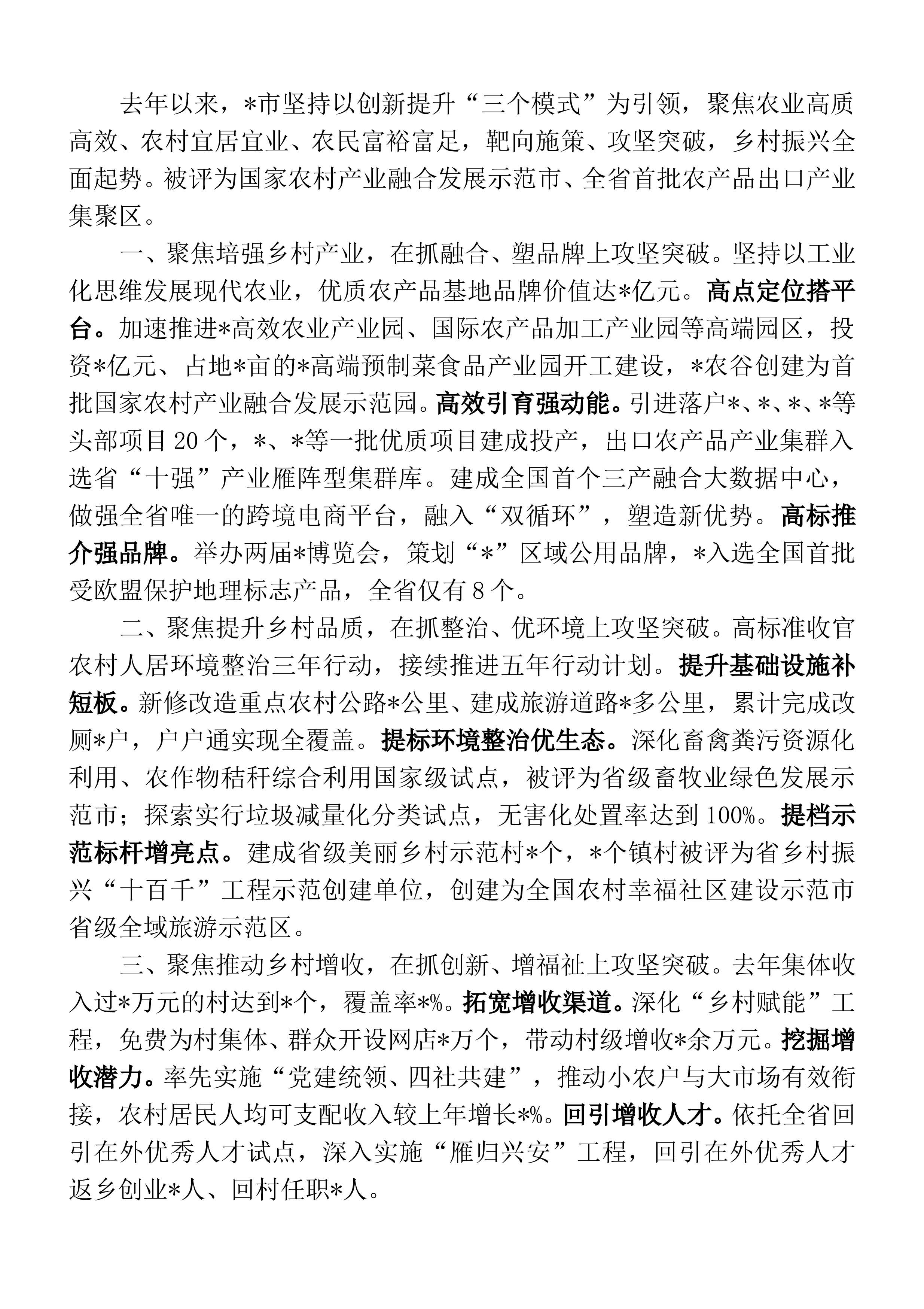 近年来,*县深入贯彻落实习近平总书记重要指示精神,坚持农业农村优先发展总方针,以实施乡村振兴战略为总抓手,在“建基地、搞加工、创品牌”中强力推进产业链、价值链、利益链“三链同构”,农业供给侧结构性改革取得明显成效,脱贫攻坚成果得到有效巩固,农村发展、农业增效、农民增收开创新局面,成功进入农业农村部《乡村振兴战略规划实施报告(2023年)》地方典型范例、为全省唯一,成为全省三个、全市唯一入选全国农业全产业链典型县建设名单的县,生猪种业、*种养循环园区分别入选国家现代农业产业园创建名单和管理体系,成为全国唯一拥有两个国家现代农业产业园的县。一、主要做法(一)深化机制保障,探索园区发展“路子”。坚持...