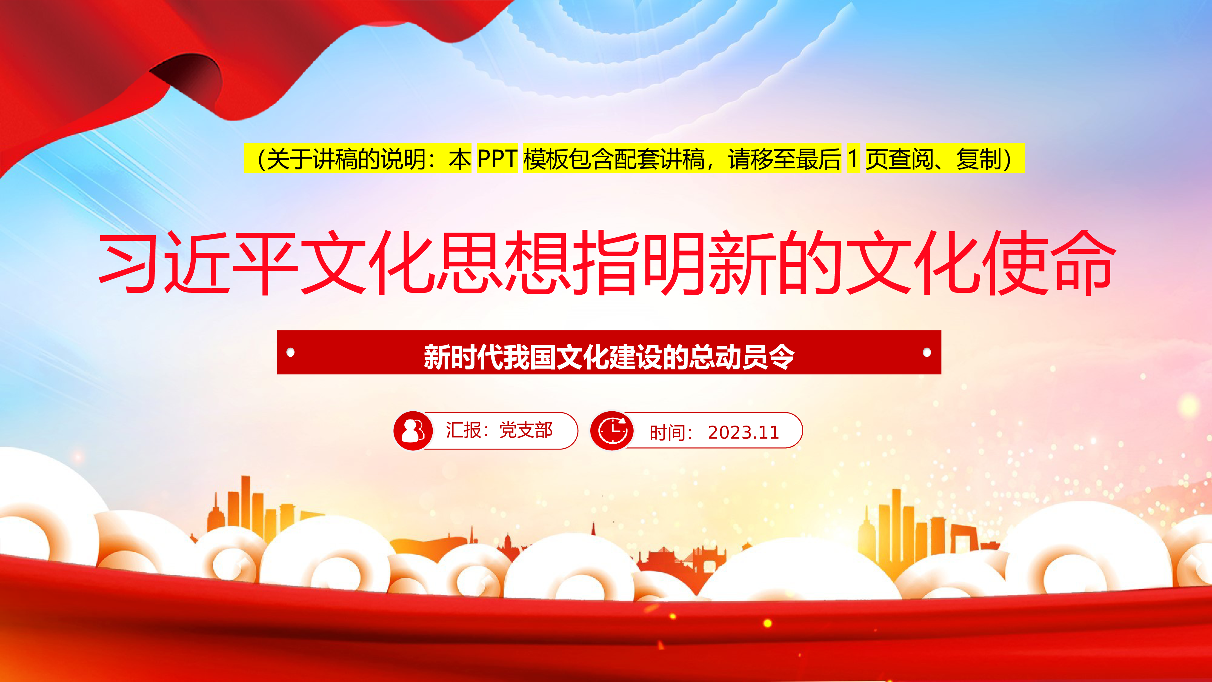 建设演讲:党支部2023.11深入学习贯彻习近平文化思想(关于讲稿的说明:本PPT模板包含配套讲稿,请移至最后1页查阅、复制)前言FOREWORD文化关乎国本国运。文化繁荣,民族才能兴盛,国家才能富强。
