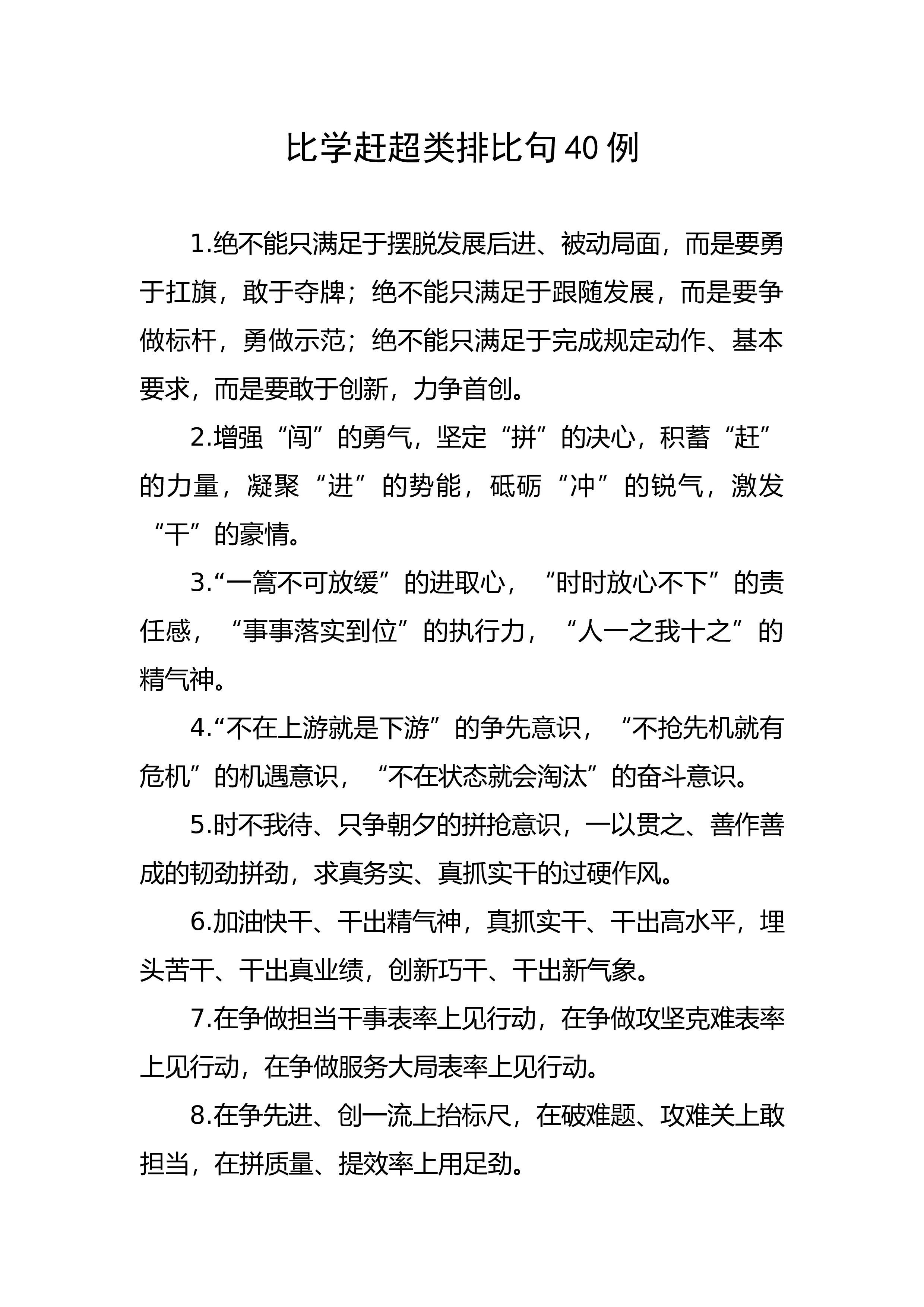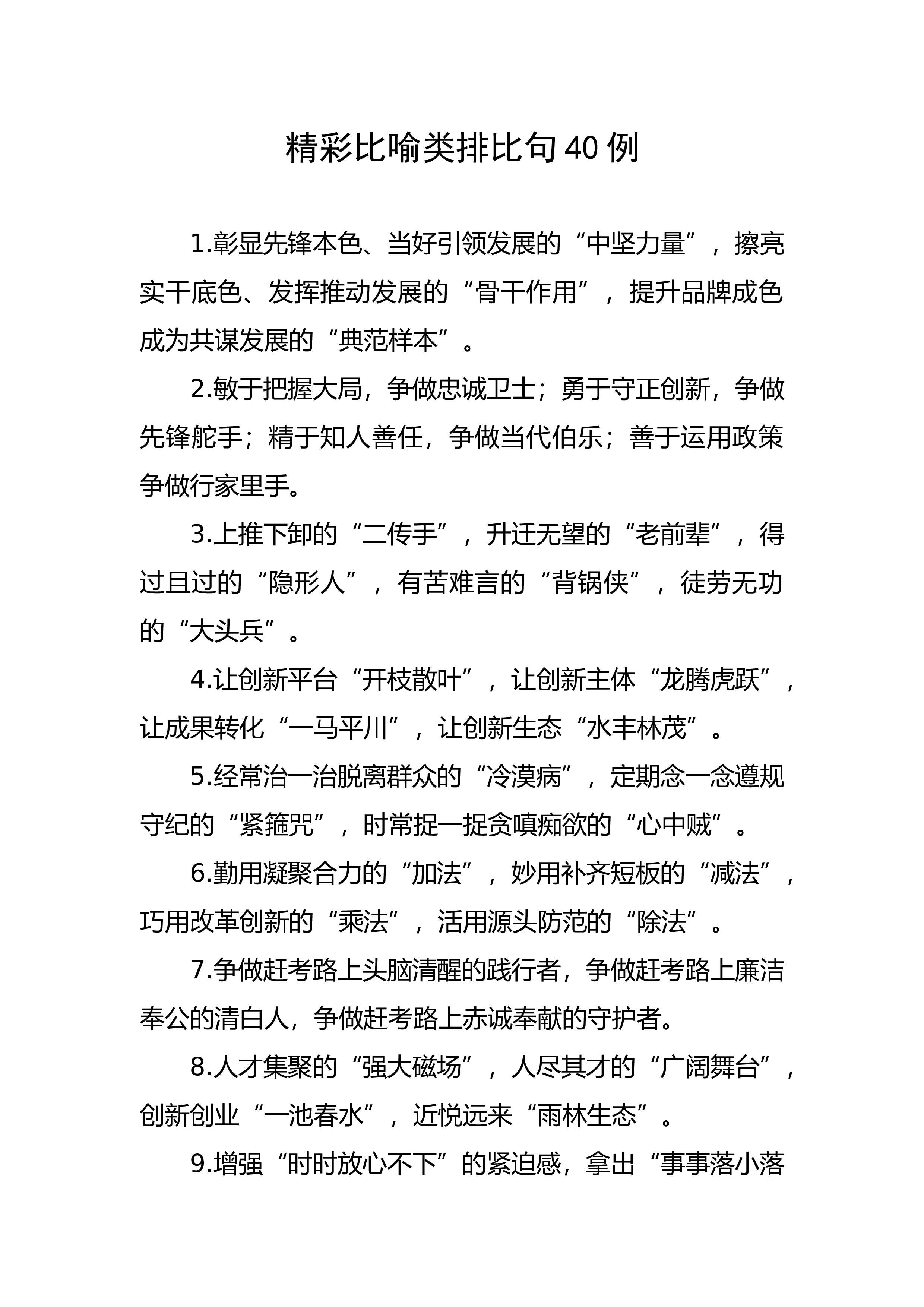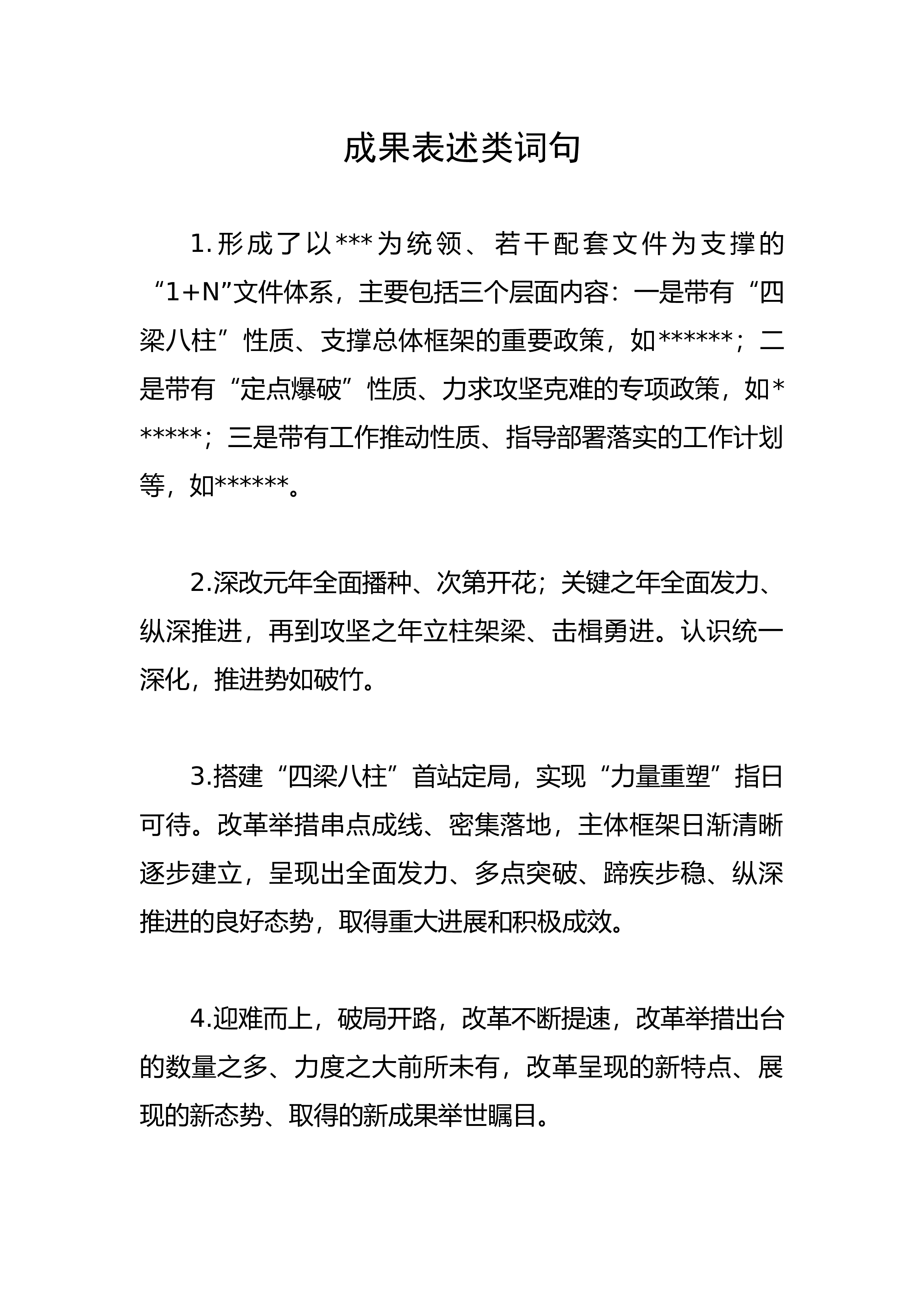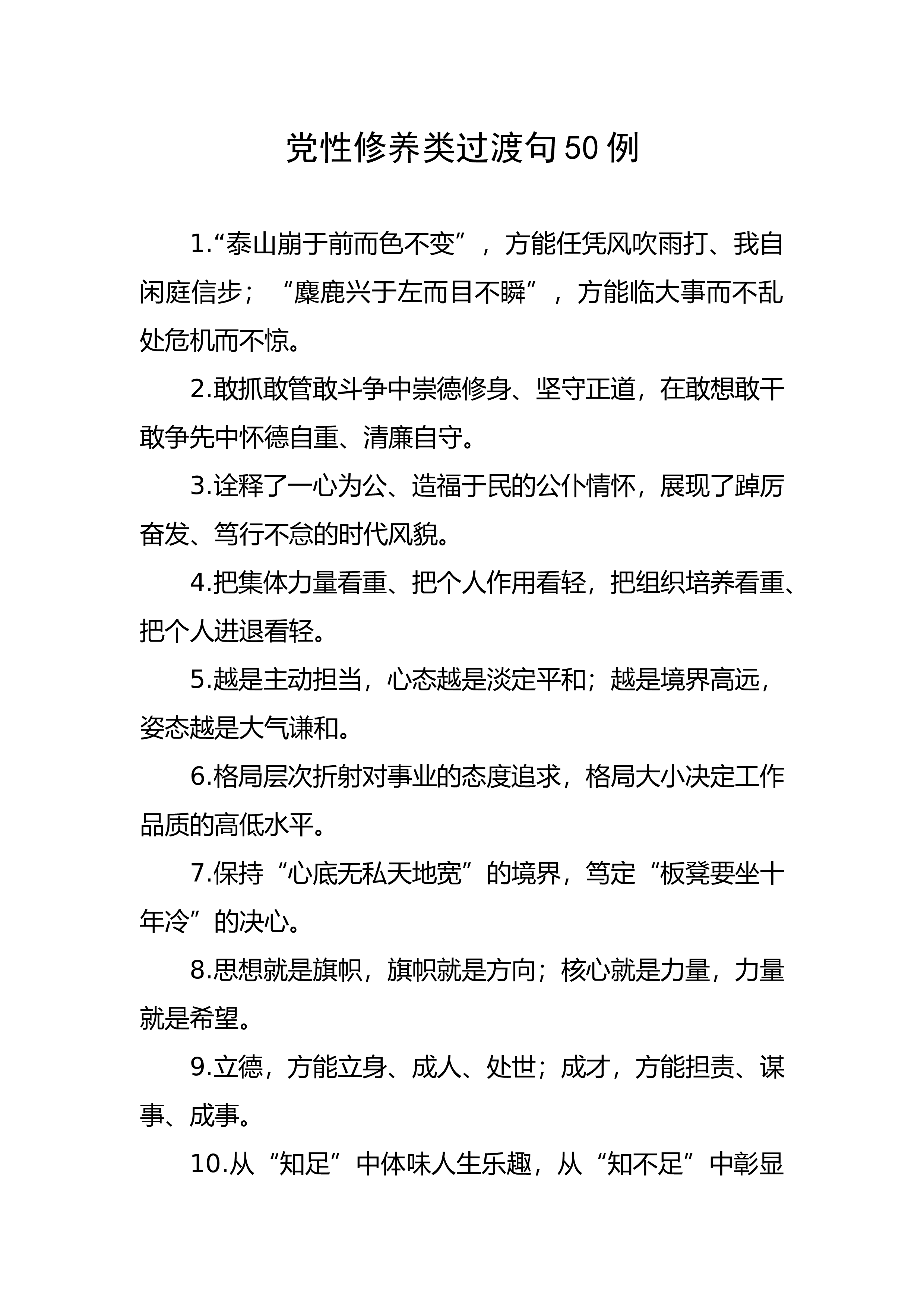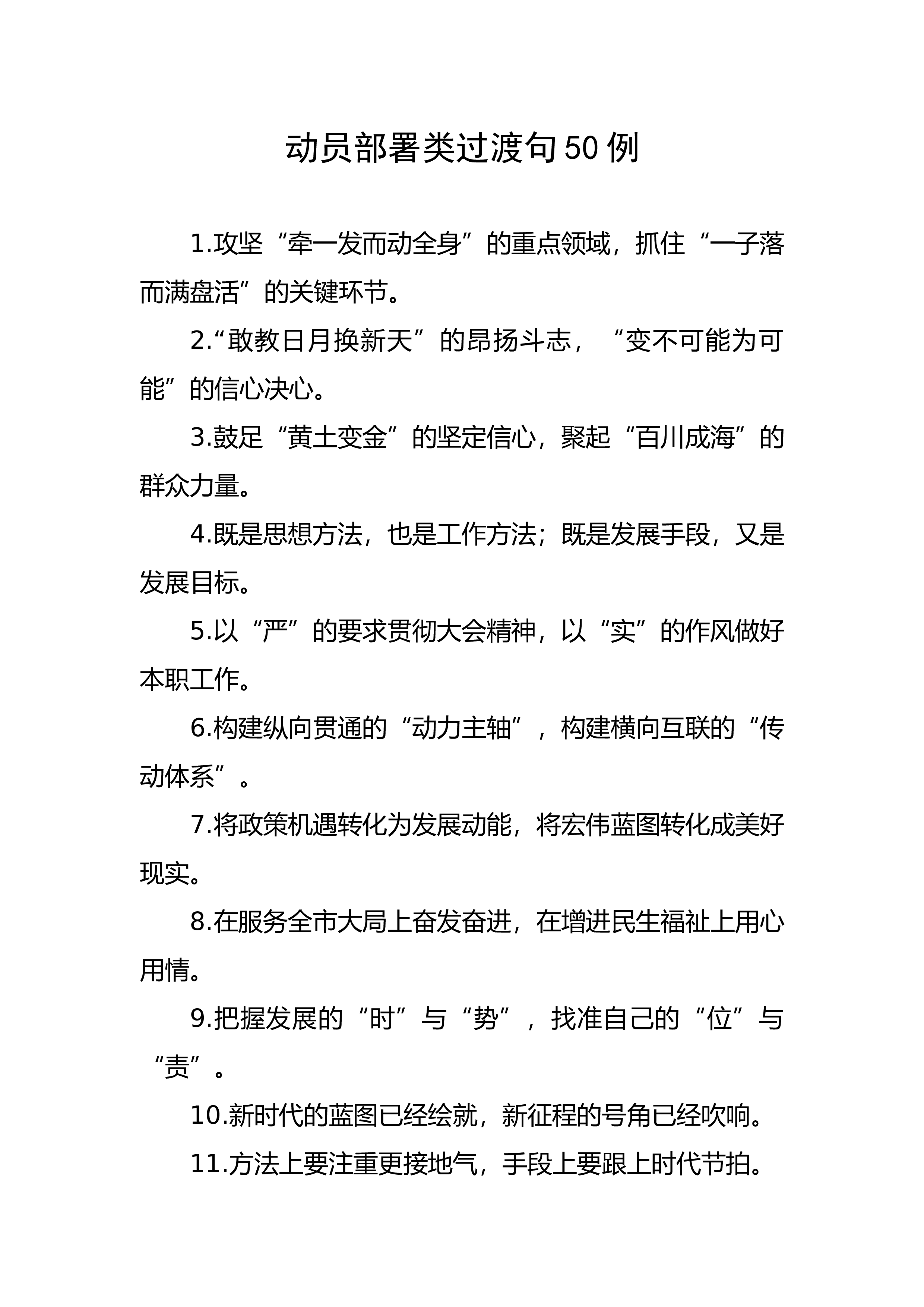 改革创新类过渡句50例1.回首来路,改革的车辙中刻着笃行的脚印;眺望远方,创新的征途上依然密布荆棘和难关。2.打造一批接地气、有潜质的示范典型,形成一批可复制、可借鉴的制度成果。3.肯定会出现这样那样的矛盾和阻力,肯定会遇到这样那样的困难和问题。4.把改革作为破解难题的第一选择,把创新作为推动发展的第一动力。5.把握重点,才能牵一发而动全身;找准方向,才能一子落而满盘活。6.全面深化改革的“排头兵”,开放经济体制的“试验田”。7.创新驱动是发展的新引擎,创新机制是发展的点火系。8.推进科技创新要讲源动力,招引重大项目要有爆发力。9.突破,就意味着可能失败;跨越,就意味着可能跌倒。10.在知不足...